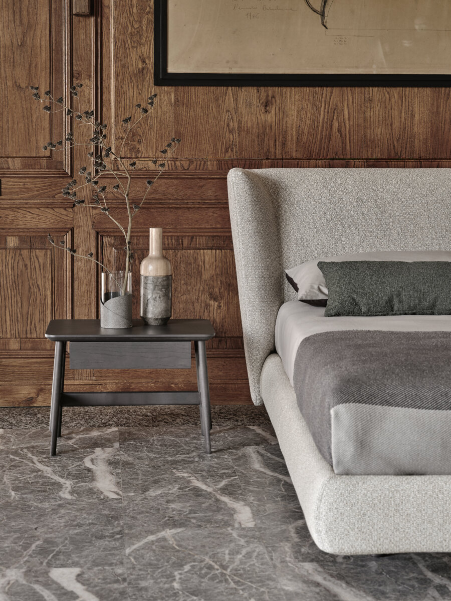 Ein Möbelstück mit nüchternem und zugleich erlesenem Stil, das die Konstruktion mit runden und geneigten Stangen neu interpretiert, die die gleichnamige Tischserie charakterisiert. Sowohl die Version mit Schublade als auch die mit Ablage zeichnen sich durch ein einzigartiges Detail an der Bodenauflage der Beine aus.