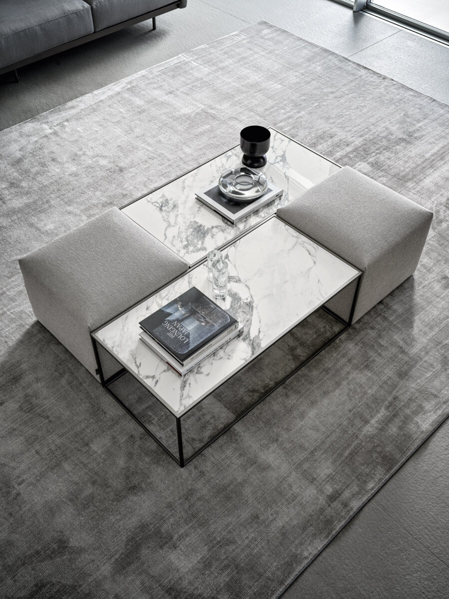 Als Teil der größeren Unit-Kollektion finden auch die Beistelltische ihre stilistische Signatur in der Abwechslung von Voll- und Hohlräumen. Die leichte und geometrische Struktur trägt eine rechteckige Platte aus feinem Marmor und schafft so einen geradlinigen und eleganten Beistelltisch, der zum Star in jedem Raum wird.