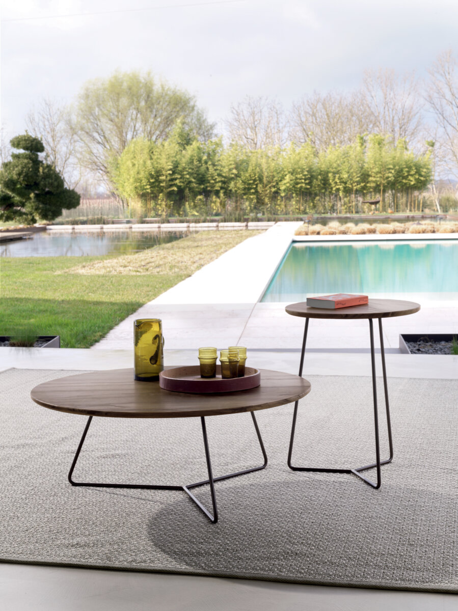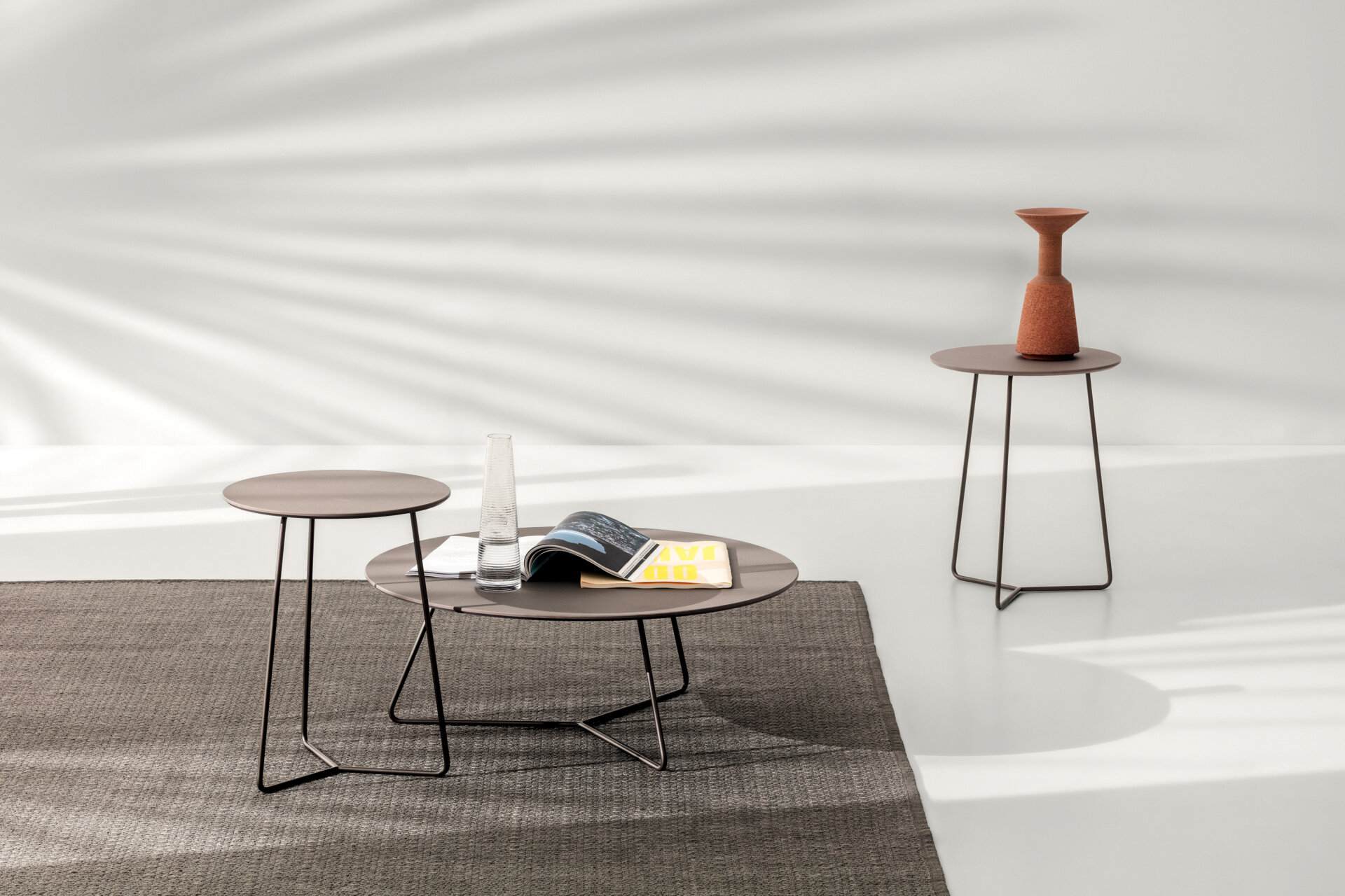 Die Kollektion Kevin, die aus der Feder von Edi und Paolo Ciani stammt, zeichnet sich durch ihr Gestell aus dünnem Rundstahl aus, auf der die runde oder rechteckige Platte ruht. Die Beistelltische, die schon in der Indoor-Version edel sind, werden neu aufgelegt speziell für den Outdoor-Bereich, mit neuen langlebigen und strapazierfähigen Materialien.