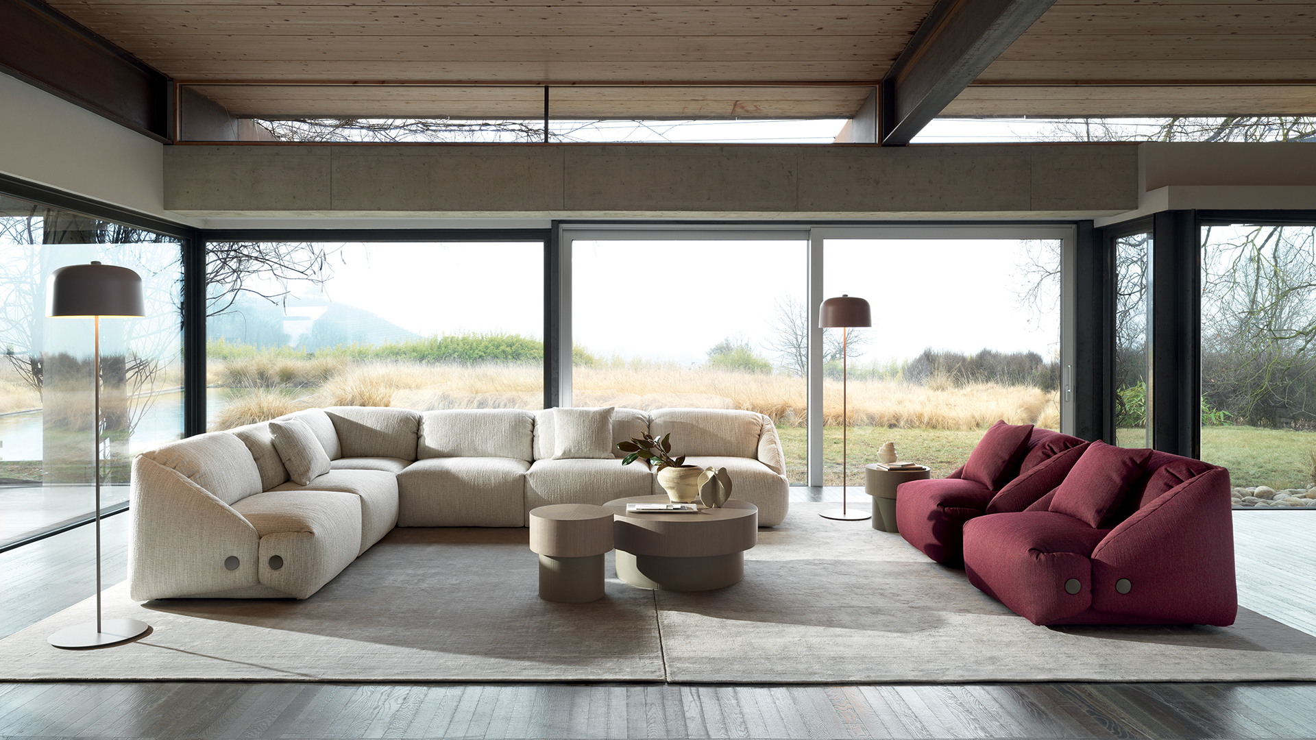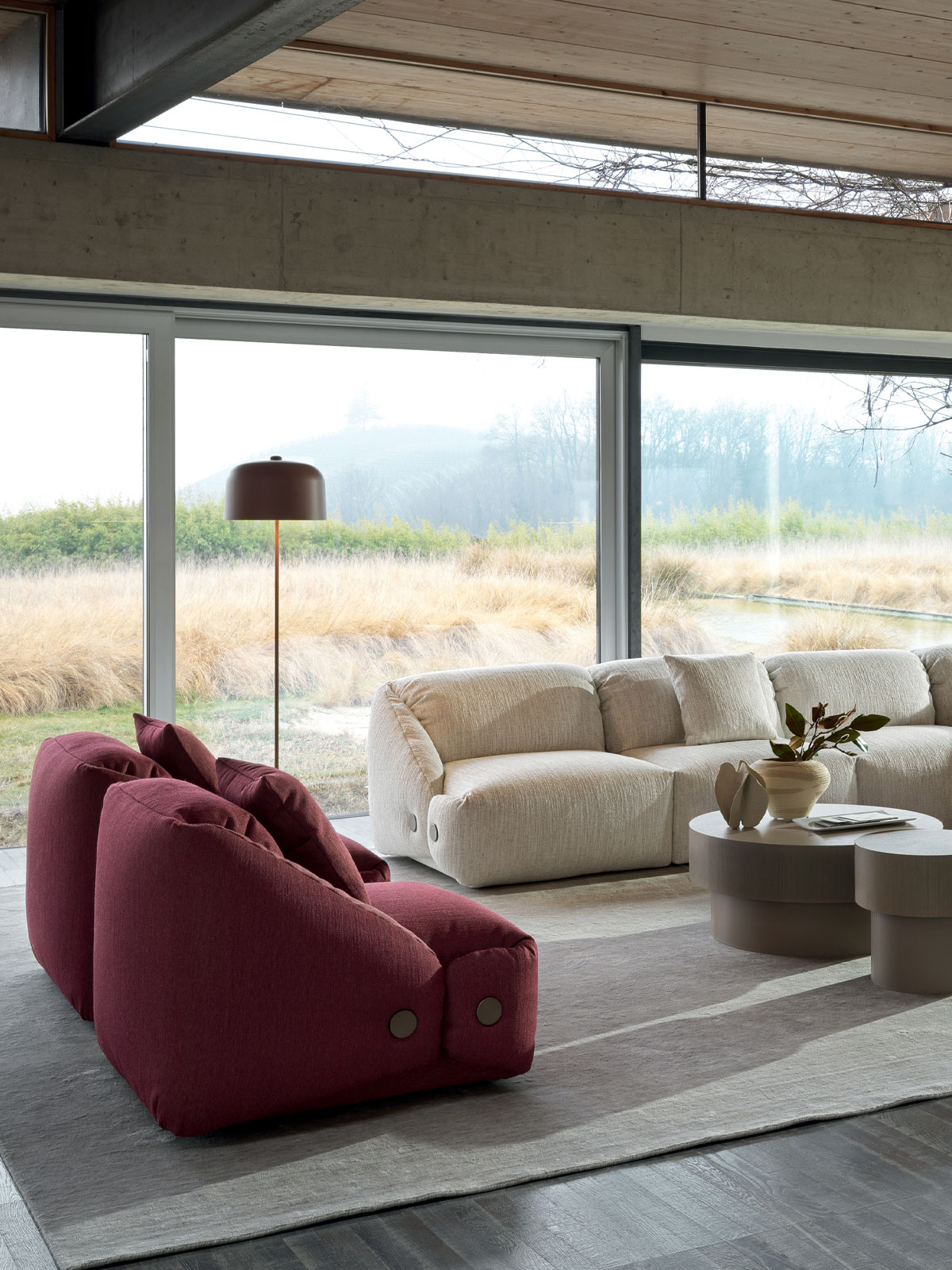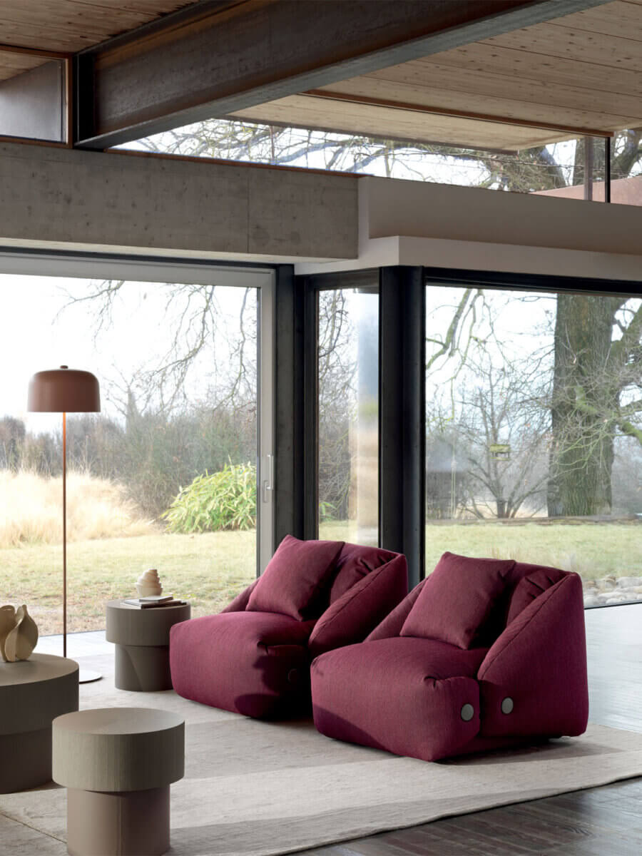 Wie das Sofa kombiniert auch der Sessel Melville von Patrick Norguet die kühnen Volumen eines Origami mit dem eleganten und bequemen Design einer maßgeschneiderten Jacke. Das stilistische Detail sind die umlaufenden Kanten der Rückenlehne und der Sitzfläche, die wie bei einem geknöpften Kragen gefaltet sind und die großzügigen gepolsterten Elemente in Position halten, wodurch ihr weiches und volles Aussehen noch verstärkt wird.