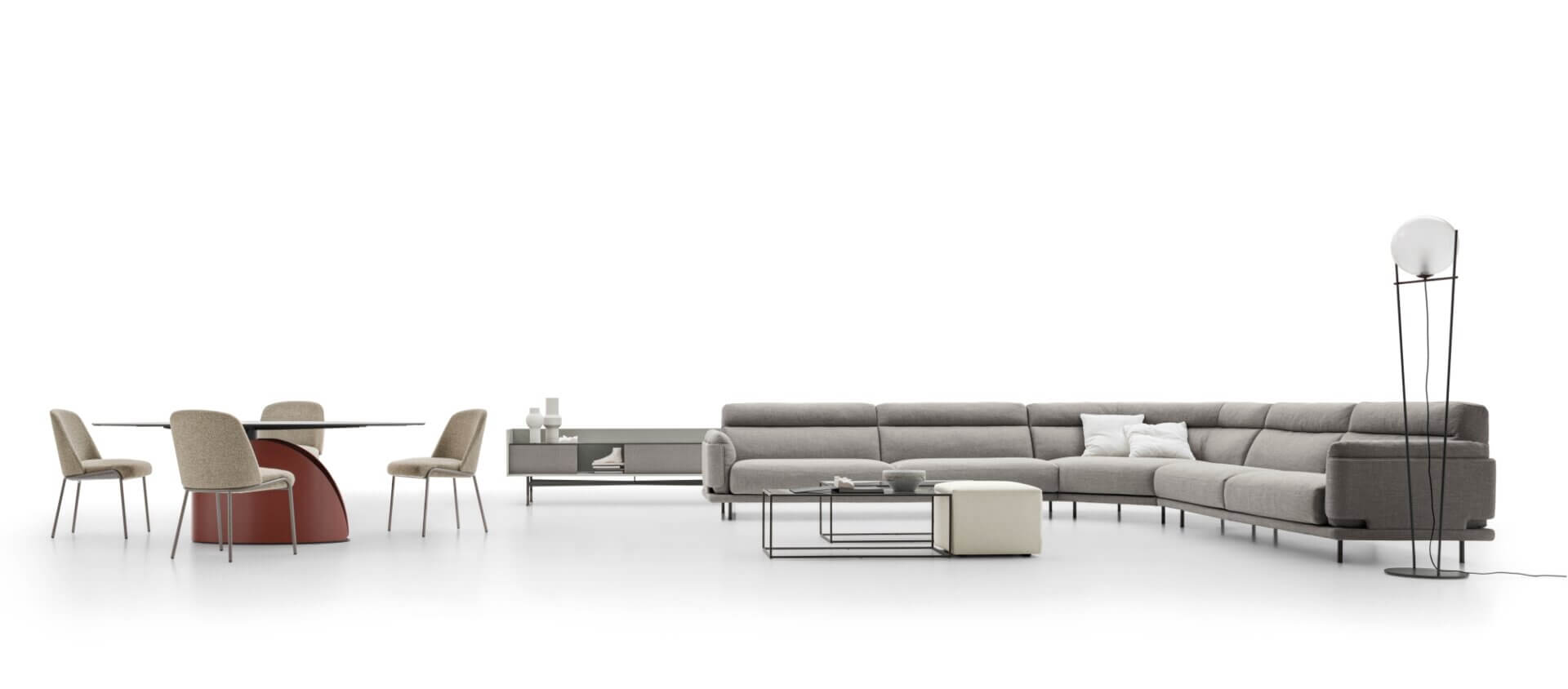 Skin legt mit einer Reihe von seitlich eingesetzten Kissen ein neues Sofakonzept fest. Die Seitenteile werden zu einem Accessoire und zur strukturellen Neugestaltung gesellt sich ein außergewöhnlich weicher und einhüllender Sitzkomfort.