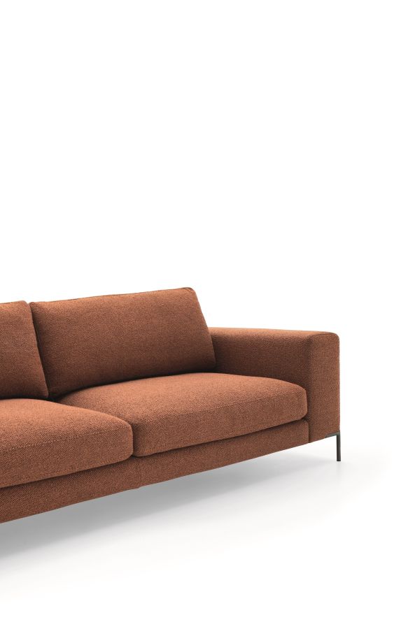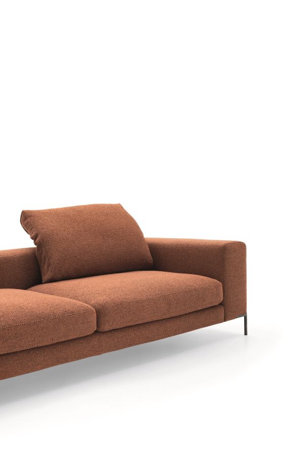 Ein aus Einz elsofa, Grundgestellen mit beweglichem Kissen und Beistelltischen bestehendes Modulsystem. Bei der Version als Einzelsofa erlaubt die Rückenlehne eine gegenüberliegende oder beidseitige Aufstellung in der Raummitte.