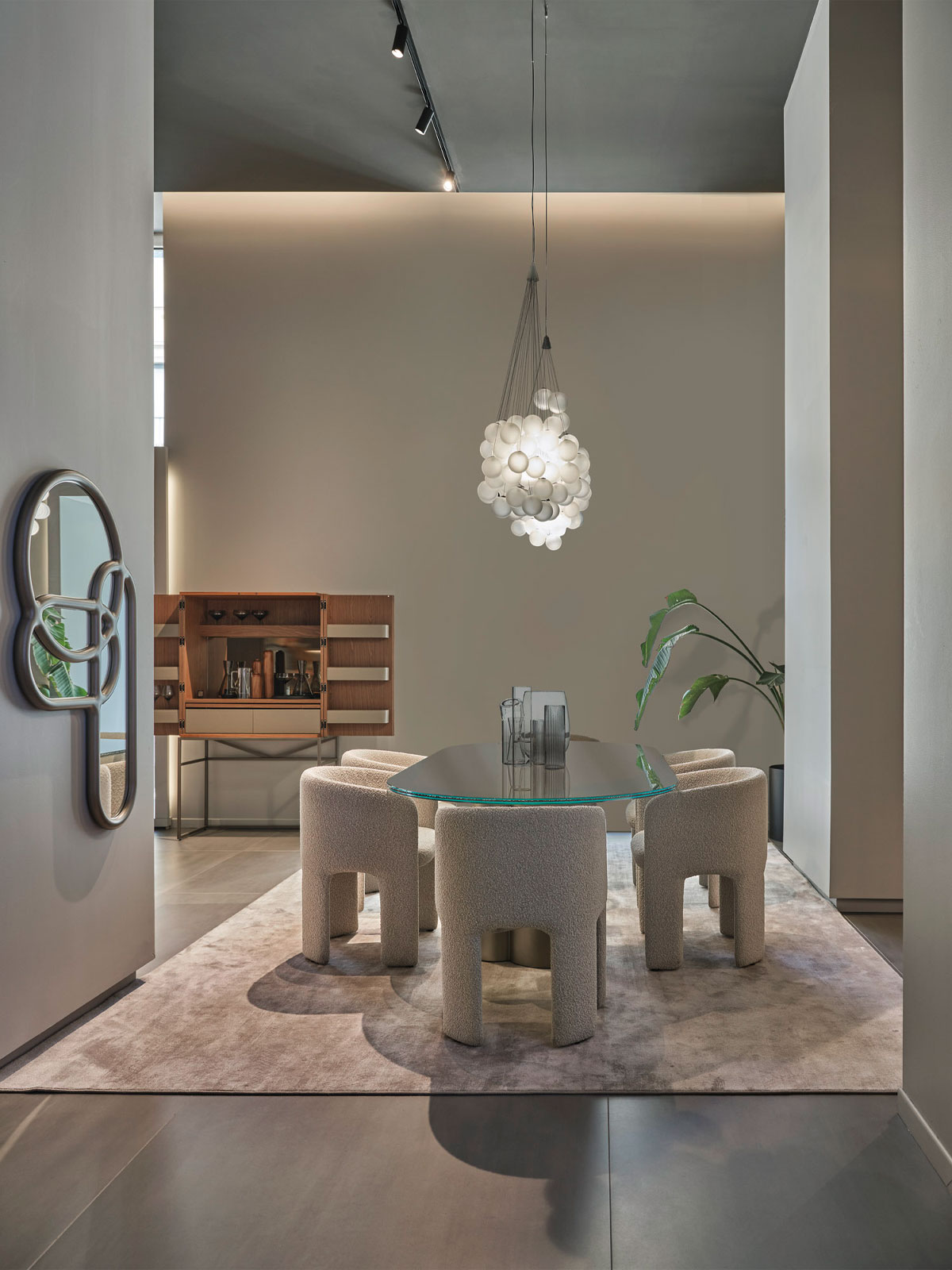 Kennzeichnend für alle Elemente der Kollektion Cali sind die massiven, vollständig gepolsterten und bezogenen Beine, die von den vier Armen der indischen Gottheit Kali, dem Symbol für Stärke und Macht, inspiriert sind. Durch ihren unverwechselbaren Charakter eignen sich die Stühle für die Einrichtung der speziellsten Umgebungen.