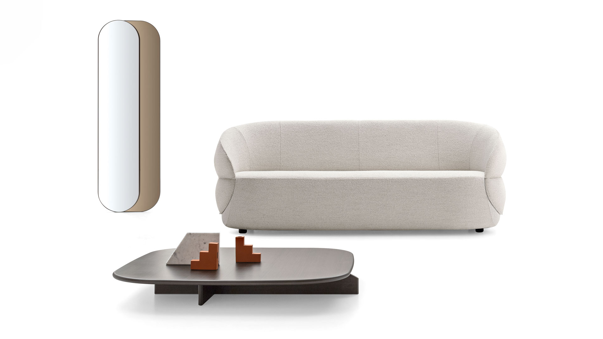 A design inspired by the typical appearance of beetles. The structure is divided into three parts and elegantly supported by narrow metal legs. The external lines are taut and well-defined, whereas the padded parts are soft and abundant.