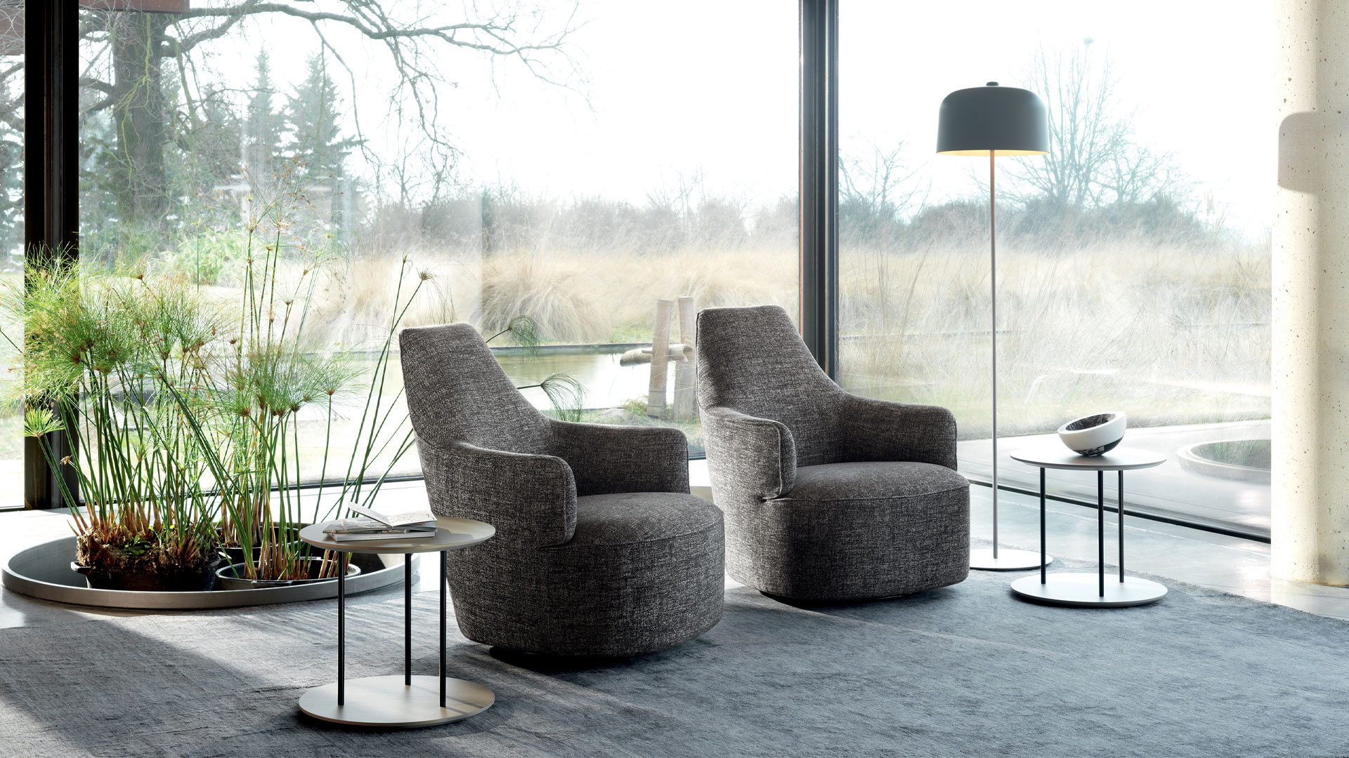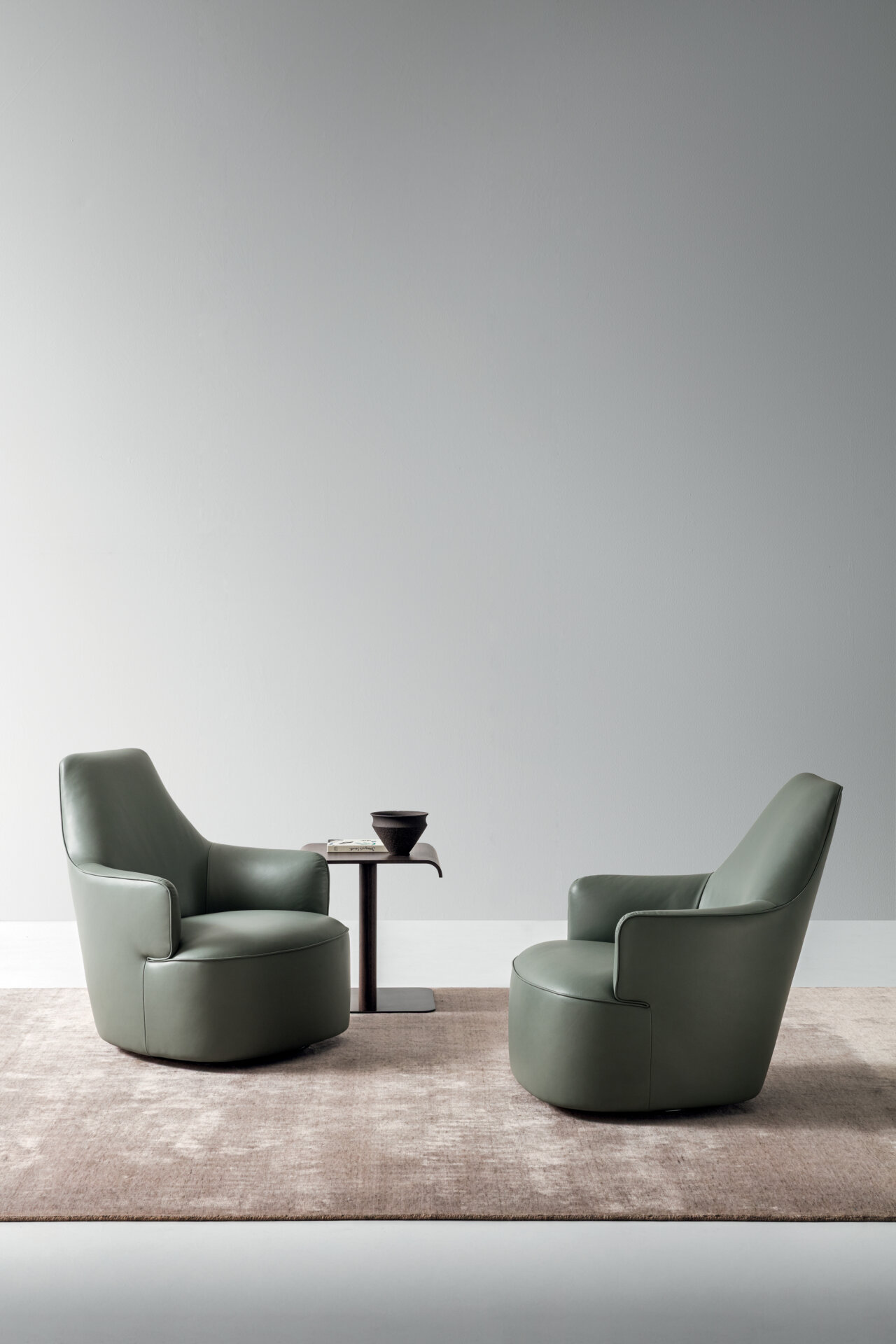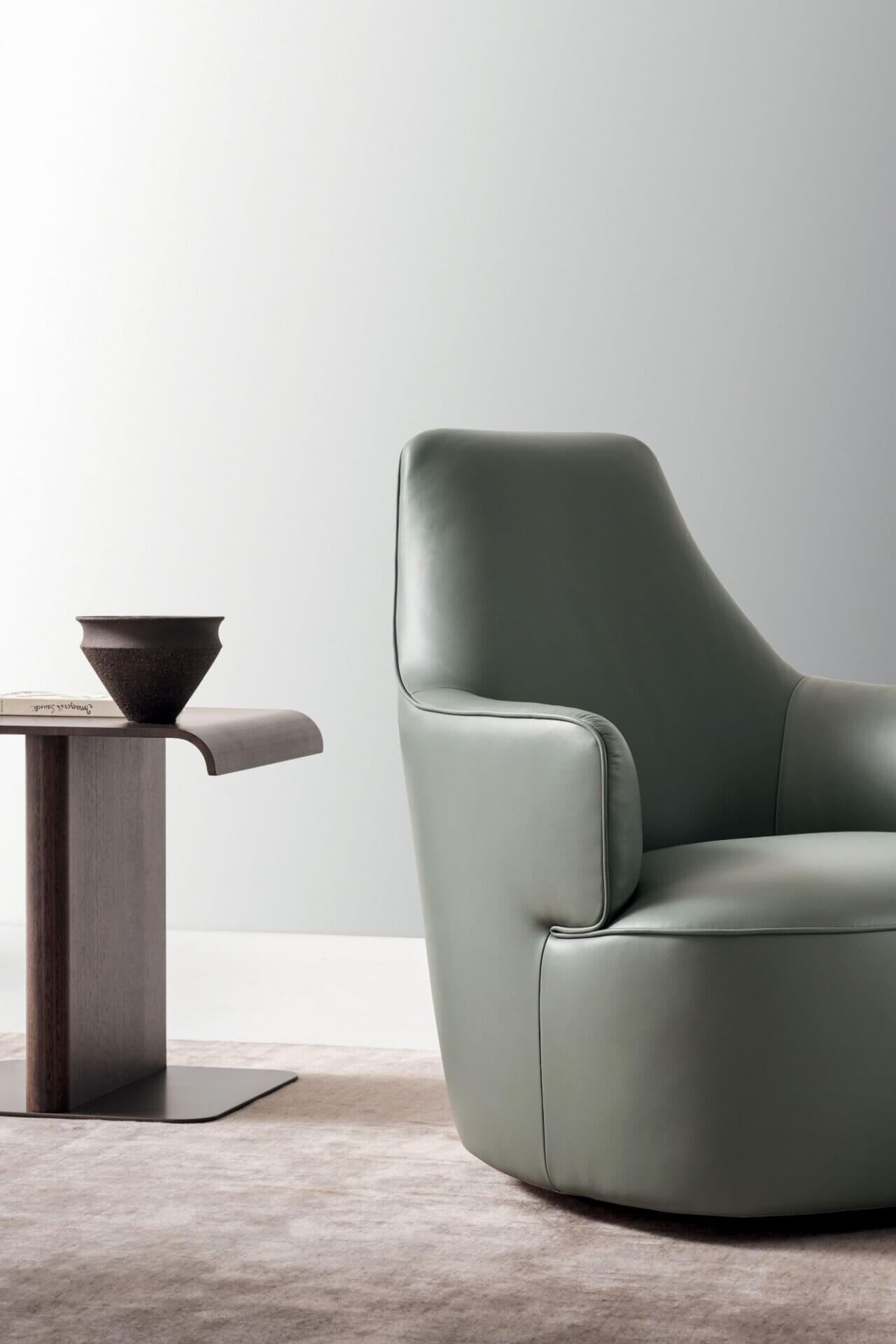 Luna is a collection of armchairs designed by Gabriele and Oscar Buratti inspired by the full moon. The perfectly circular seat is complemented by the half-moon backrest, in two versions: higher for reading and relaxing, or lower, for intimate conversations. The cuts are highlighted by the particular continuous piped stitching which elevates the sophisticated aesthetic of the armchairs, also available in swivel versions.