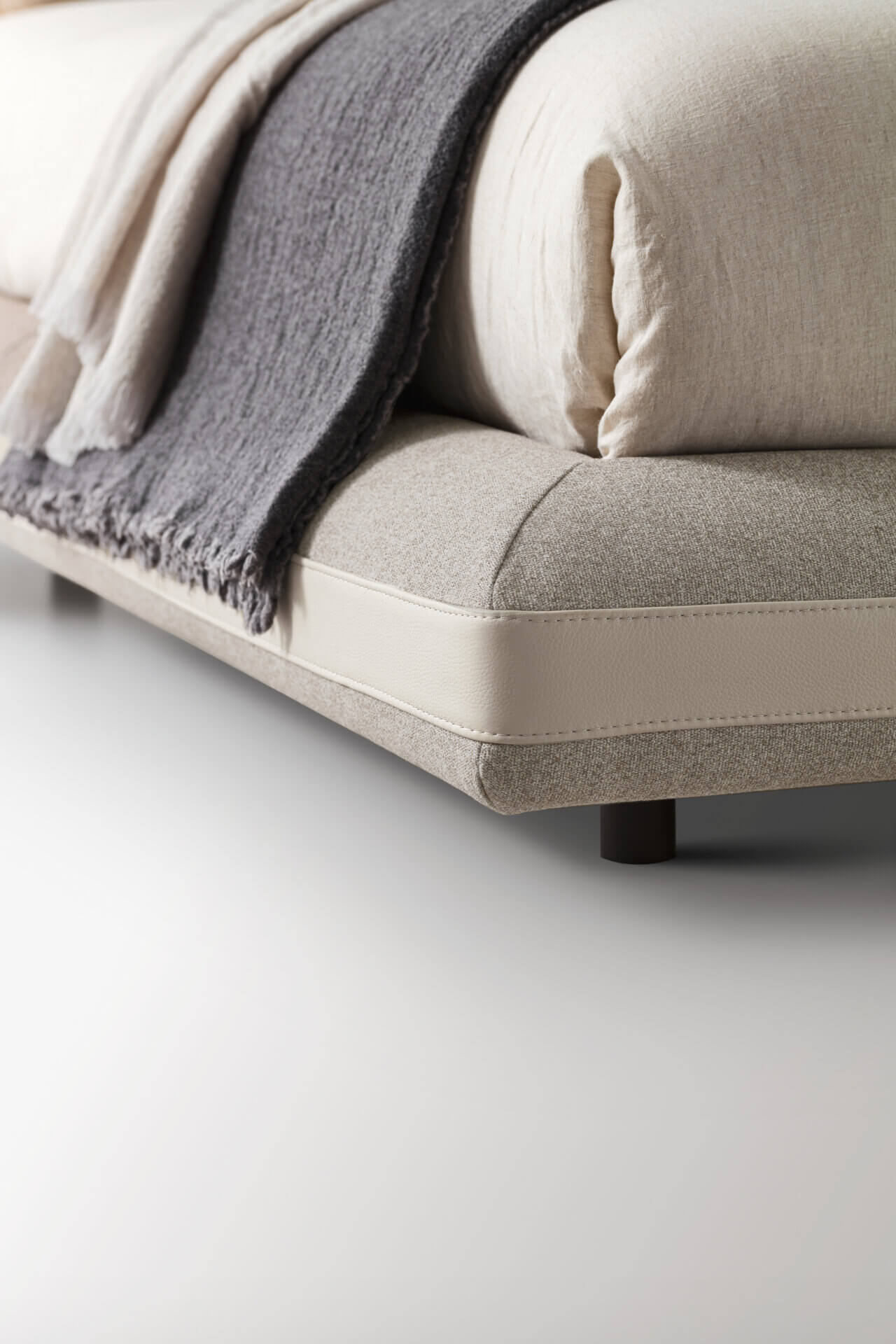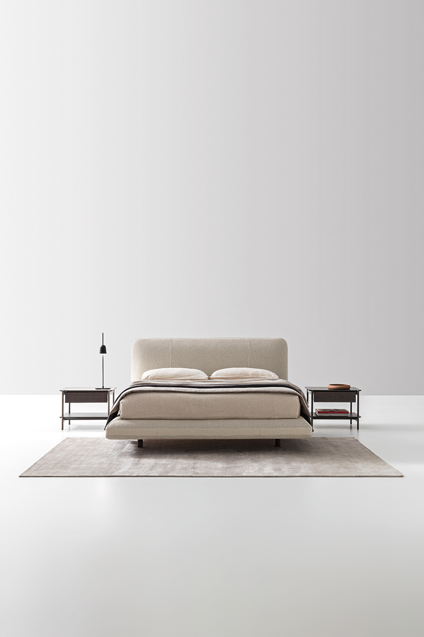 A strong and sophisticated design combines graceful curves and roundness, making it both aesthetically impactful and functional. The high upholstered headboard is teamed with a bed frame marked by bands and stitching, which enable Avalon to be enhanced with sophisticated combinations of fabric and leather.