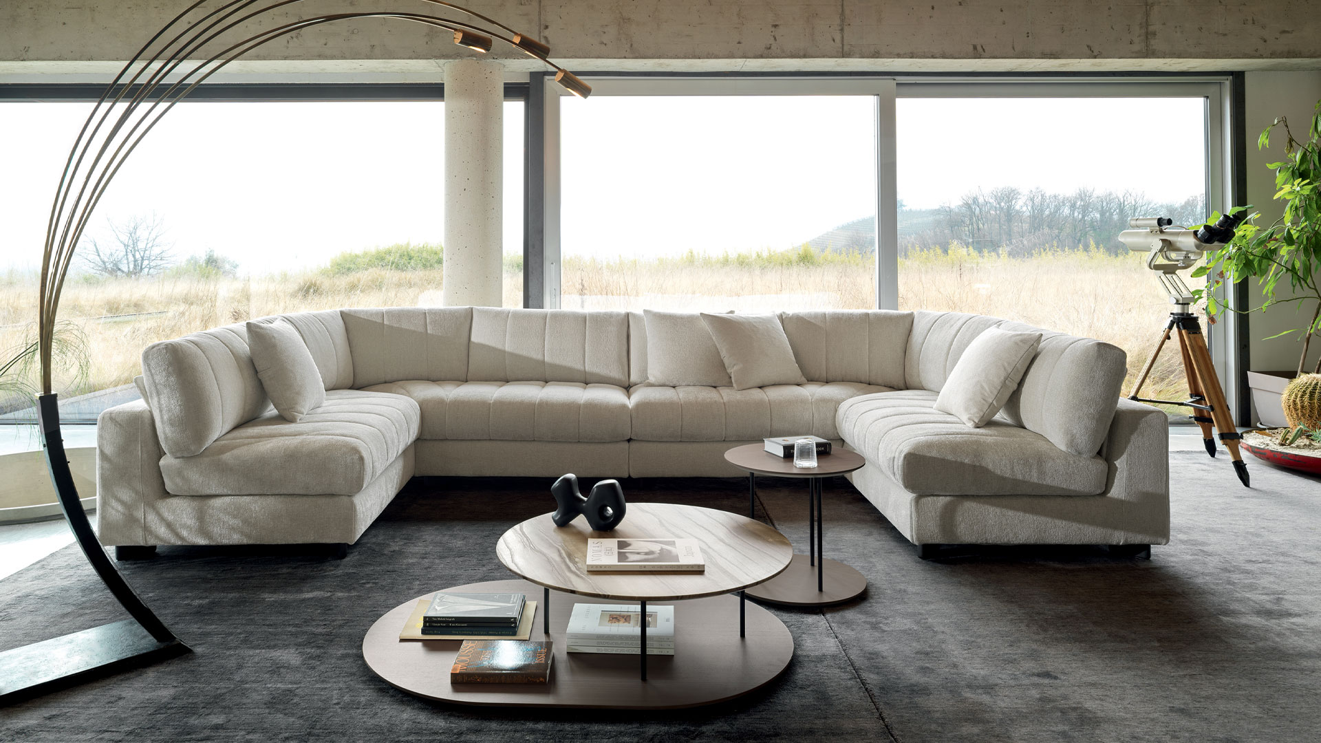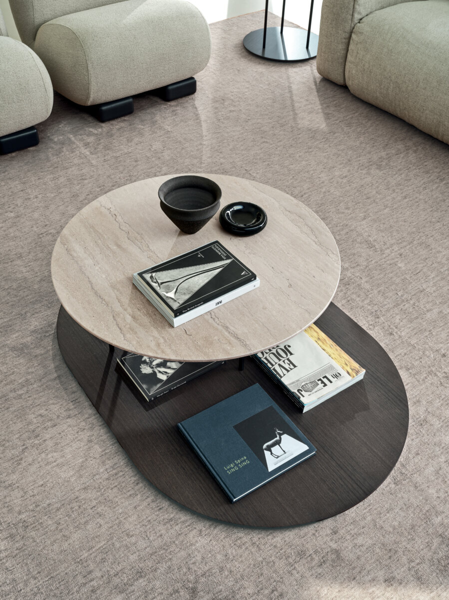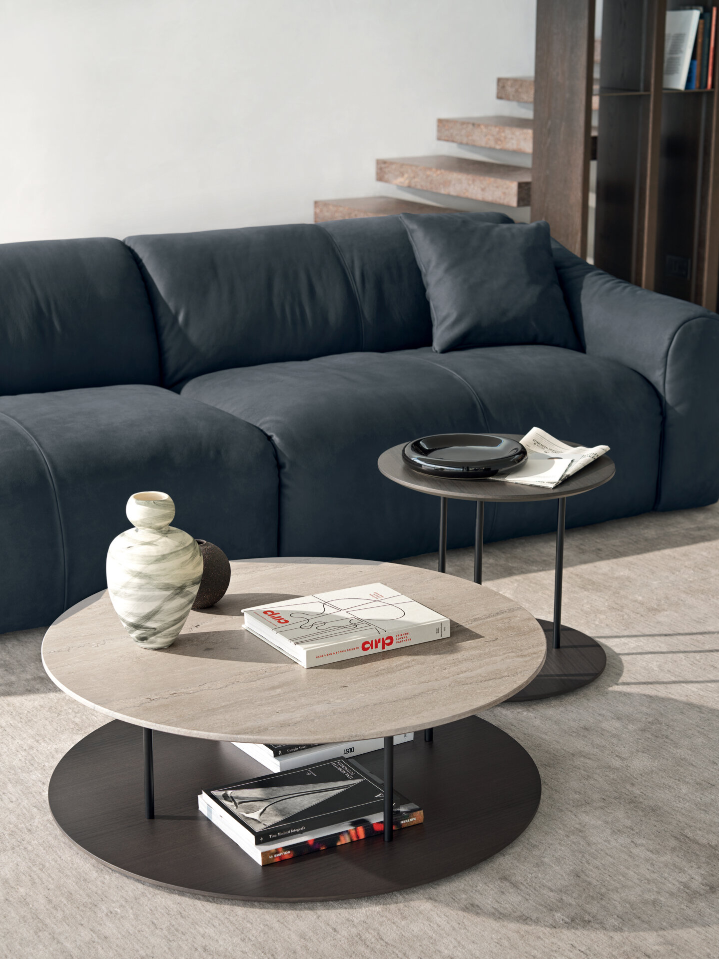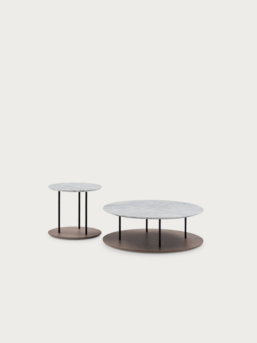 The collection of Staker coffee tables, designed by Robin Rizzini, combines architectural grandeur with functional elegance. The structure takes its inspiration from the principles of pilotis construction: four slender pillars delicately connect two surfaces in an architectural equilibrium that has a modernist feel and blends form with function.