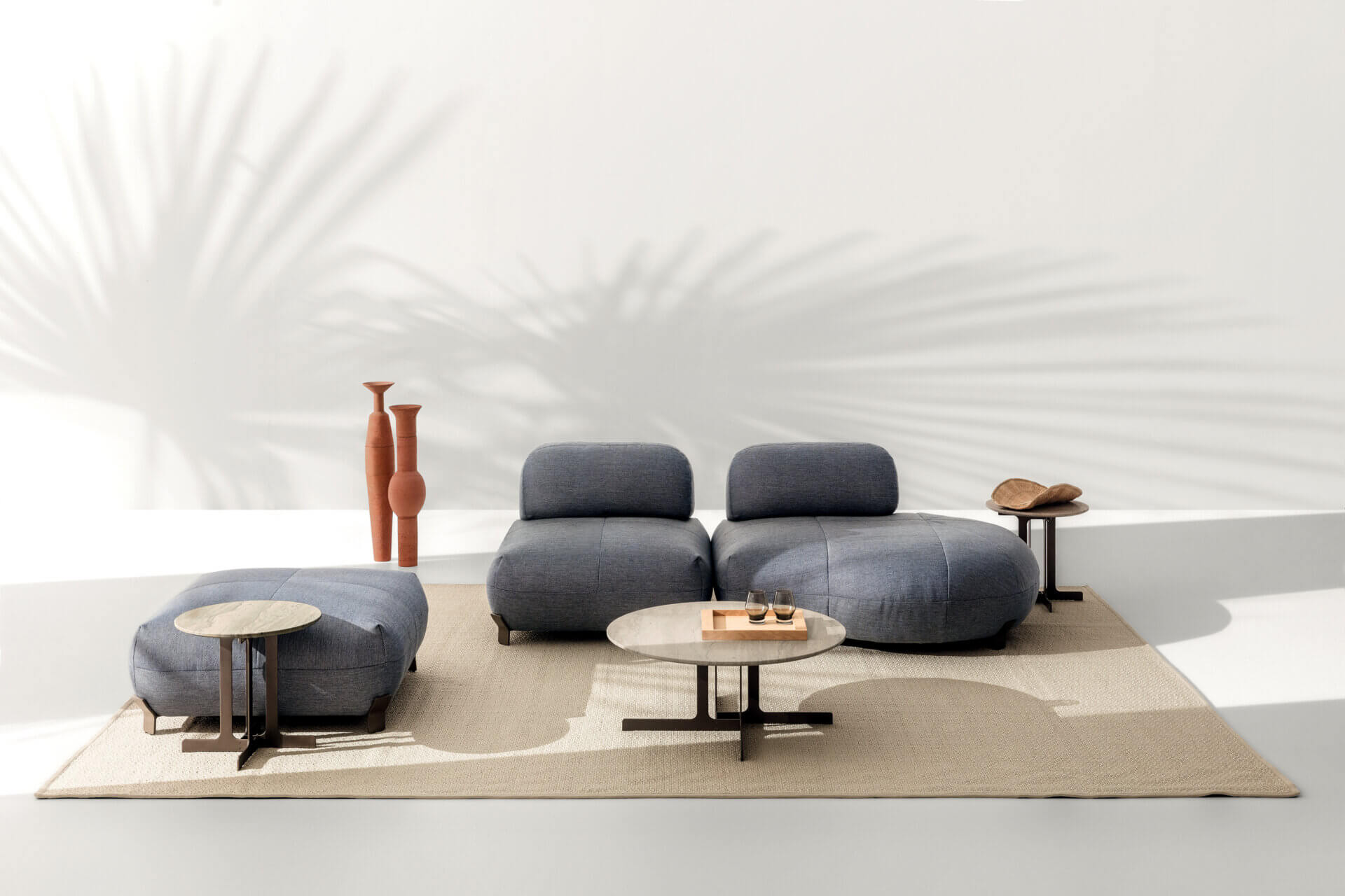 Completing the Ditre Italia outdoor area is the Plain Air rug, which brings the warmth of the domestic living room into external spaces. The texture revisits the aesthetic of woven natural fibre, seamlessly integrating in the surrounding environment.