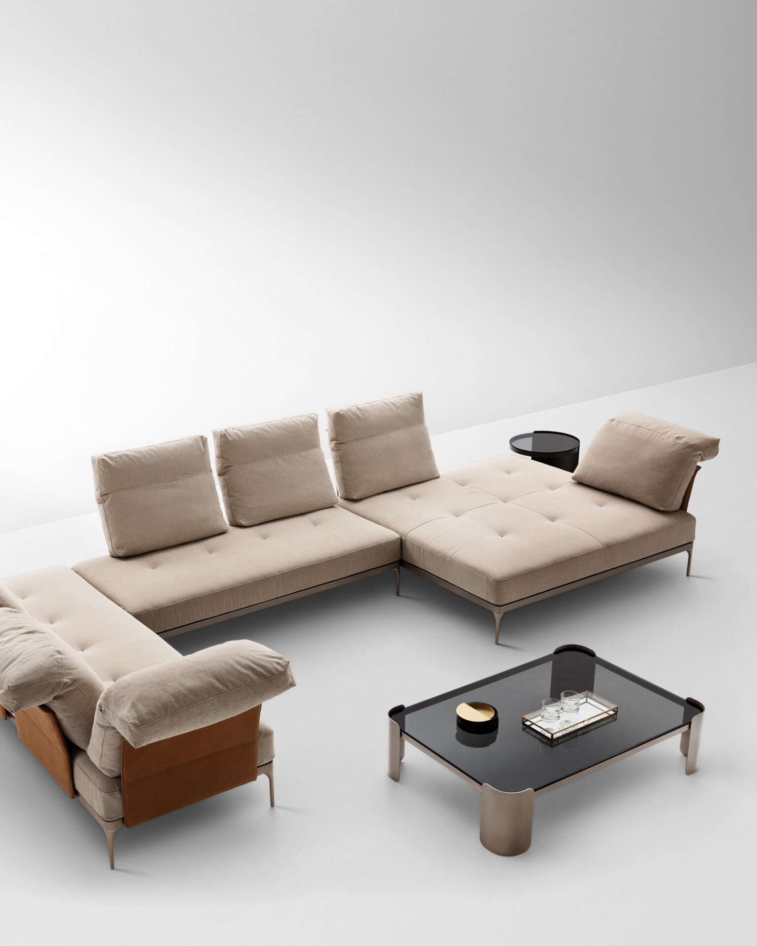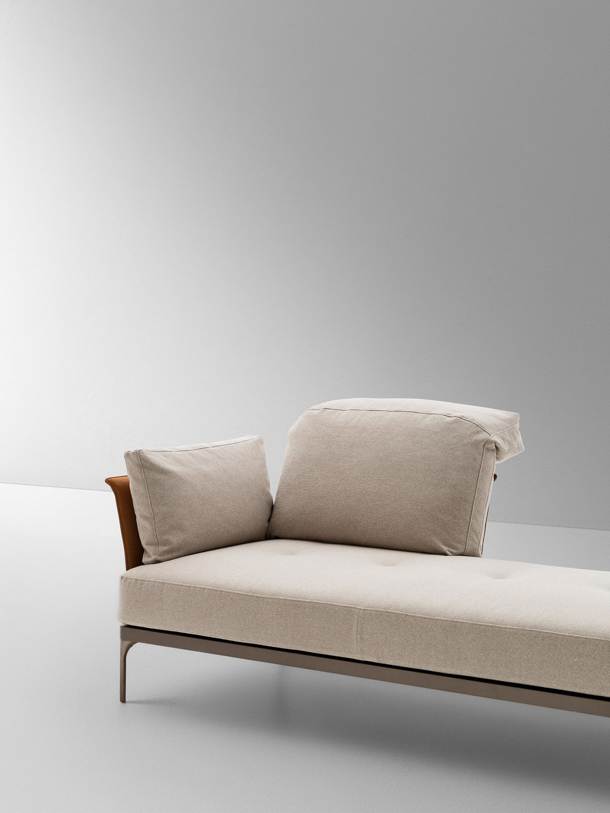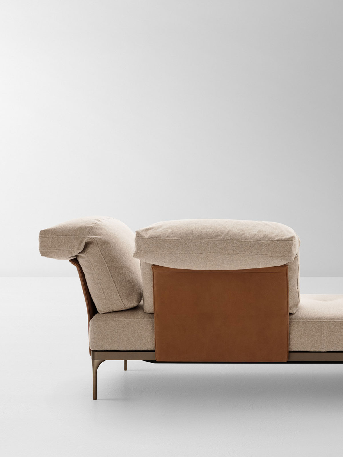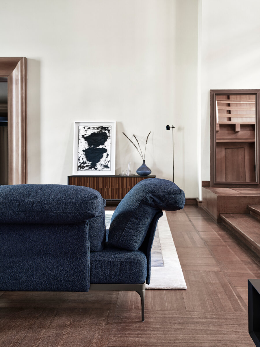Ada is a seating system of great compositional versatility, an archipelago of islands that mirrors the fluidity of the domestic environment. Its most distinctive feature is the back cushion that comes in two versions, low or high and folded back on itself, and leans against a thicker or thinner upholstered backrest. Mobile and repositionable, it gives you the freedom to tailor the sofa to your needs.