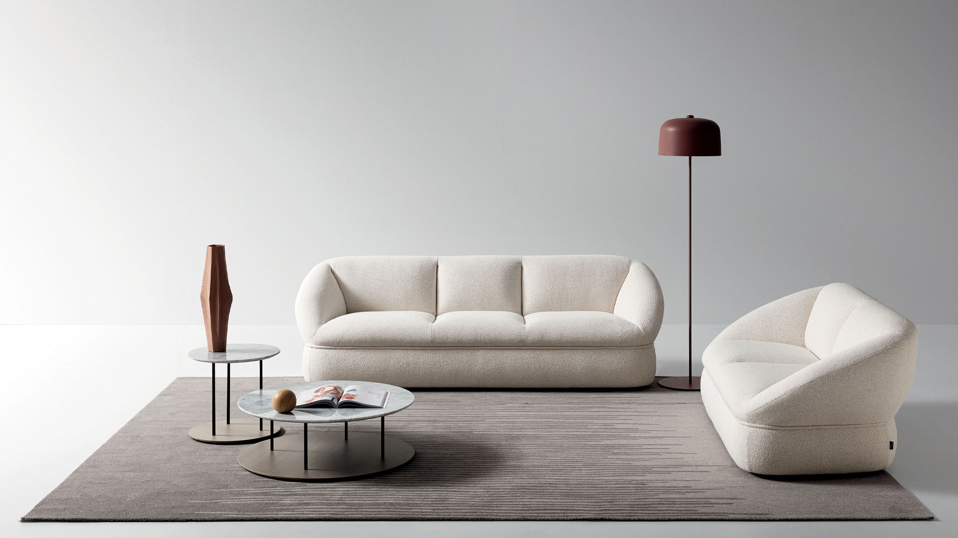 For Patrick Norguet, the sofa is more than a simple settee, it is the fulcrum of domestic living. This is why Alta elevates the very idea of comfort, translating it into a form that is soft, generous and welcoming, also visually. The volume of the sofa, inspired by a ball of cotton, is generated by the horizontal element that compresses the material and defines its form, inviting users to take the weight off their feet and relax.