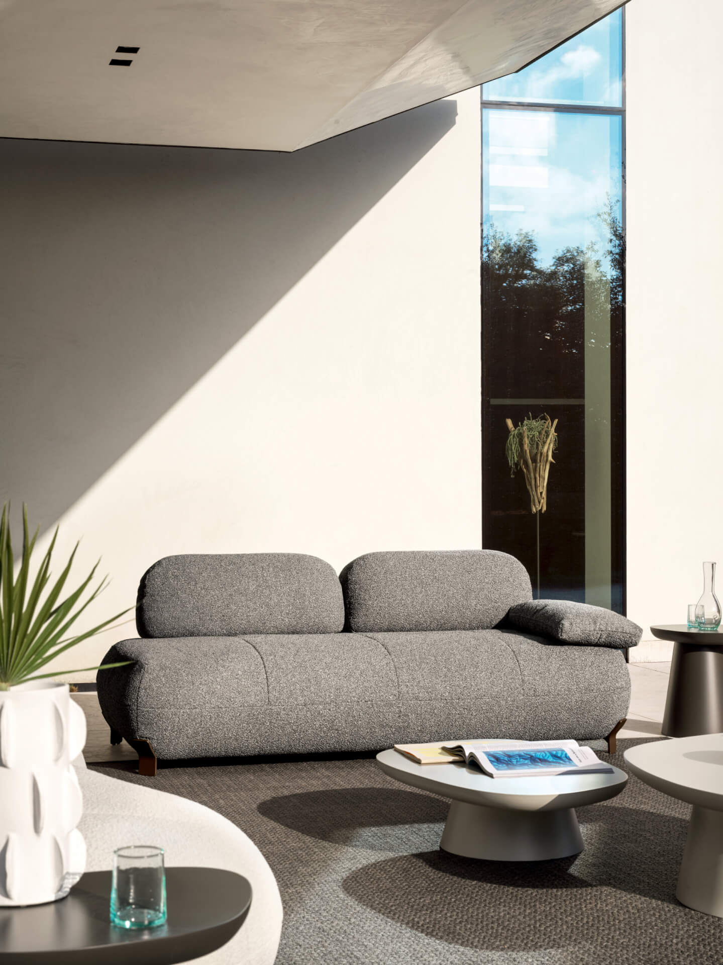 A sofa with elegant lines highlighted by the special shape of the armrests. There are many customisation options, starting from three feet versions: a discreet and subtle L-shaped metal profile, an informal, bridge-shaped version and, last but not least, a framework that runs along the whole edge of the sofa. T ake your pick from these three different personalities to feel at home in your own house.
