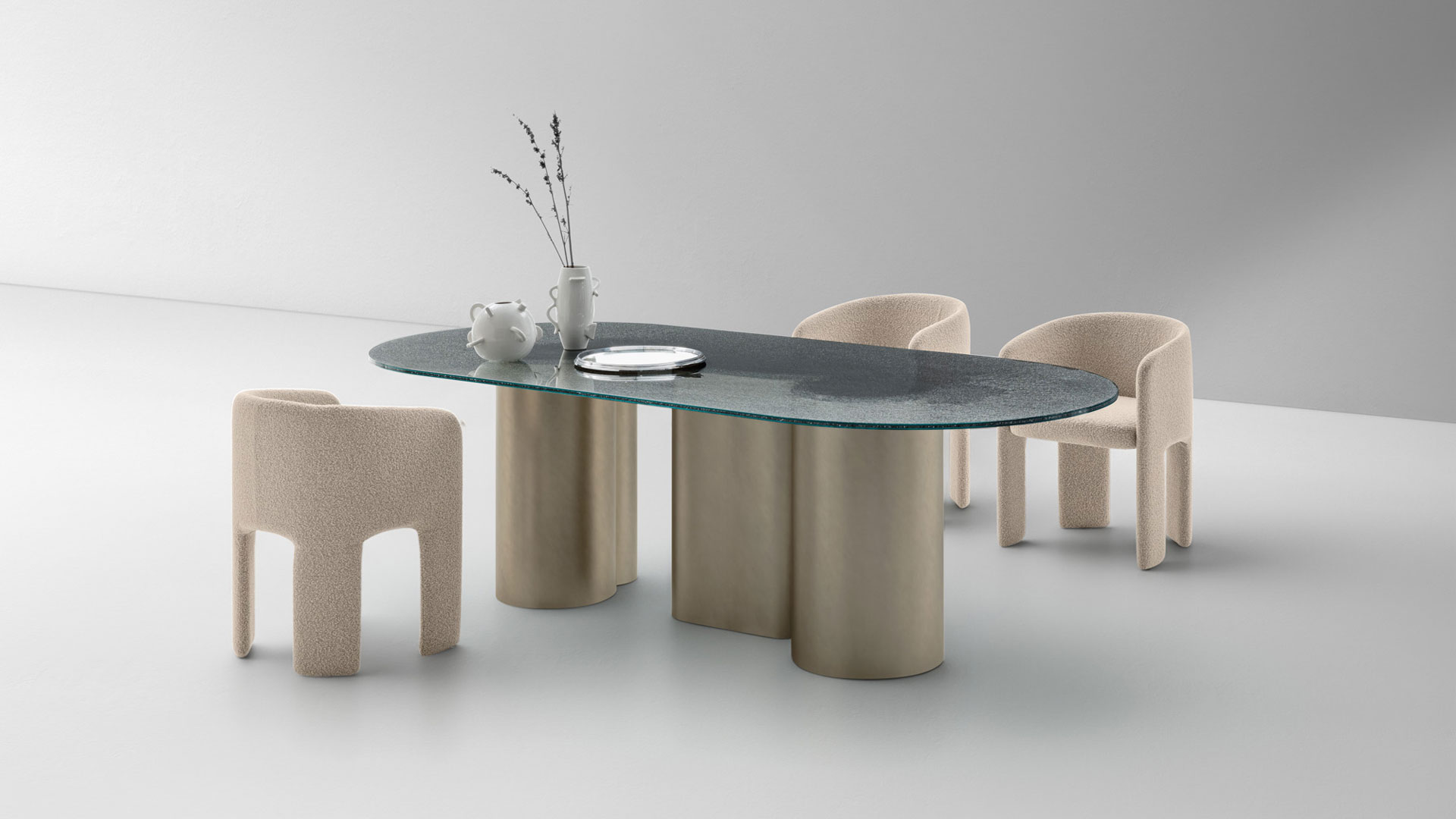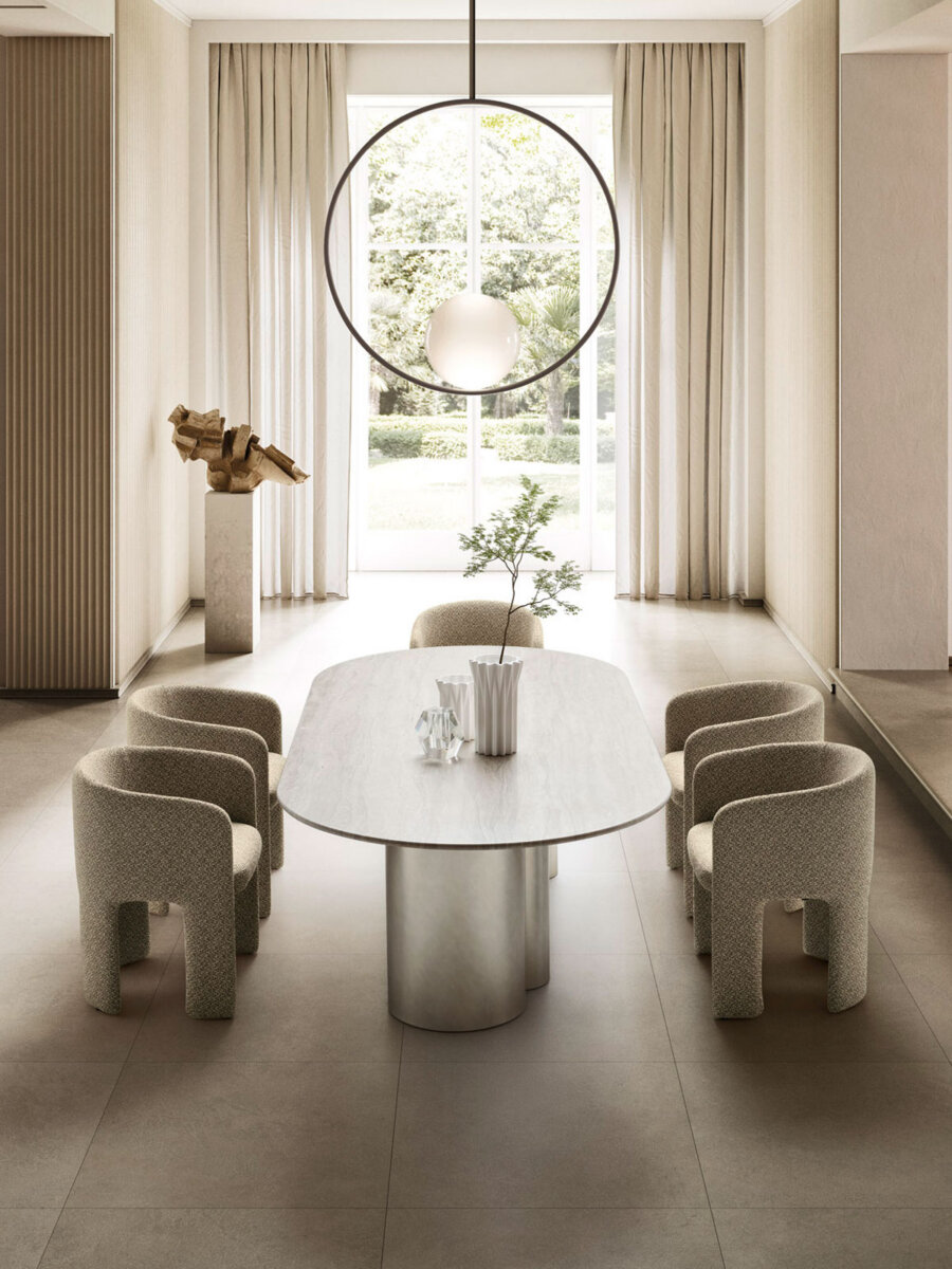 A table of contemporary profiles inspired by the architectures of the present. The legs that support the oval or round top are reminiscent of monolithic pillars or arches, creating imposing tables of strong visual impact.