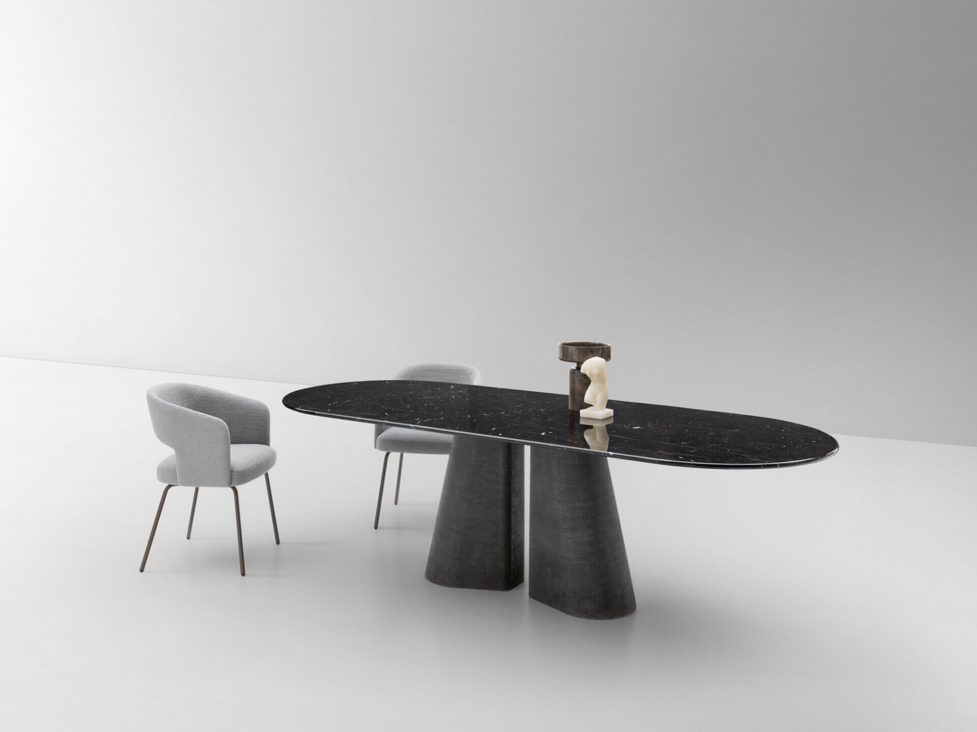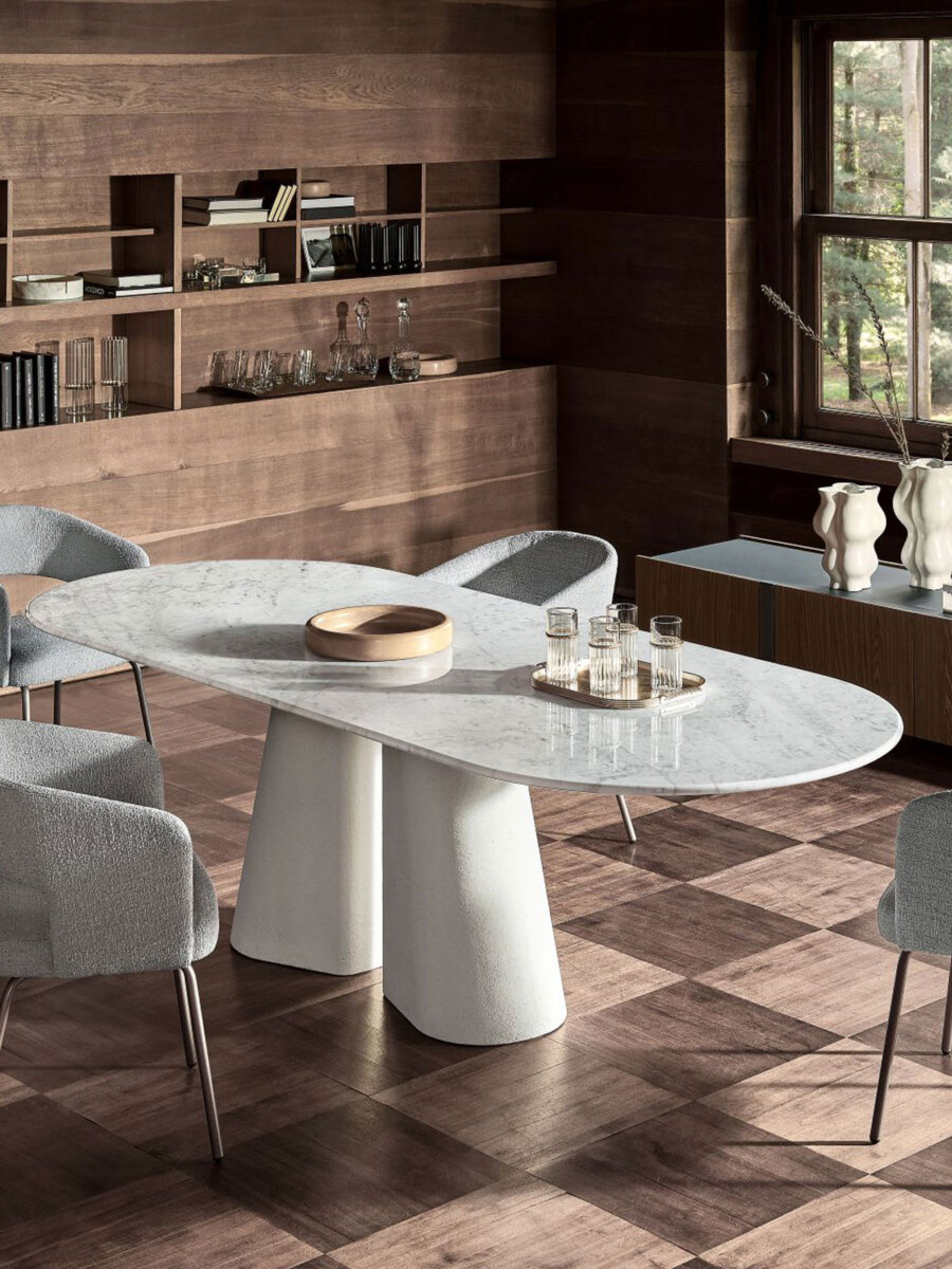 Designed for the contemporary dining room, Pillar is a minimalist table with an imposing presence thanks to the sculpted base consisting of two columns straight out of the agora of Ancient Greece. A source of architectural inspiration that is also underlined by the use of fine materials like concrete in the base and marble in the top.