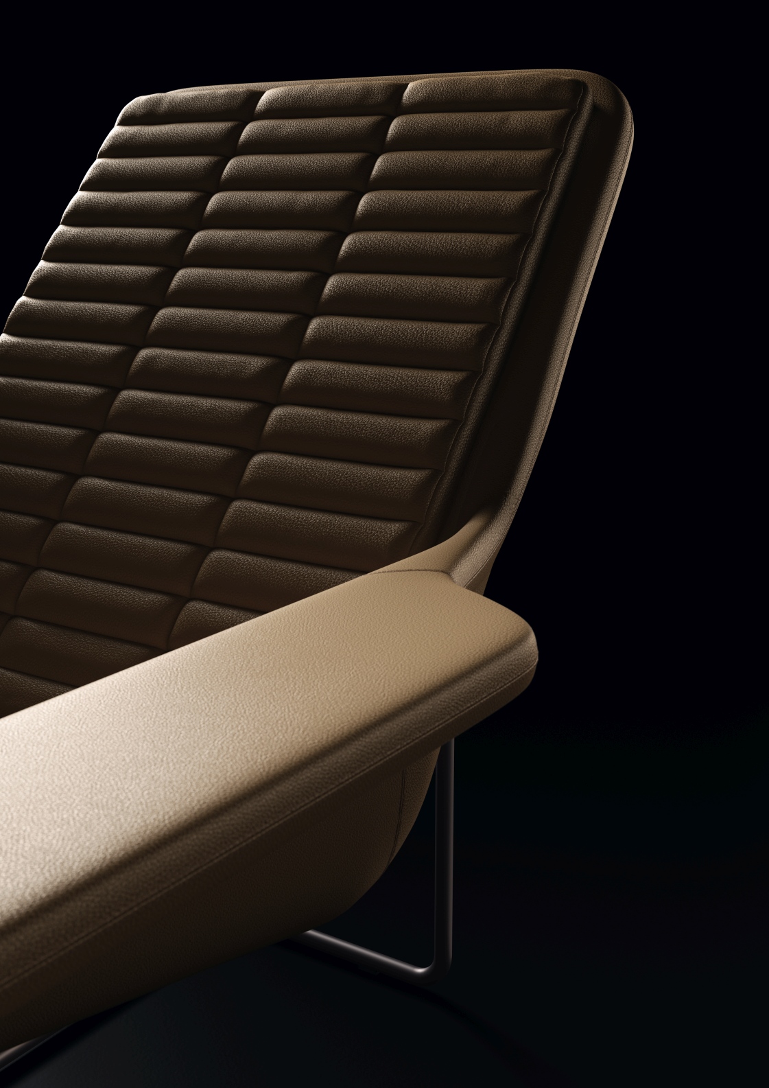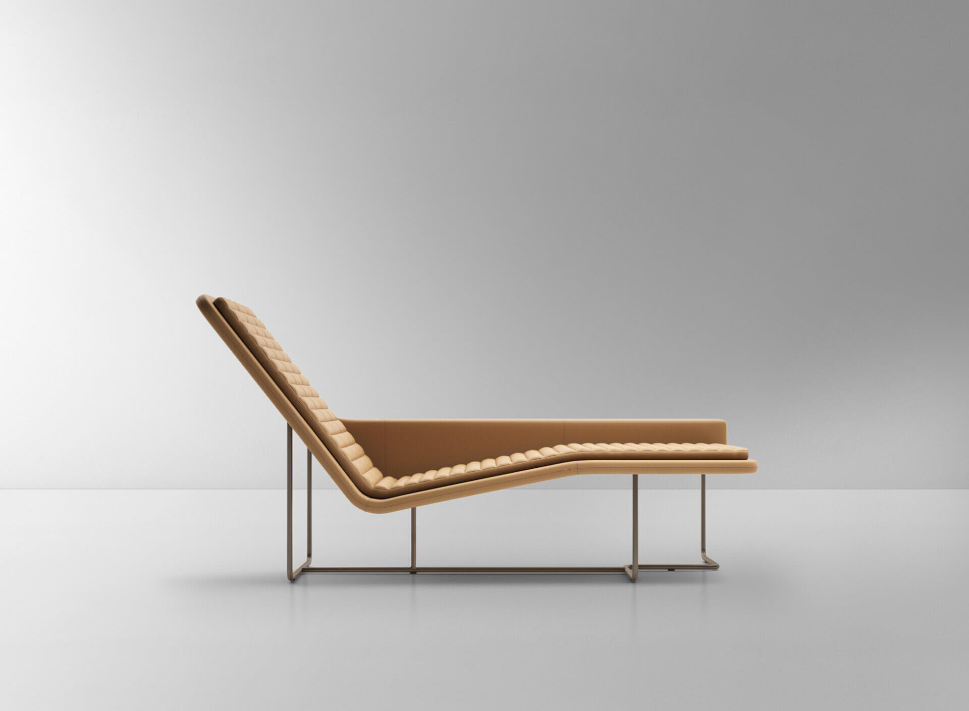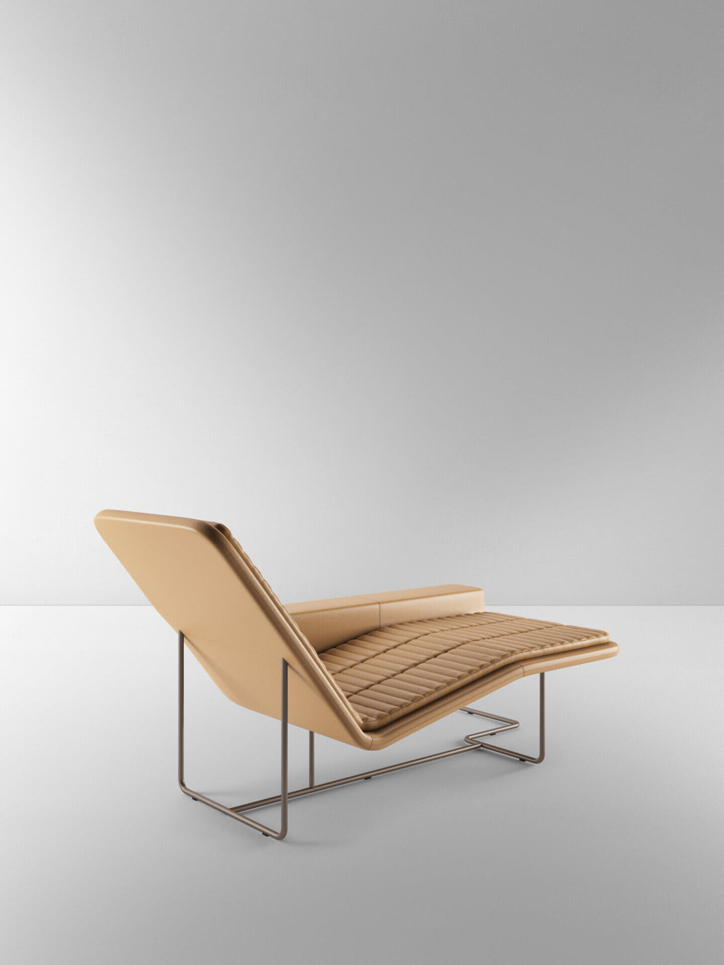 The Origami chaise longue is inspired by the Japanese art of folding a flat surface into several parts to create different shapes. The base is almost indistinguishable, designed to elevate the subtle, elegant seat as though it were a work of art.