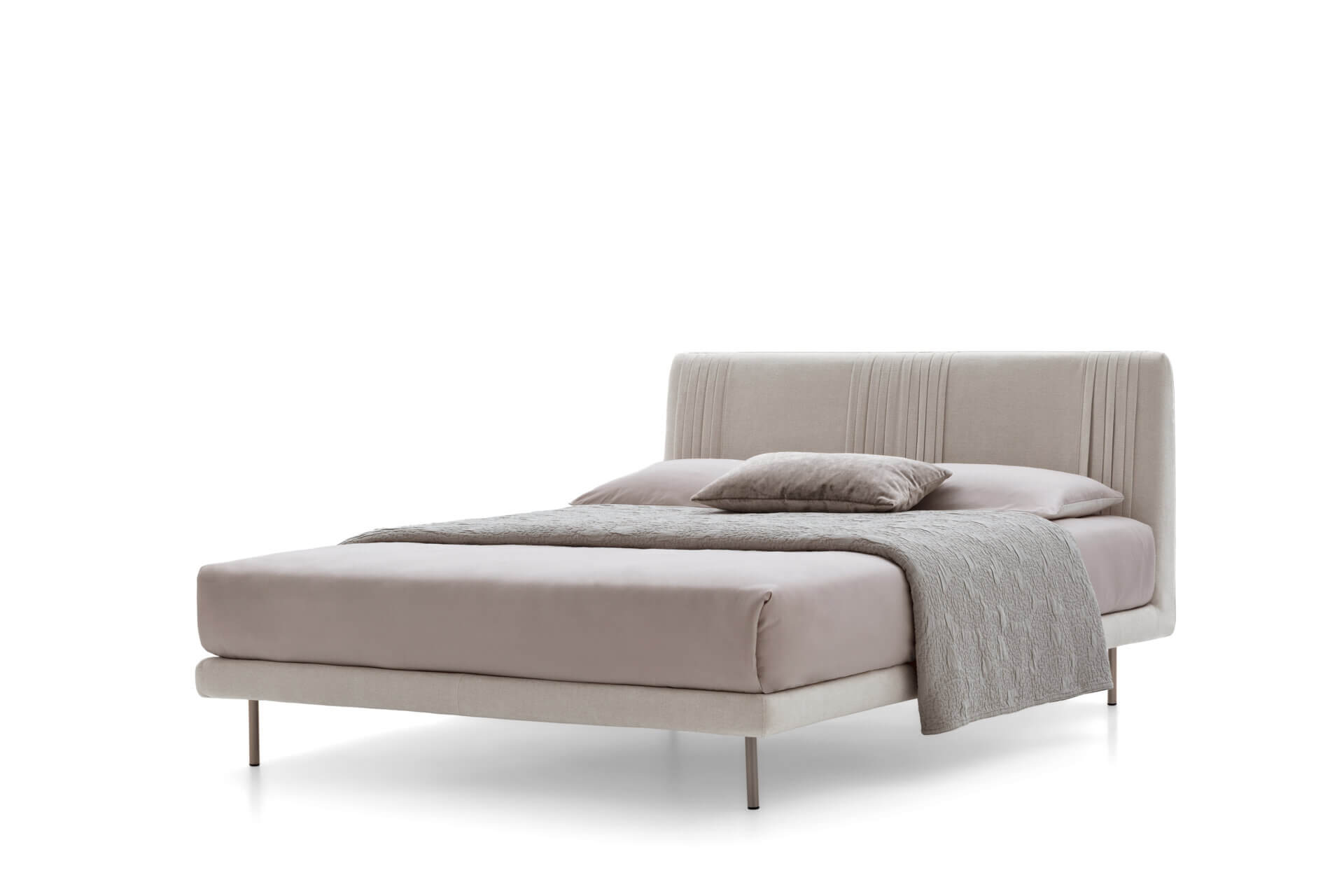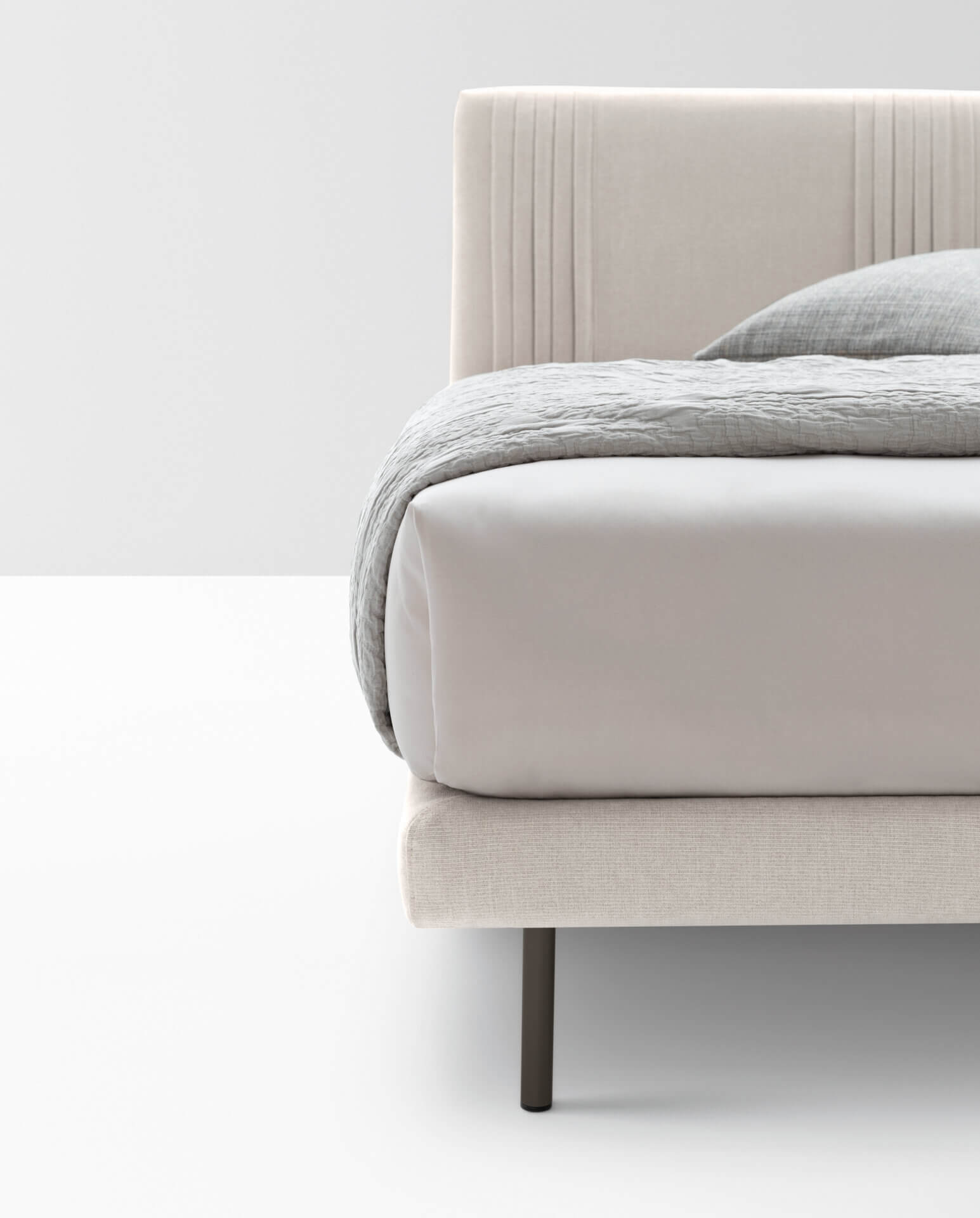 El plisado como rasgo distintivo, romántico y de clase. Chloé Luxury es una cama tapizada en tejido, de marcada identidad y volúmenes medidos. En esa misma familia, el armonioso dormitorio se completa con los sillones acogedores y elegantes.