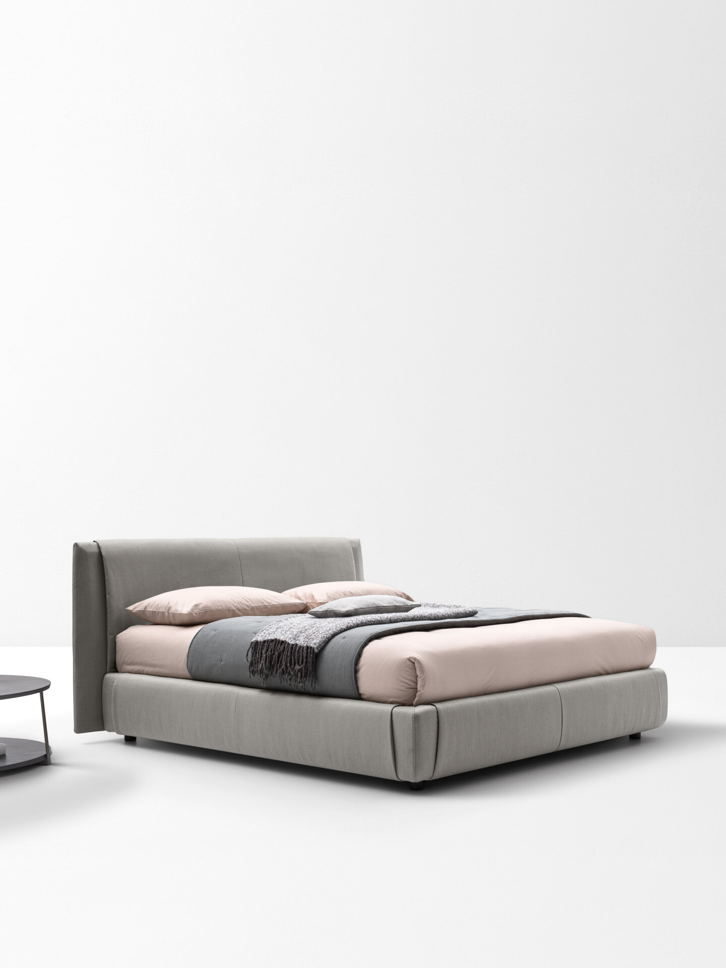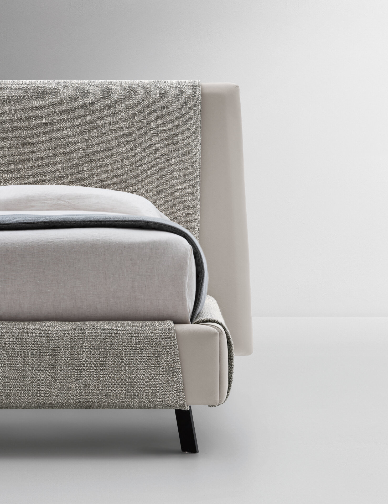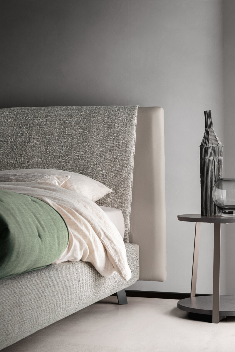 Kailua es una cama cómoda y de elegantes proporciones, adornada con una franja que envuelve el cabecero y el aro. Un detalle artesanal que se inspira en la superposición de camisa y jersey, y que permite crear sofisticadas combinaciones de materiales uniendo tejido y piel.