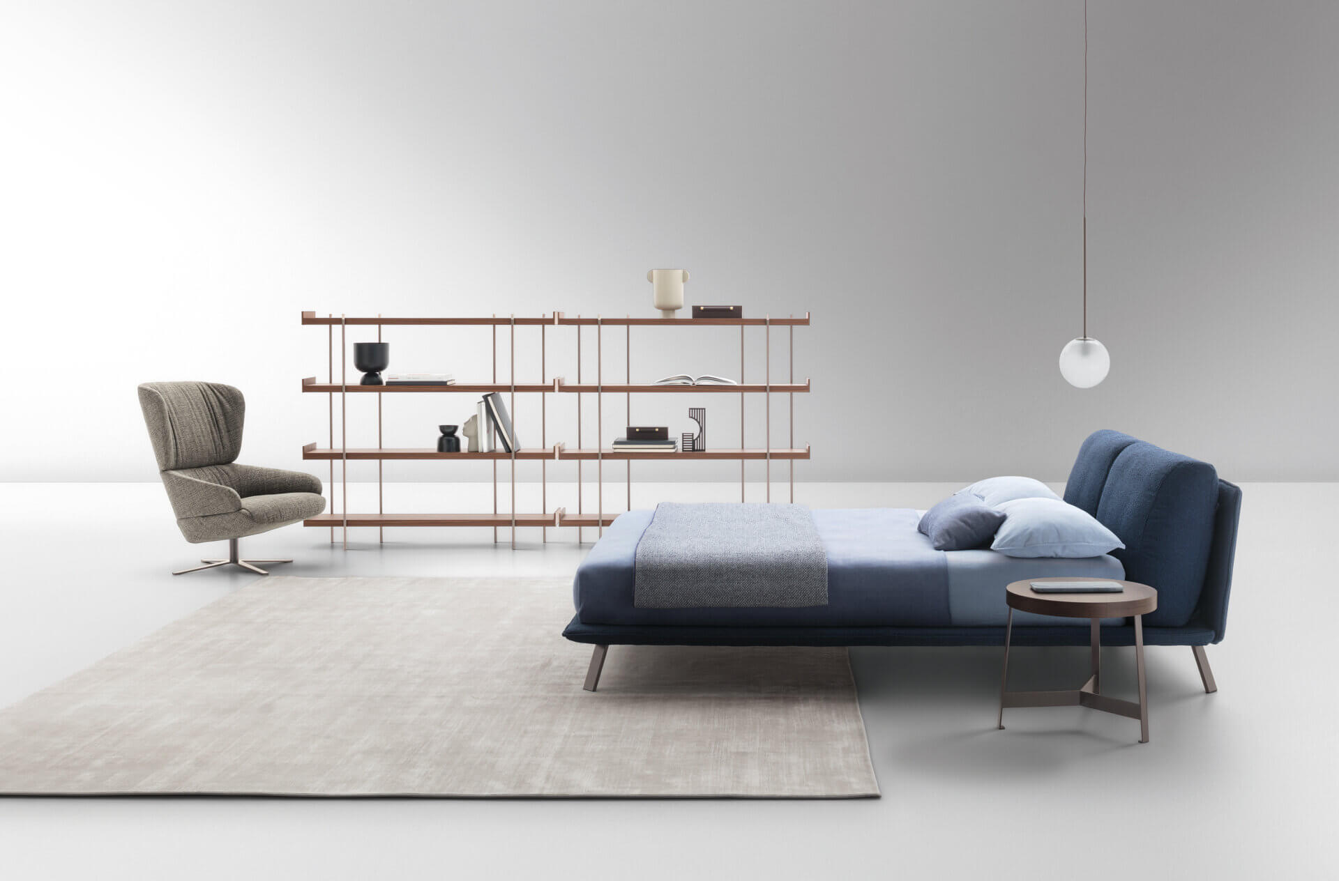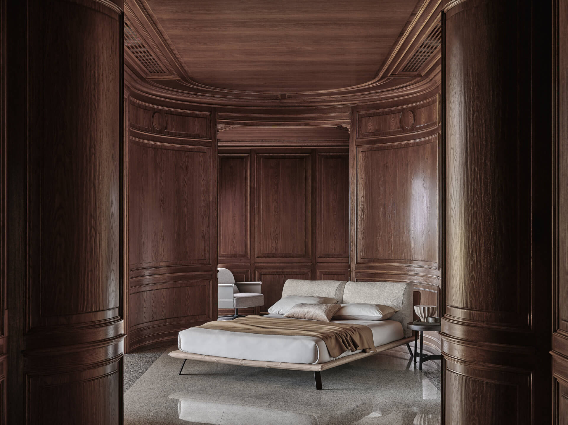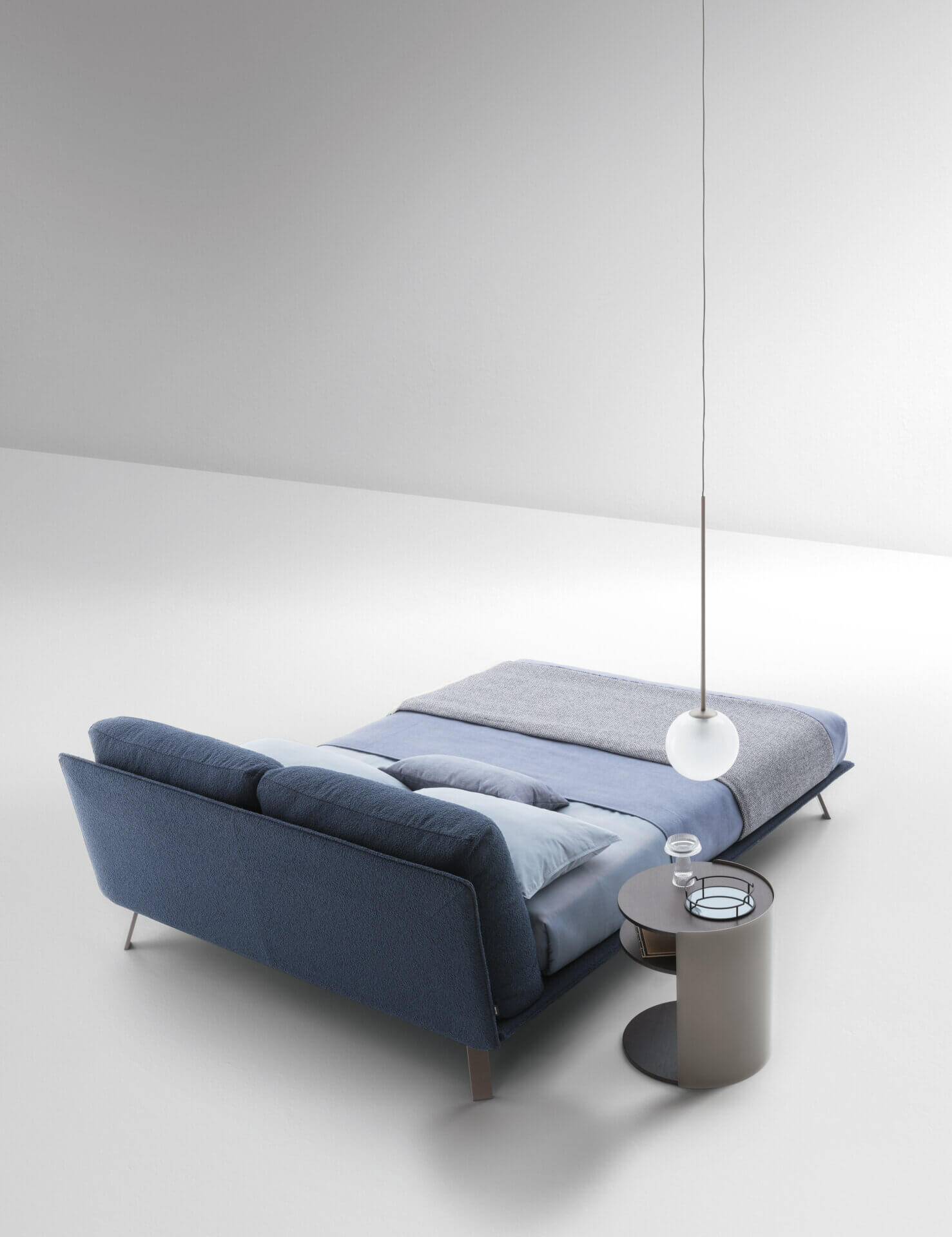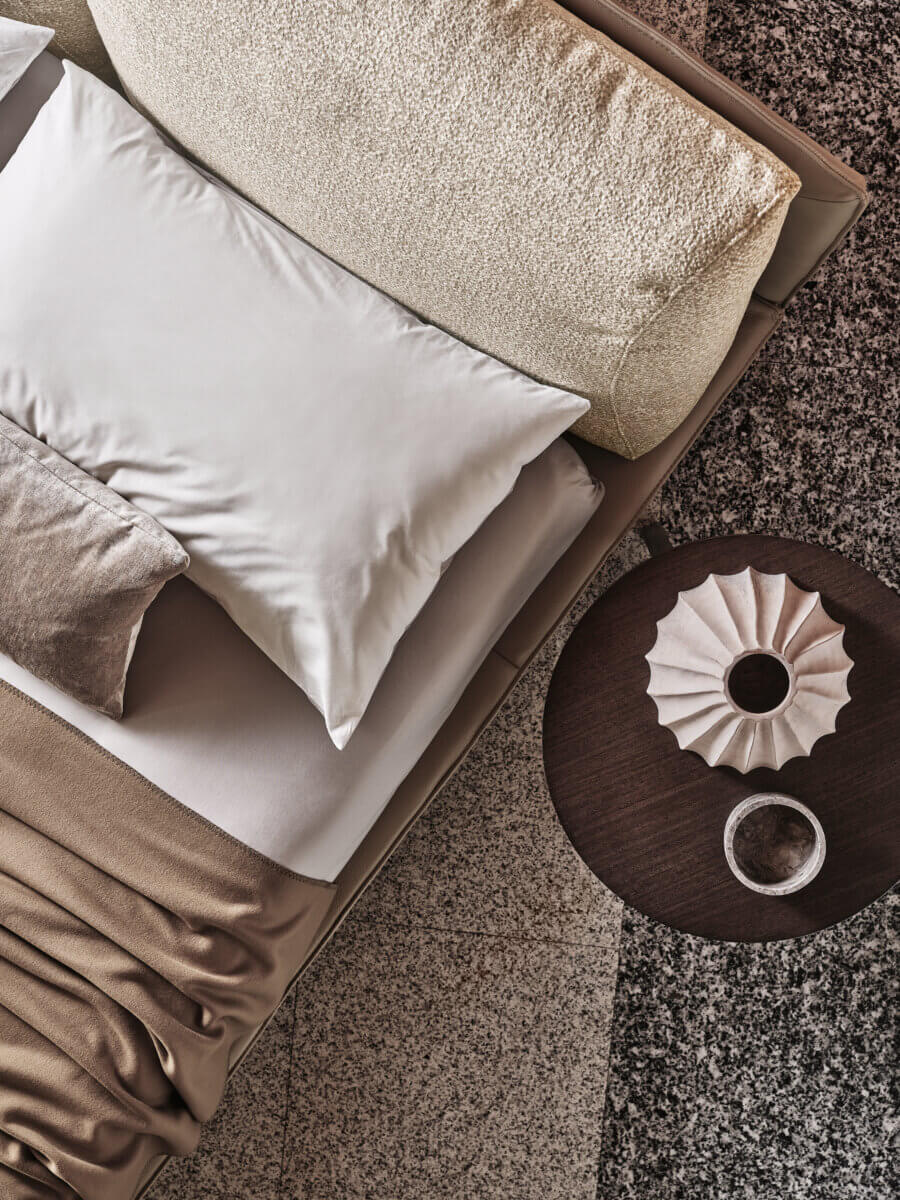 Kanaha es una cama elegante que combina cuidadosamente modernidad y artesanía. Fruto de la contraposición y del equilibrio entre los suaves volúmenes del cabecero y las tensas geometrías de la estructura, con su estética liviana y suspendida busca sugerir una dimensión inédita del sueño.