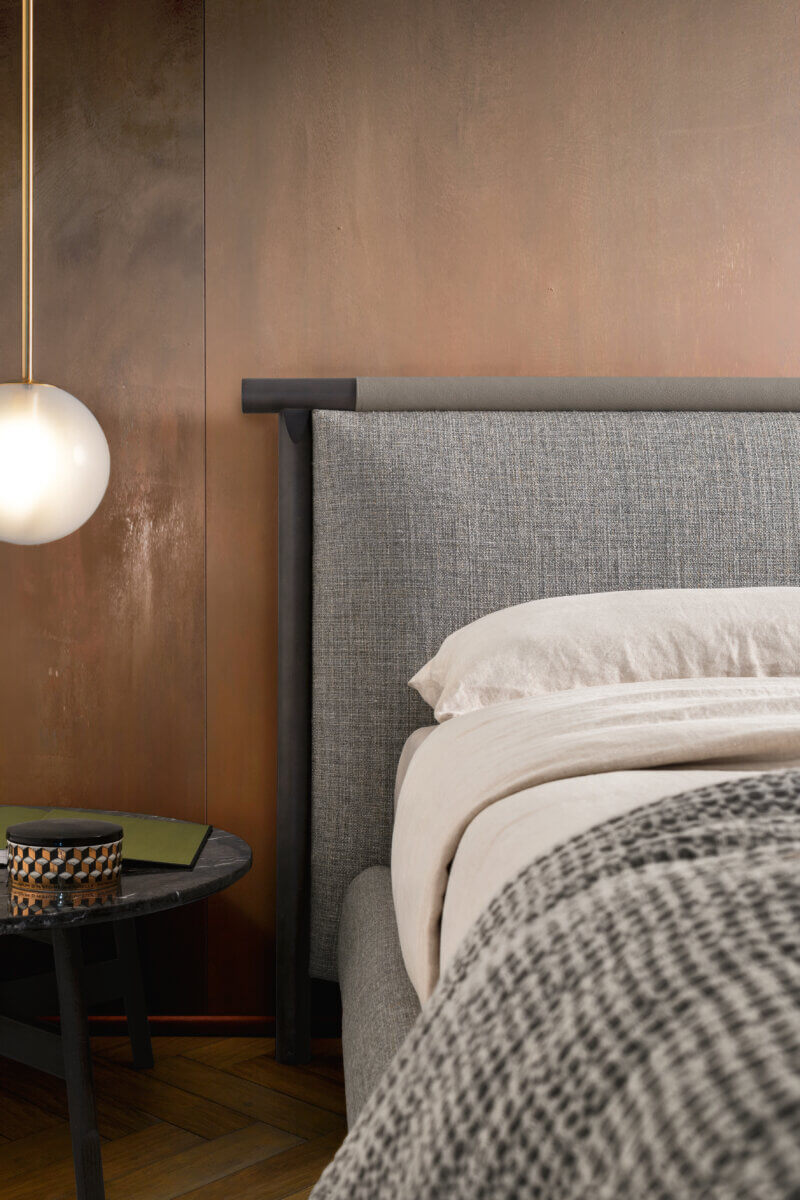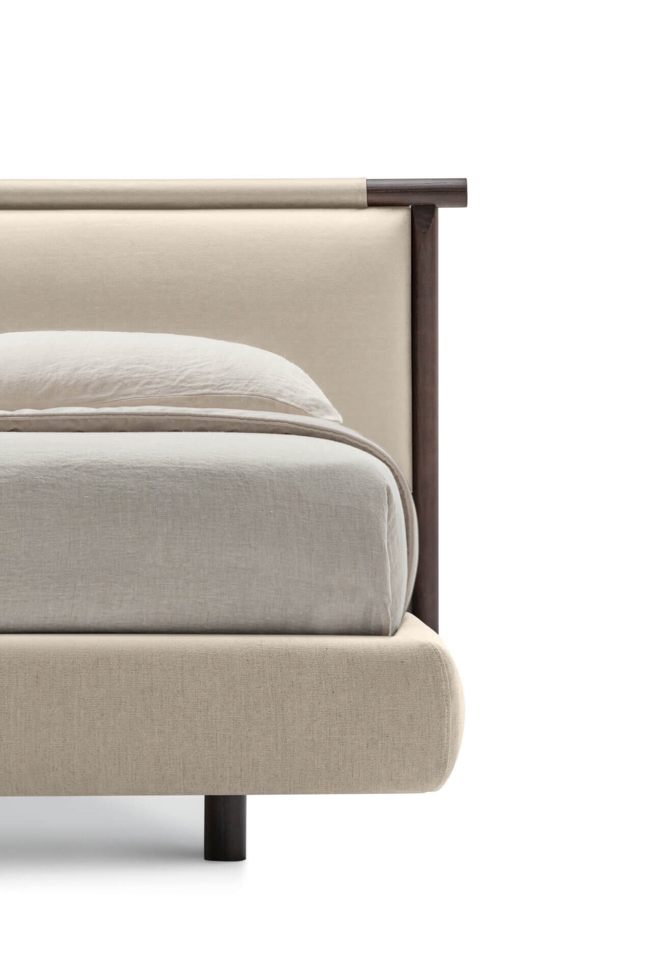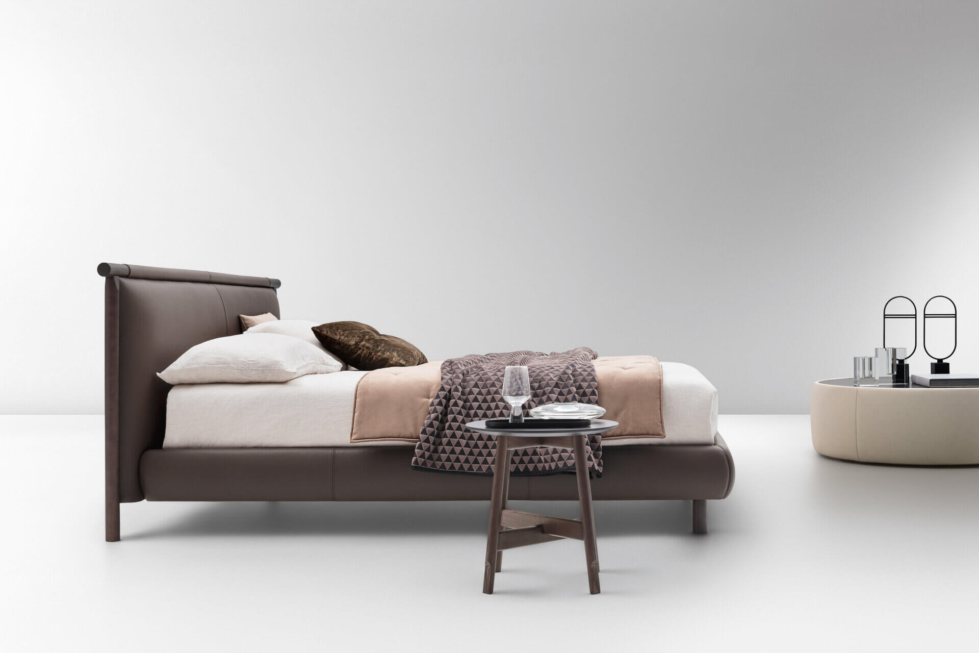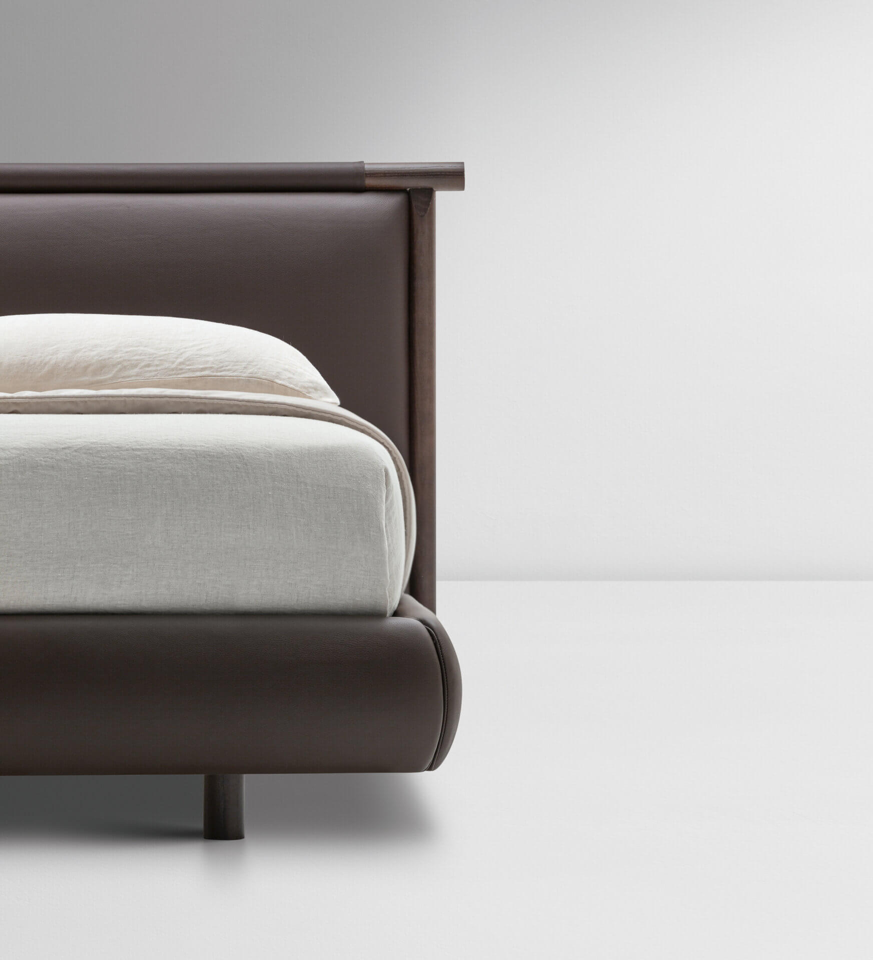 The balance of design, amid shape and materials. The Nathan bed exudes a sophisticated appeal, characterised by a wooden frame, partly concealed and embellished by leather upholstery, which accommodates the soft cushions integrated into the headboard. The recessed position of the feet is carefully designed to make them less visible and lend the bed a “suspended” appearance as if floating above the floor.