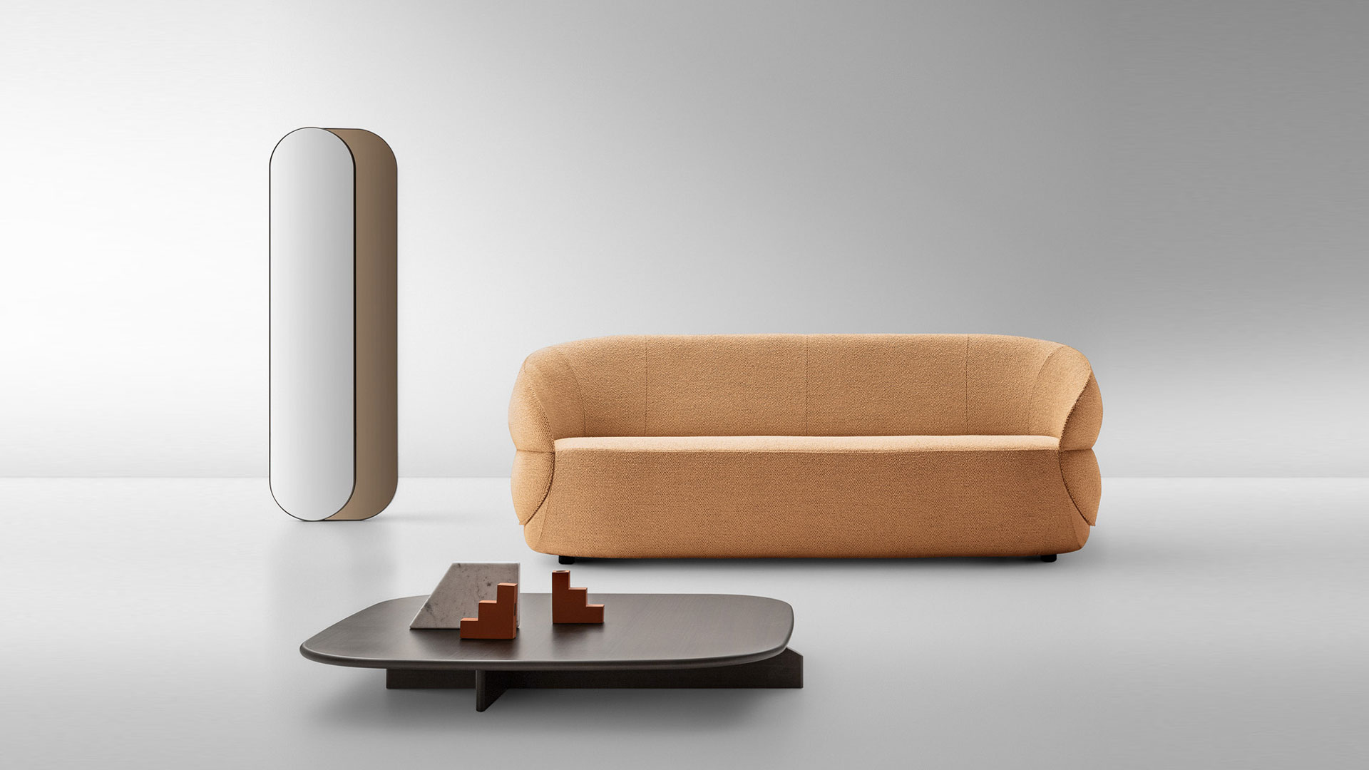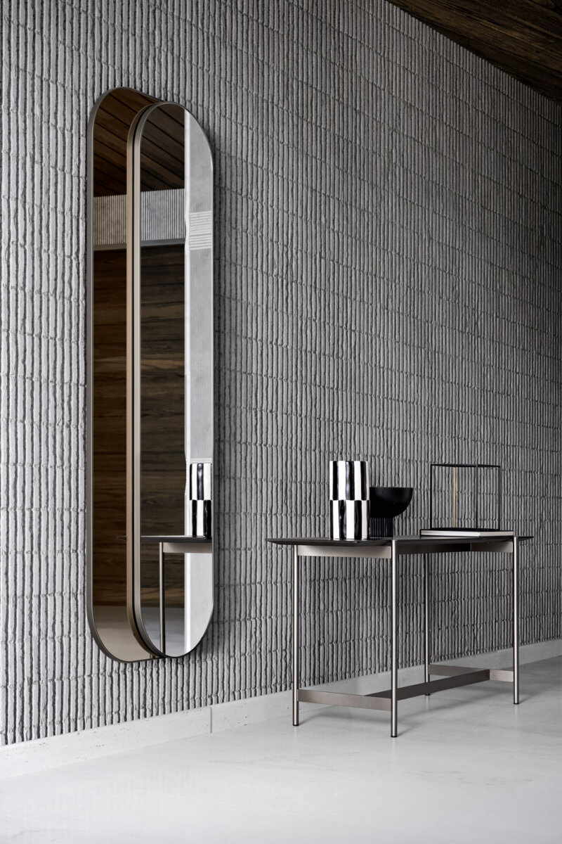 Primopiano es un espejo de sobremesa o de pared caracterizado por el contraste entre dos lunas ovaladas solapadas. Tal y como sugiere el nombre, la superficie reflectante es la situada en primer plano, mientras que la bronceada es decorativa y crea un sofisticado efecto de profundidad.