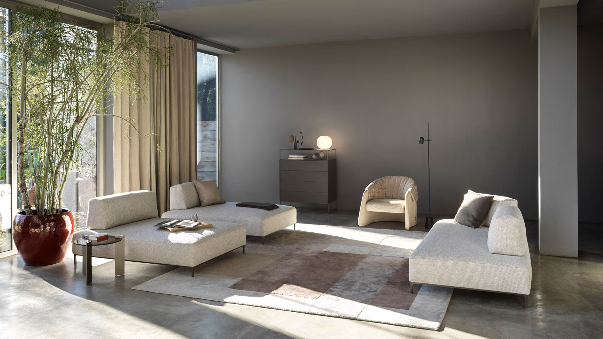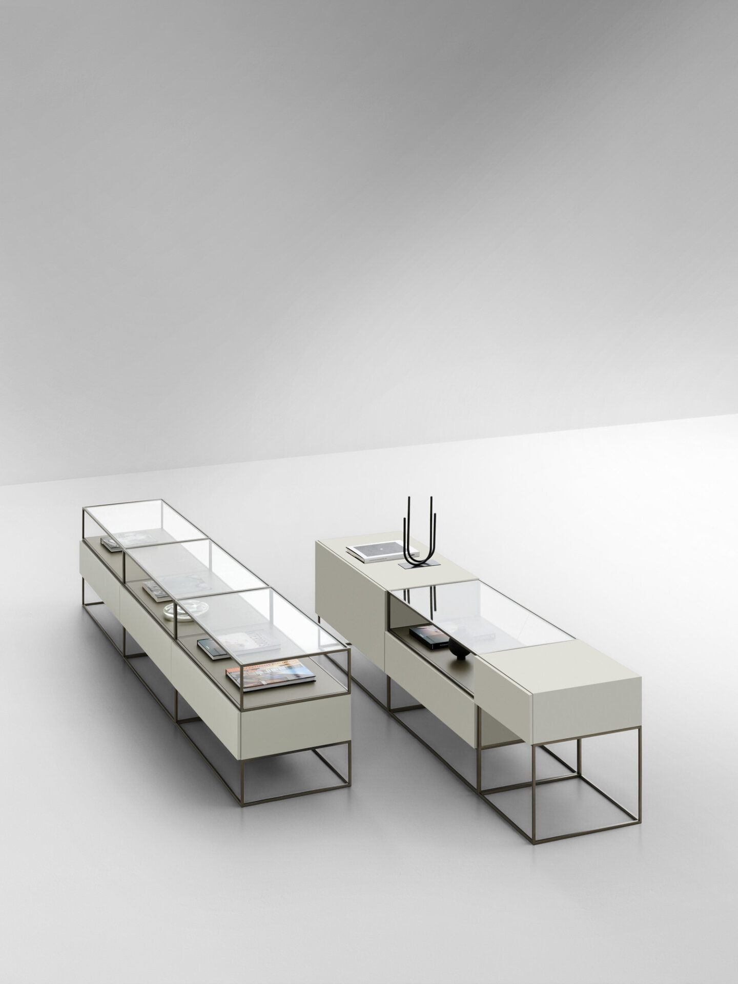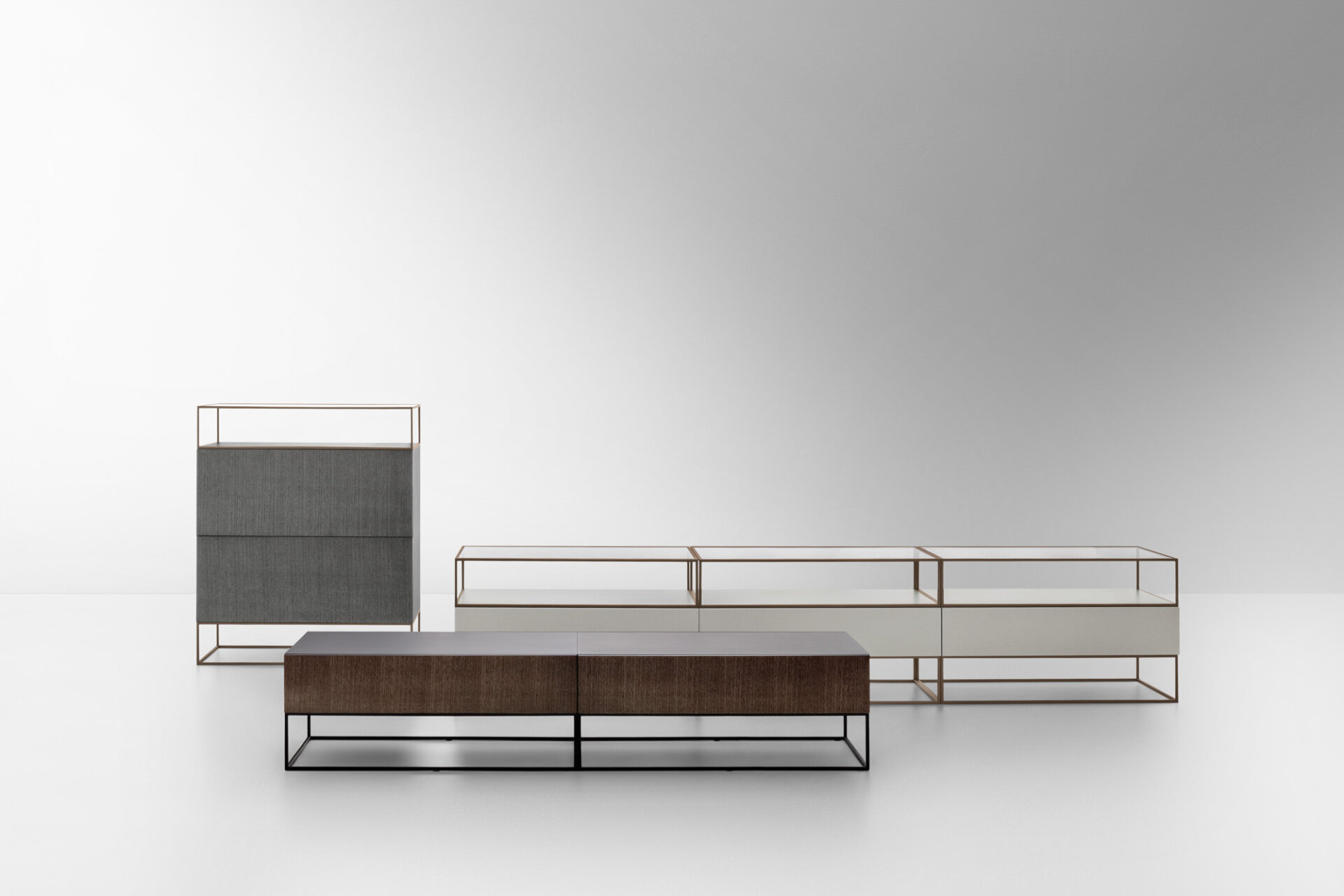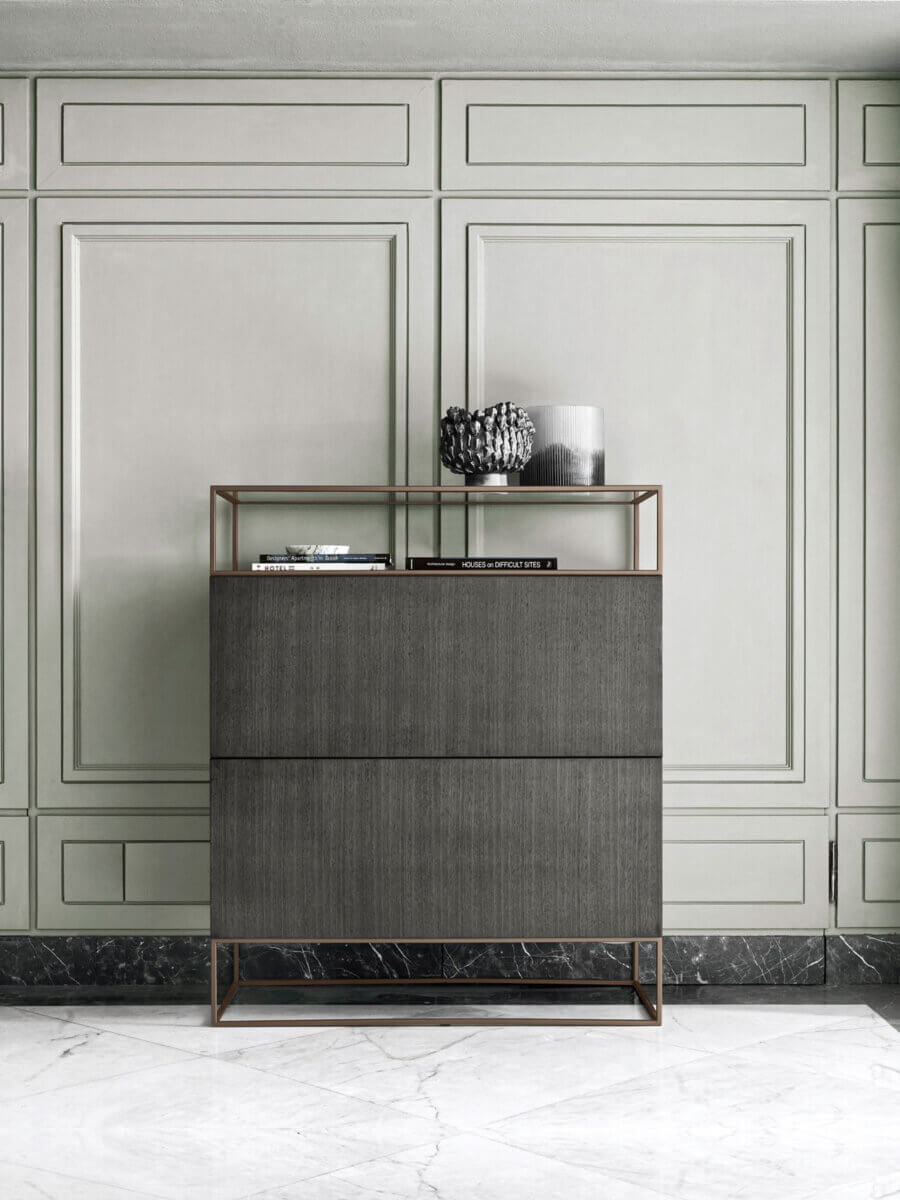 Unit es un sistema de módulos de almacenamiento cuya peculiaridad estética radica en la alternancia de volúmenes y vacíos. Una arquitectura práctica, lineal y elegante en diversas variantes —desde los clásicos aparadores alto y bajo a los muebles de almacenamiento con vitrina acristalada, hasta llegar a la banqueta. Son muchos los acabados disponibles para la encimera, entre los que destacan el mármol, el cuero y el cristal.