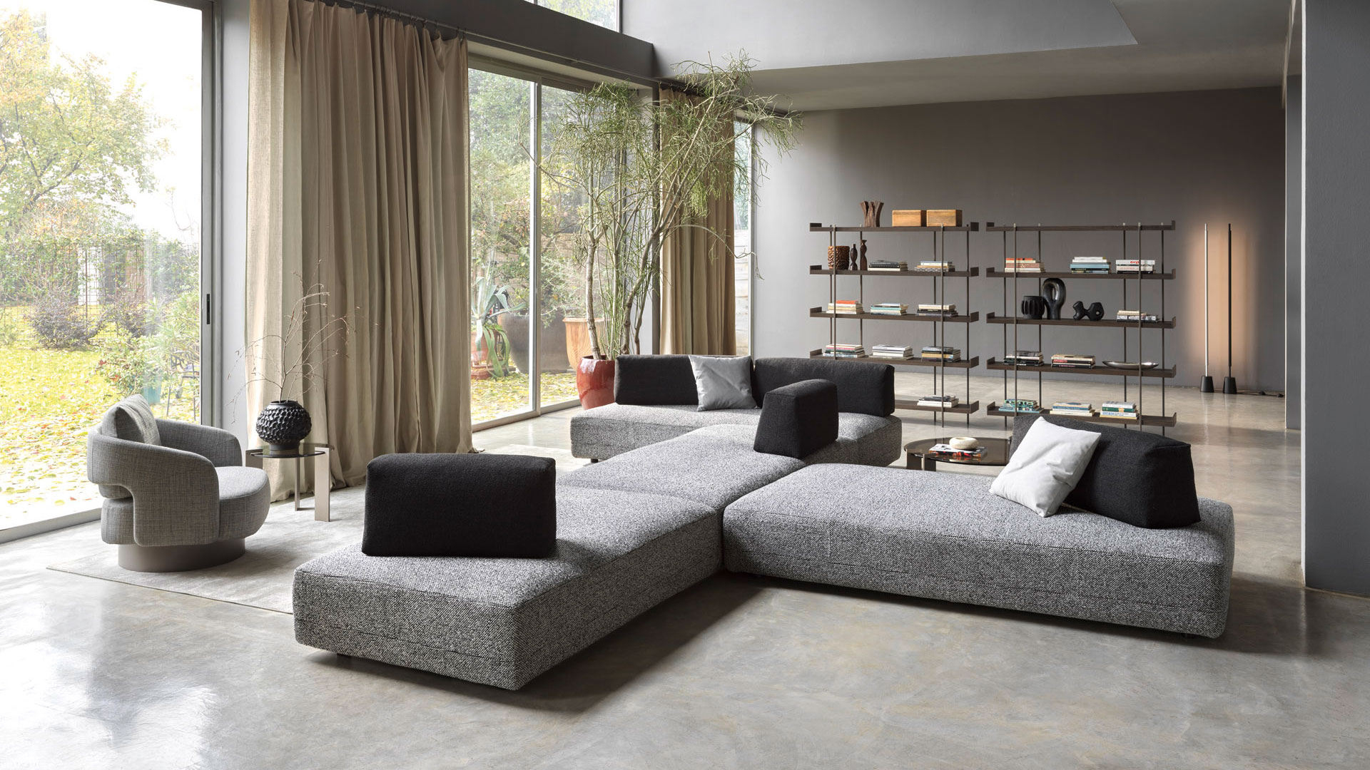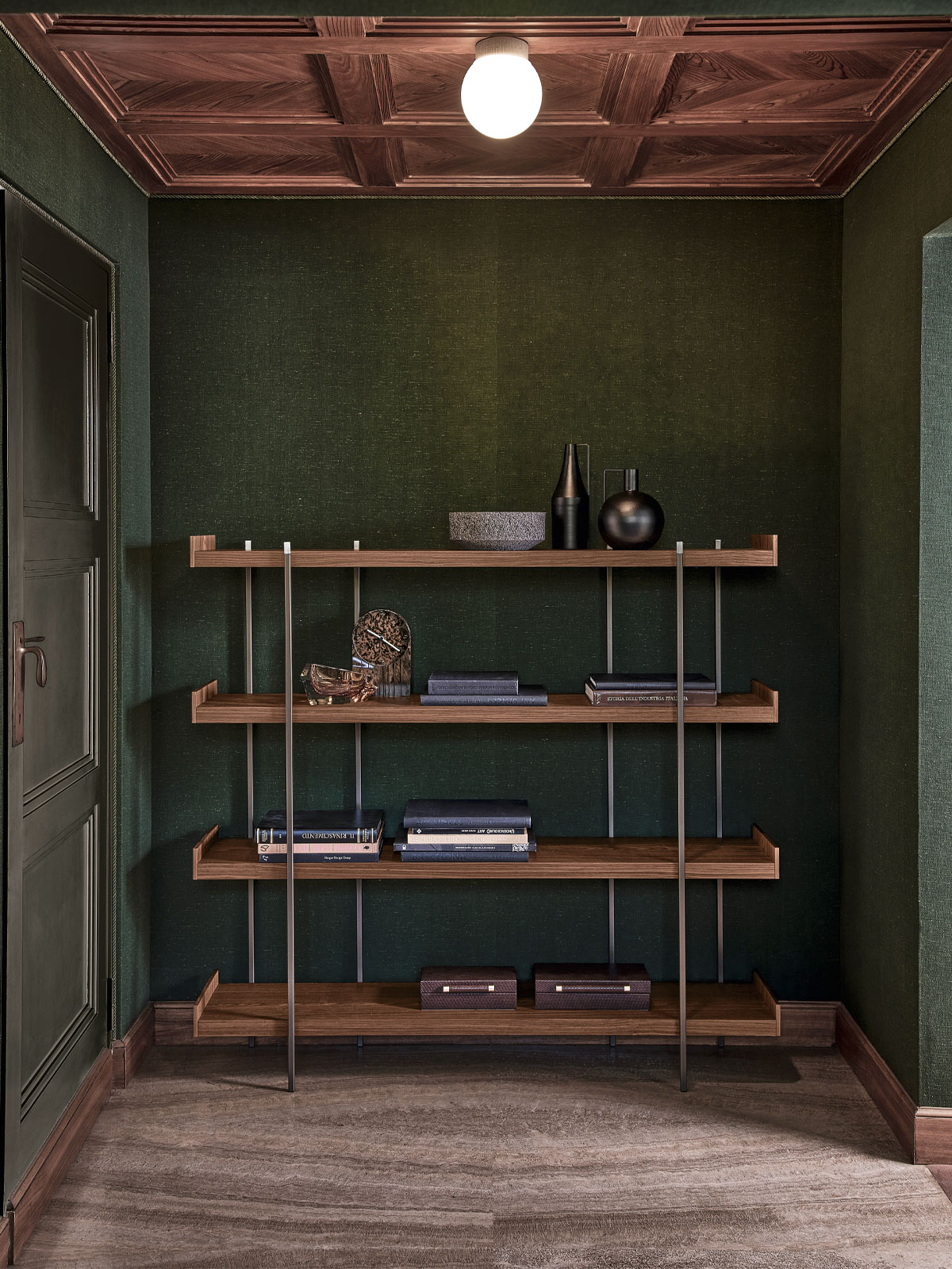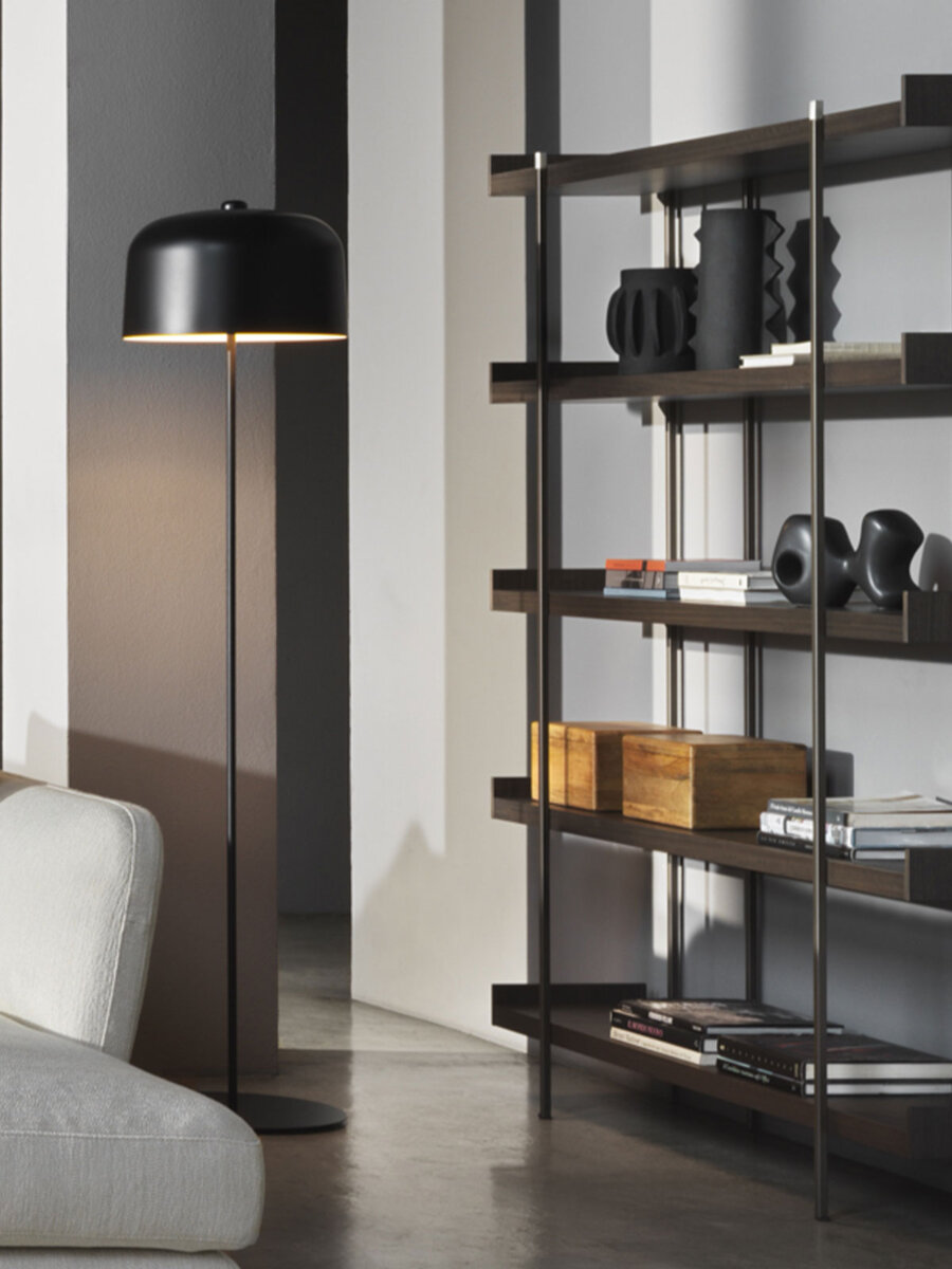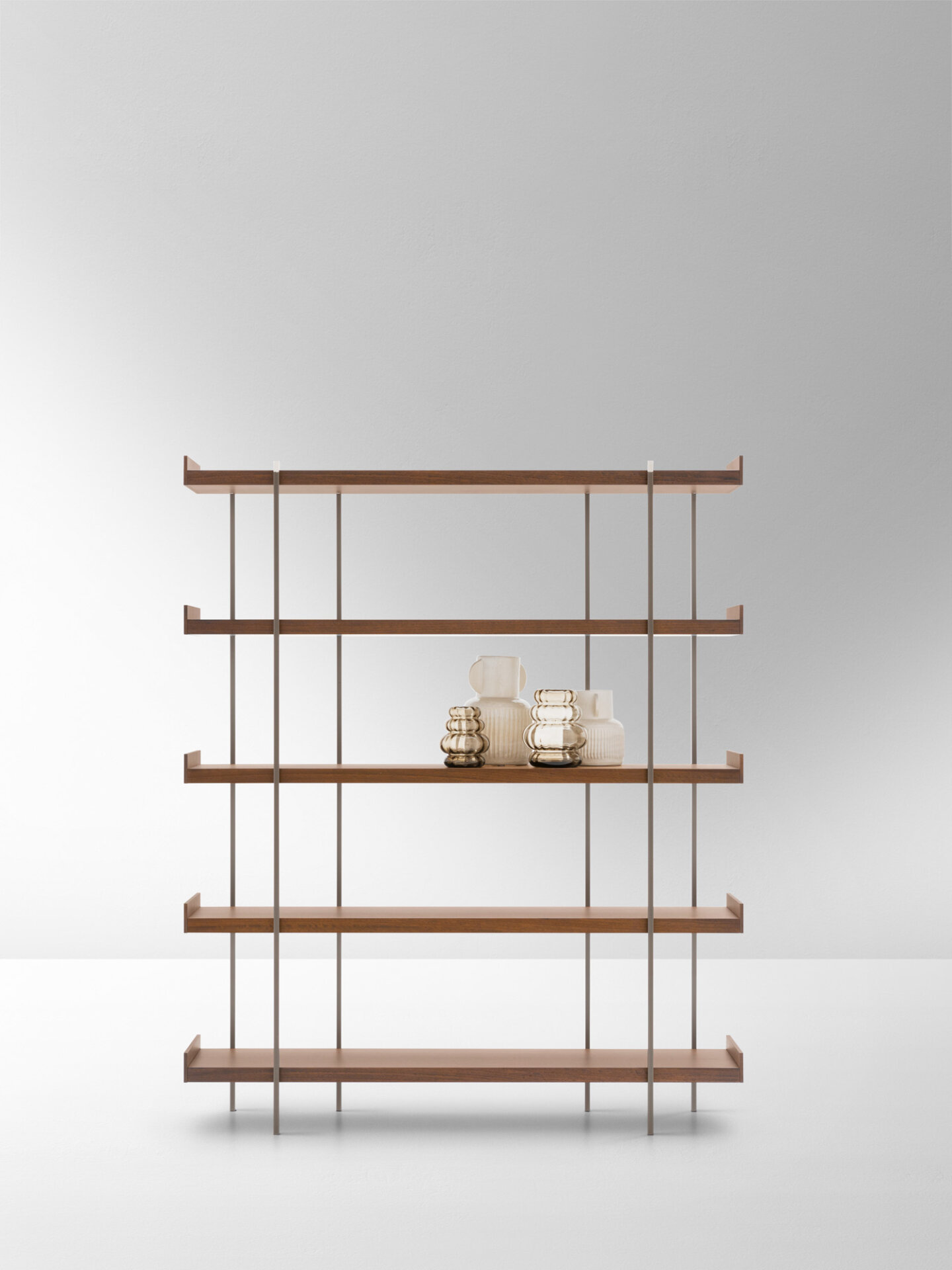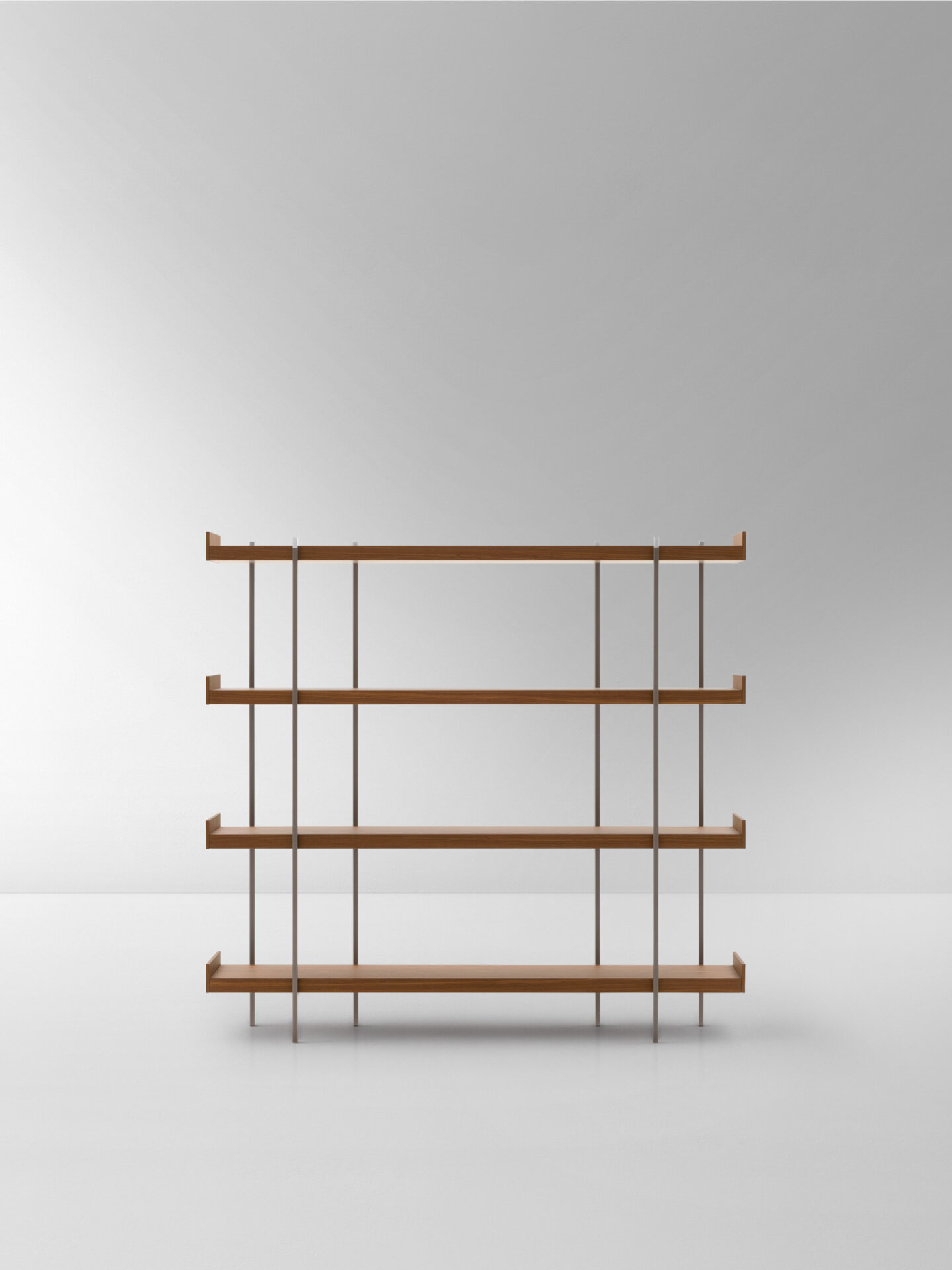 La rica colección Unit también incluye la librería. Unos elementos de metal sumamente finos sostienen baldas de madera, creando un cruce de líneas con efecto gráfico que confiere un toque de ligereza al interior del salón moderno. Diseñada como librería de libre colocación, Unit también se puede arrimar a una pared sin perder su carácter distintivo.