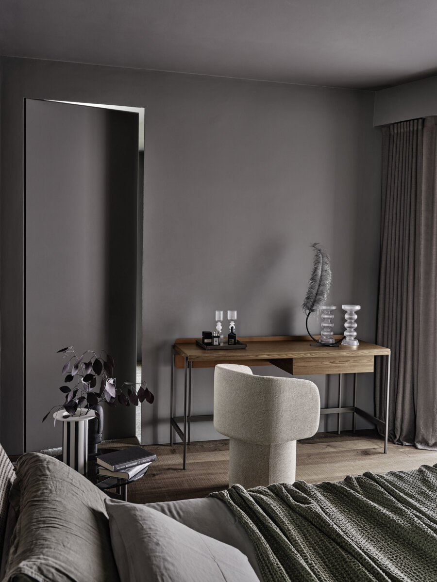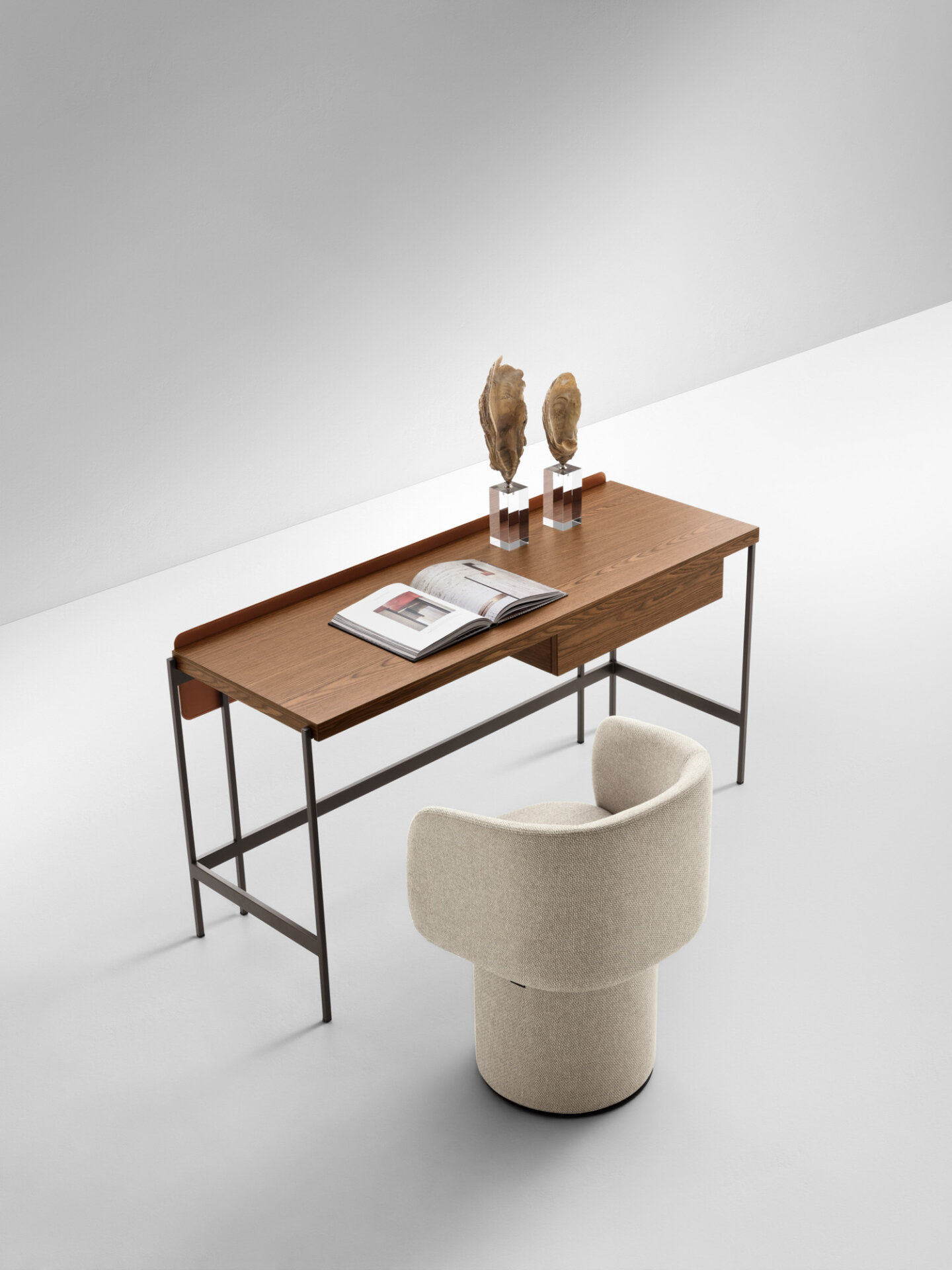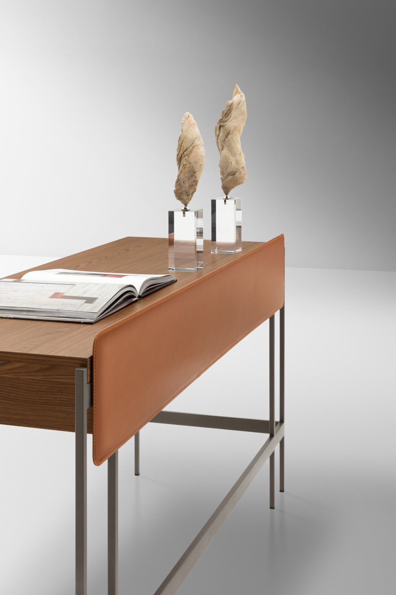 Unit secrétaire interpreta la limpieza estética de la colección Unit en forma de escritorio. Una estructura delgada sostiene un sobre de madera, un cajón y un elegante tablero revestido de cuero, dando vida a un complemento imprescindible en el salón moderno, ideal tanto para los momentos de estudio y lectura como para el trabajo inteligente.