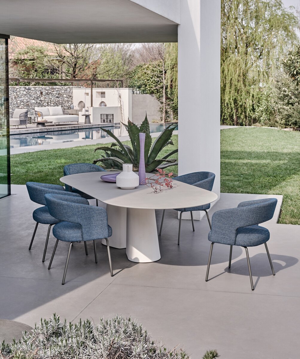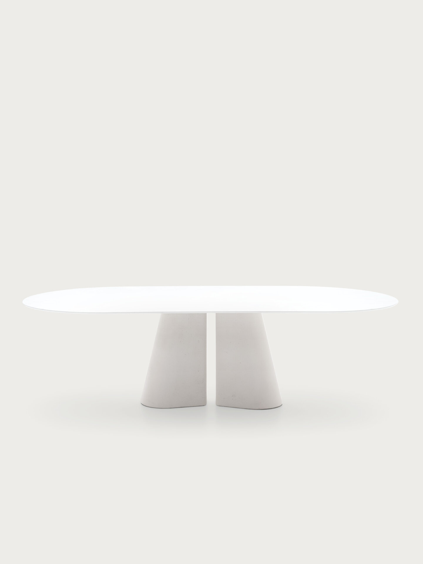 Un sobre esencial descansa sobre una base escultórica formada por dos columnas inspiradas en las ágoras griegas, metáfora de las interacciones que surgen de forma natural en torno a la mesa. Pillar es una mesa diseñada por Daniele Lo Scalzo Moscheri para los momentos de convivencia, por lo que también resulta ideal en su versión de exteriores.