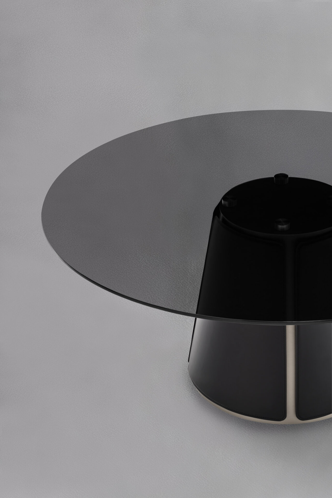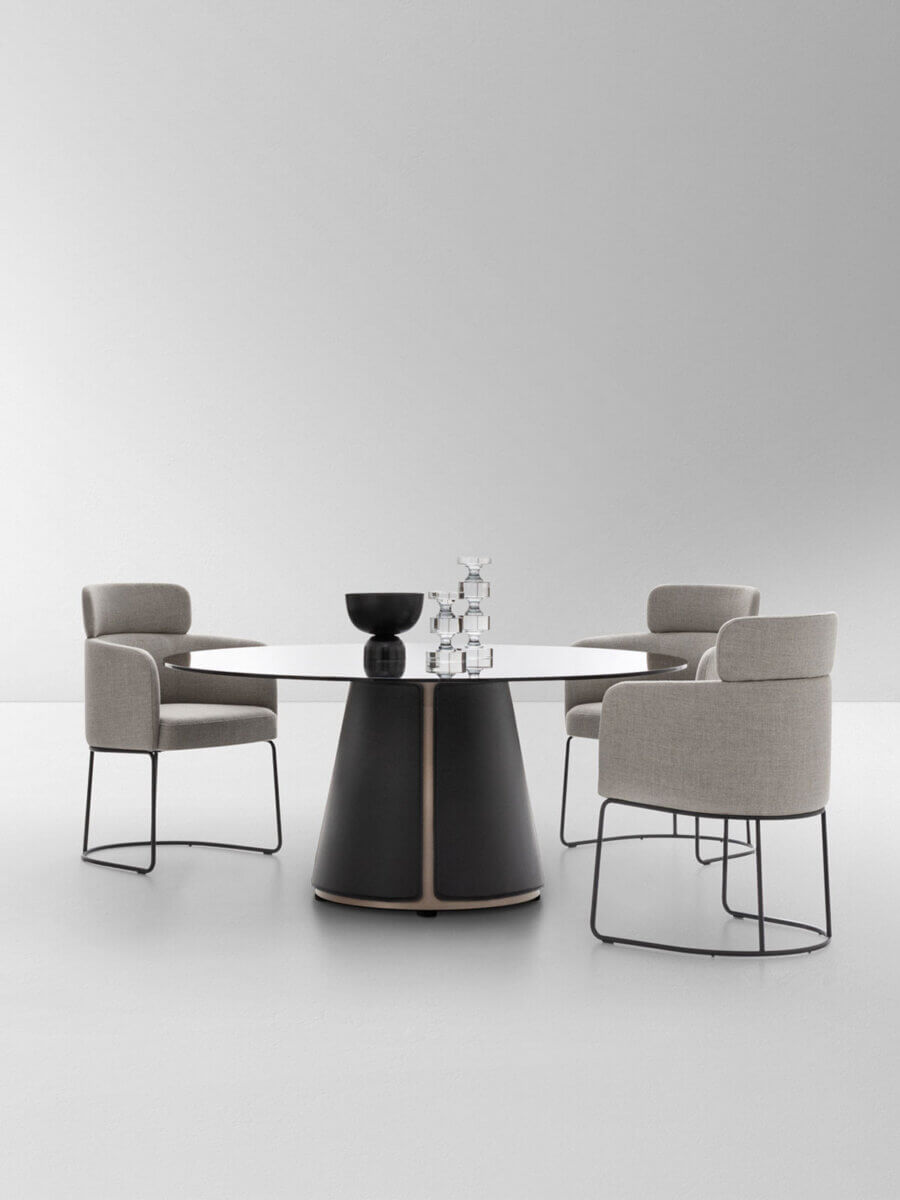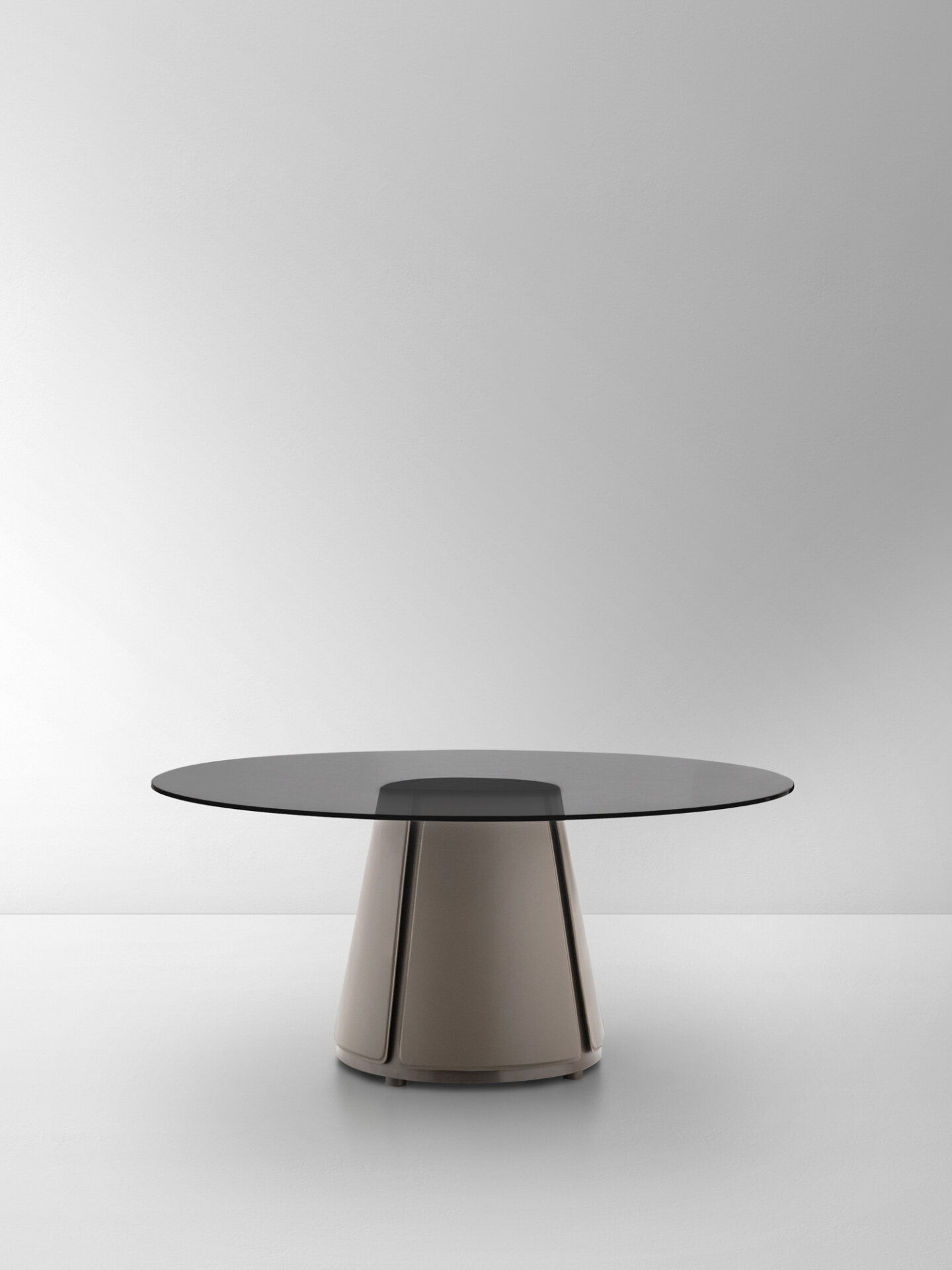 La belleza del círculo reside en su trazado perfecto, y es precisamente la forma circular en la que se inspira Claire, una mesa de gran coherencia formal que perfila un espacio ordenado, visualmente relajante, pero sofisticado al mismo tiempo. La base de formas redondeadas estátapizada con cuero de calidad y es visible a través del sobre de cristal fumé, bronceado o transparente.