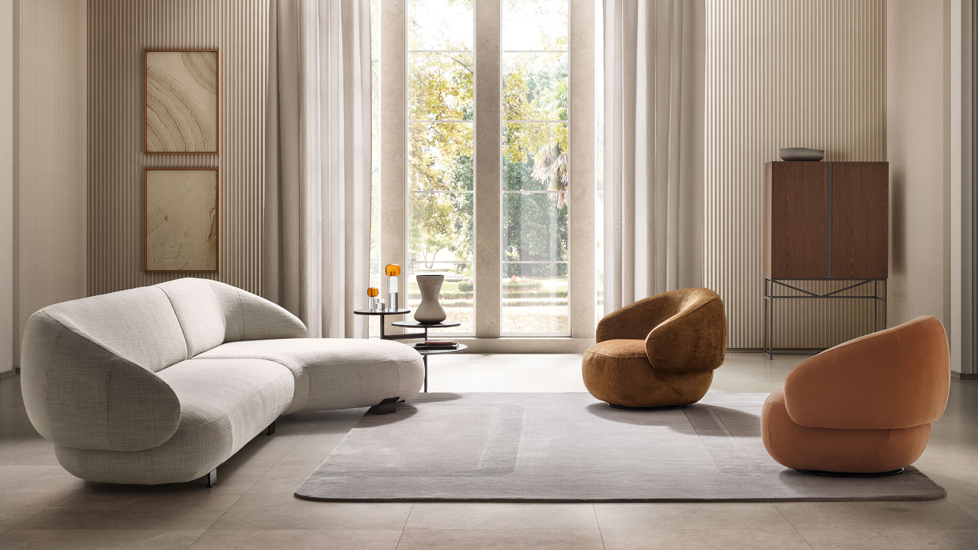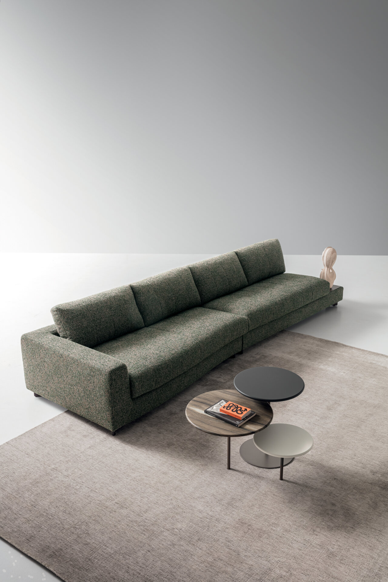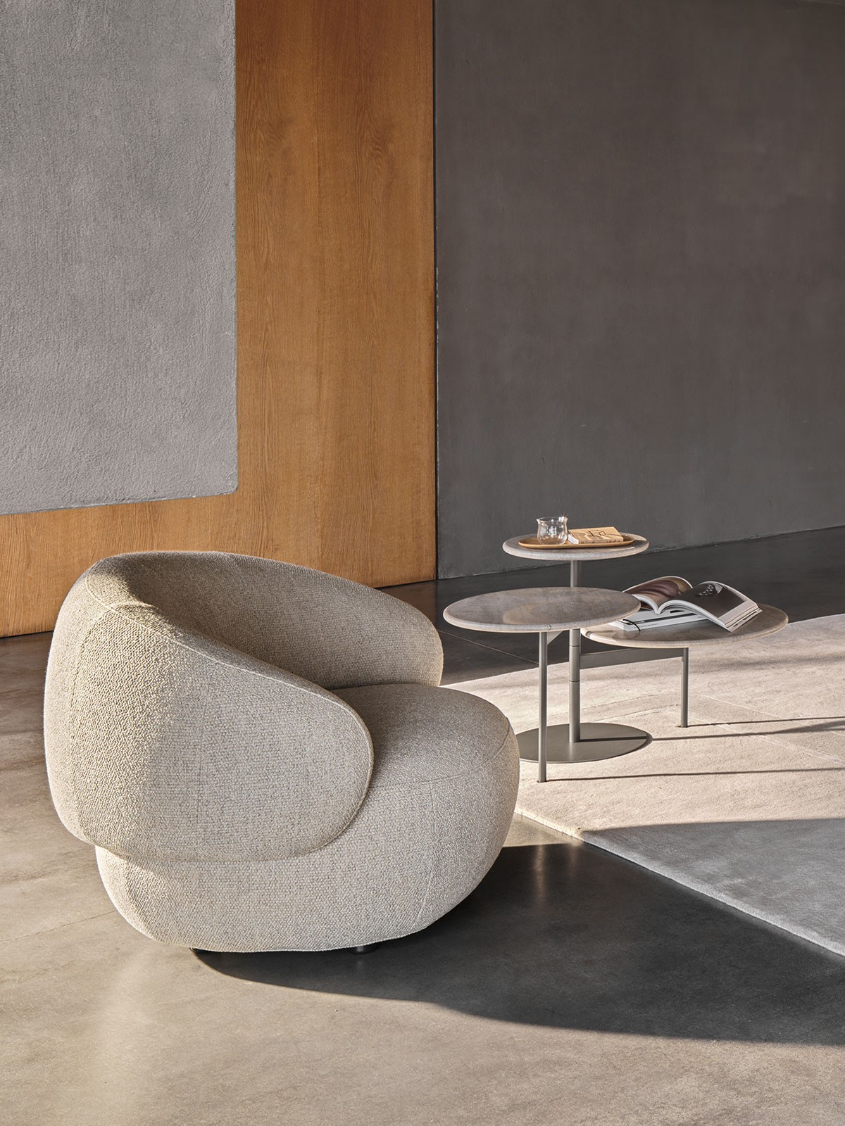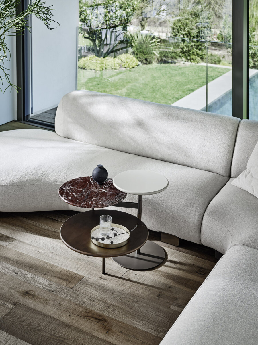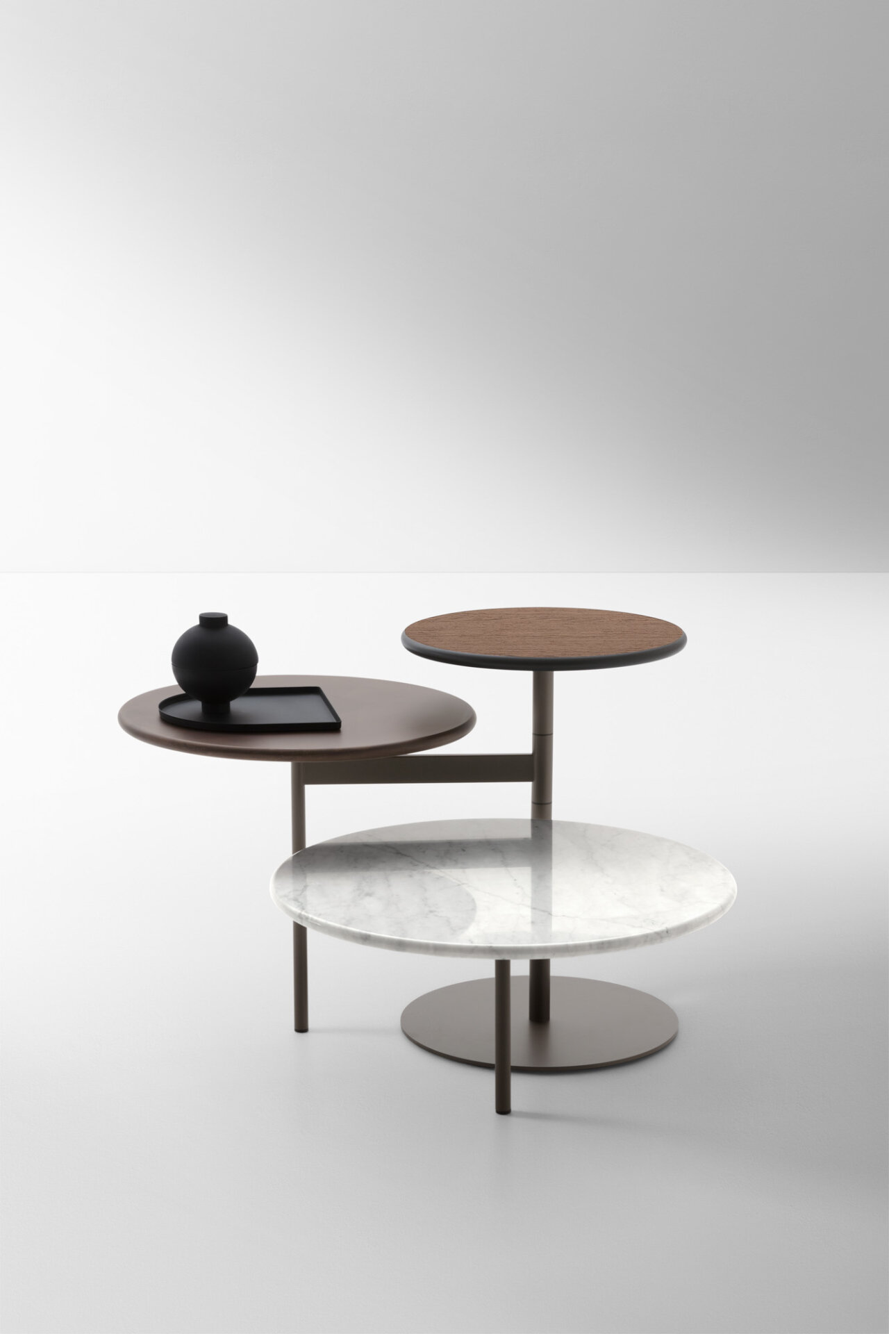 La mesa de centro Tris se compone de tres sobres redondos situados a distinta altura que, gracias a un mecanismo, giran sobre sí mismos. Disponible en varias combinaciones de materiales y acabados, es capaz de personalizar el centro de la habitación o hacer destacar el mueble tapizado con el que se combina.