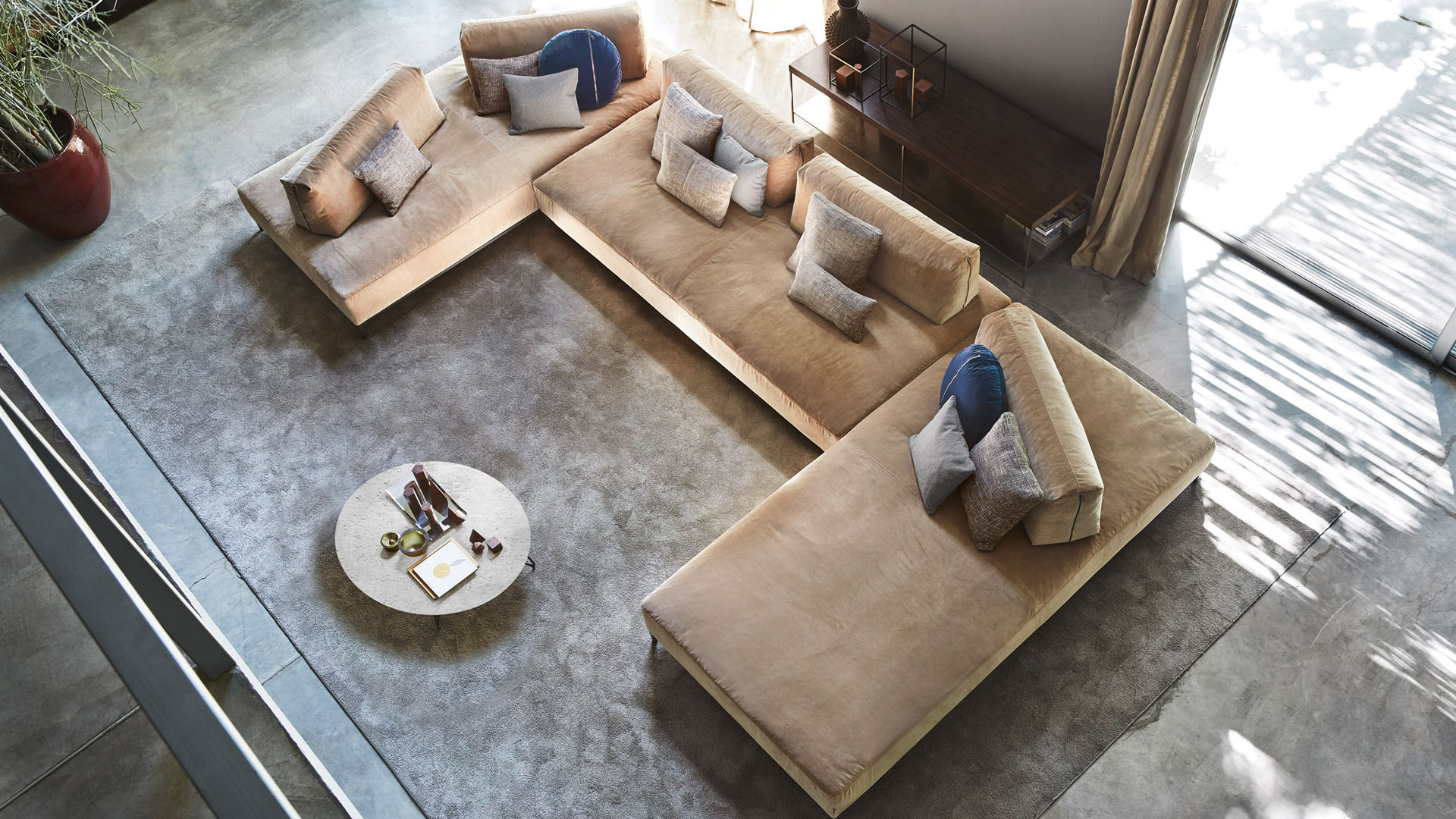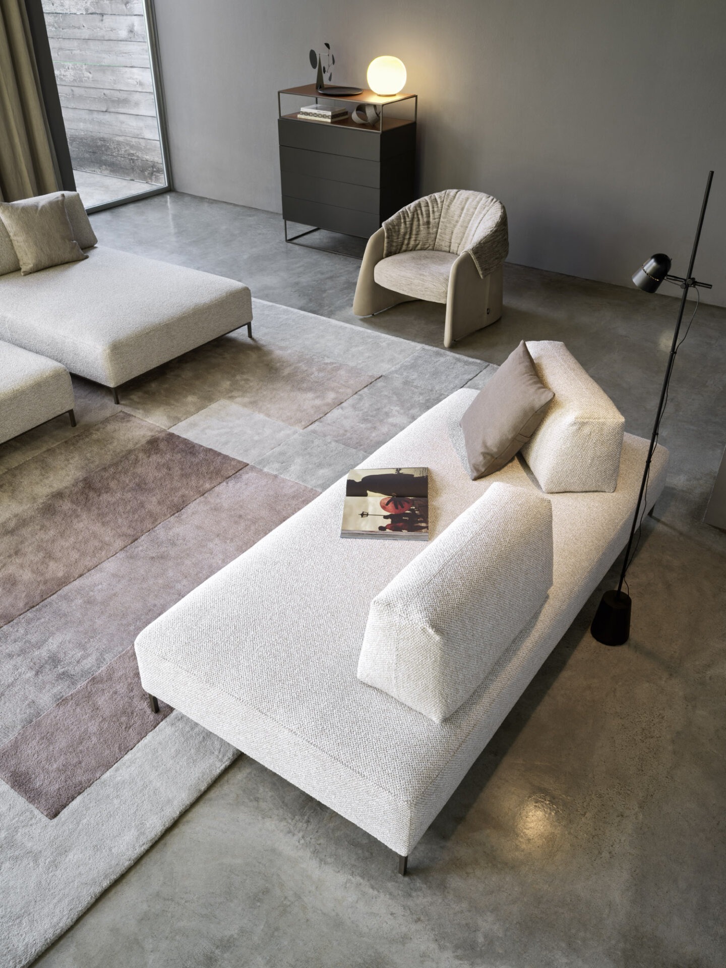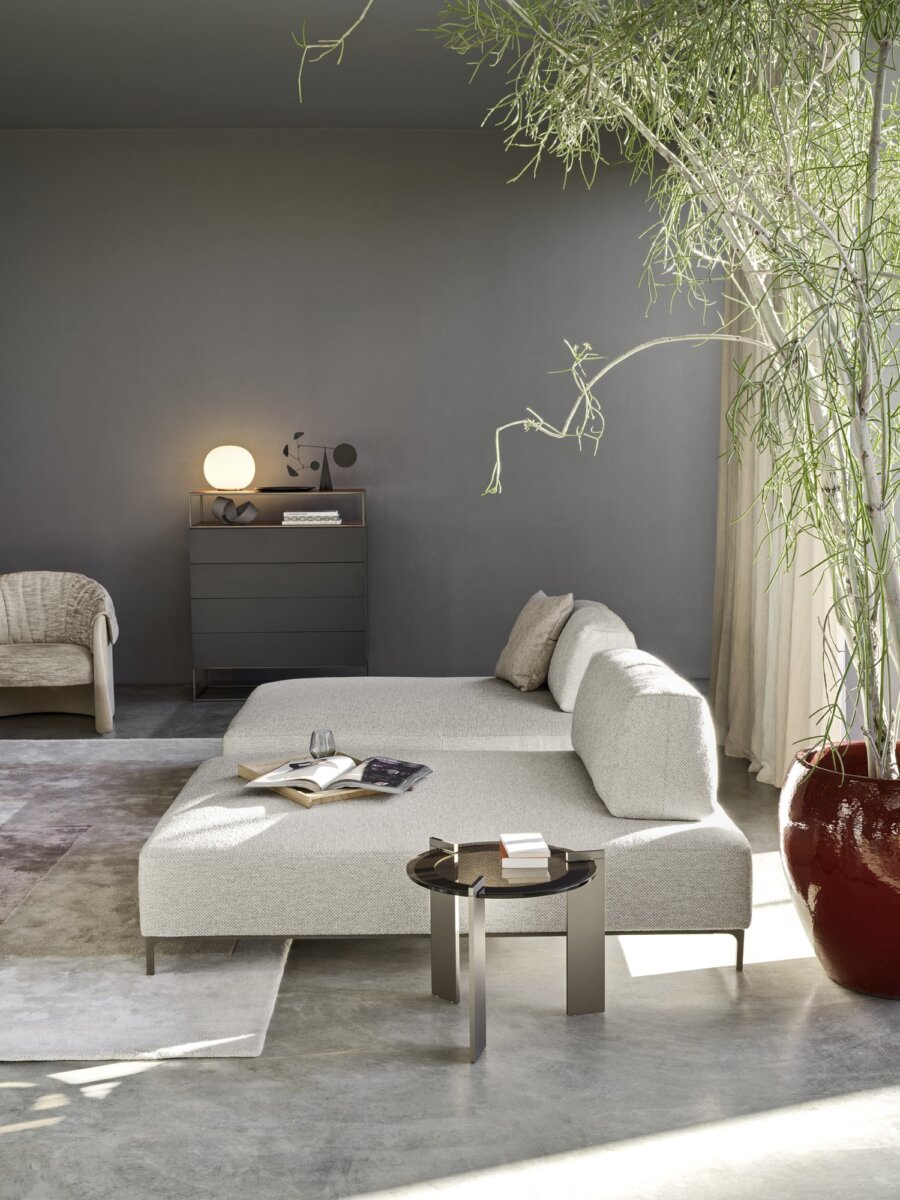 Sanders Air es una reinterpretación del sistema Sanders que, suspendido del suelo con una elegante base metálica, asume un carácter exclusivo sin renunciar a su versatilidad. El sistema se basa en dos elementos, asiento y respaldo, pudiendo este último colocarse libremente para crear la composición deseada, incluso a dos caras.