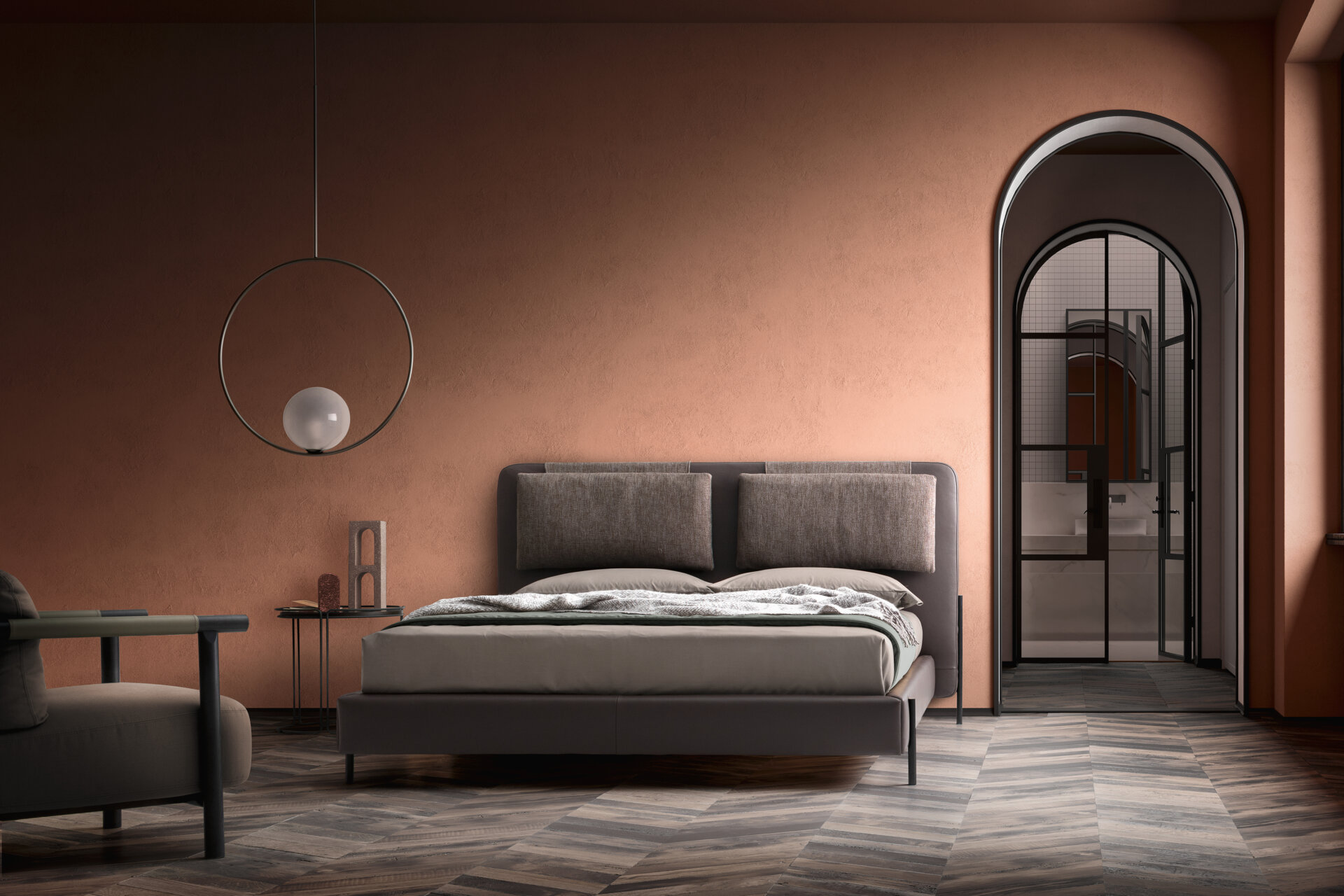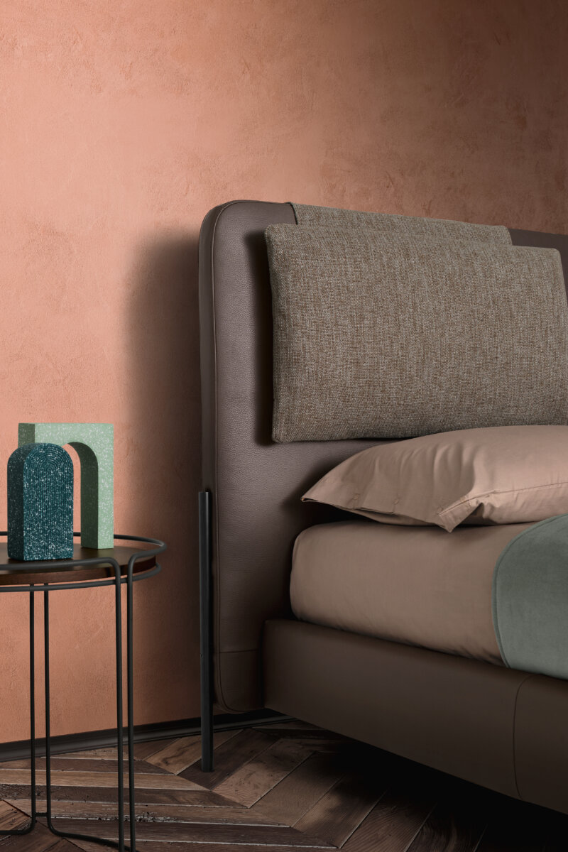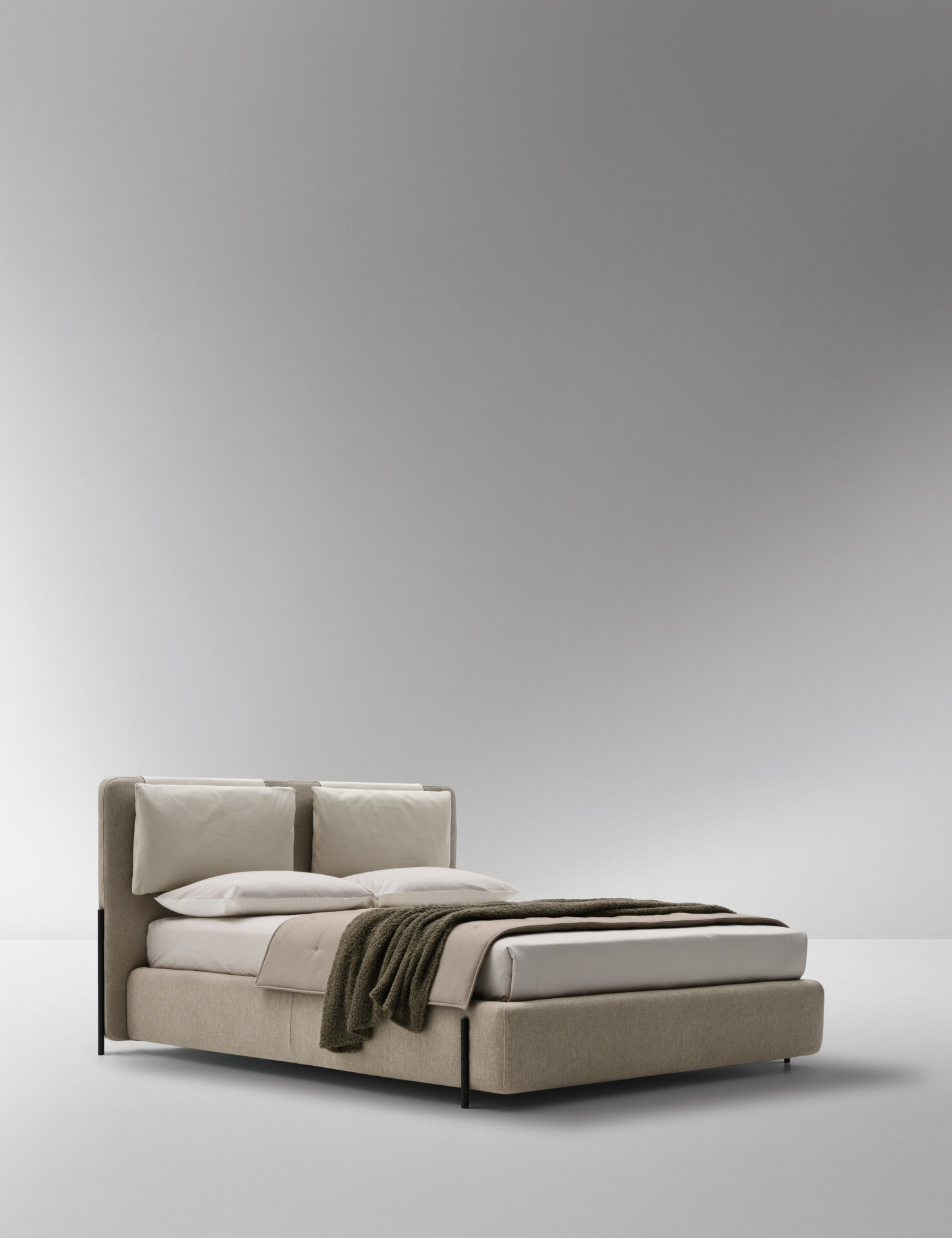 Alar est un projet minimaliste et harmonieux, caractérisé par une profondeur réduite grâce au dossier fin accueillant deux coussins optionnels pour offrir un plus grand confort. Le lit est complété par des pieds en forme de cylindres fins, bien visibles et faisant pleinement partie du design de la structure. Le cadre de lit d’Alar peut être choisi en deux hauteurs, pour mettre en valeur sa solidité ou sa légèreté.