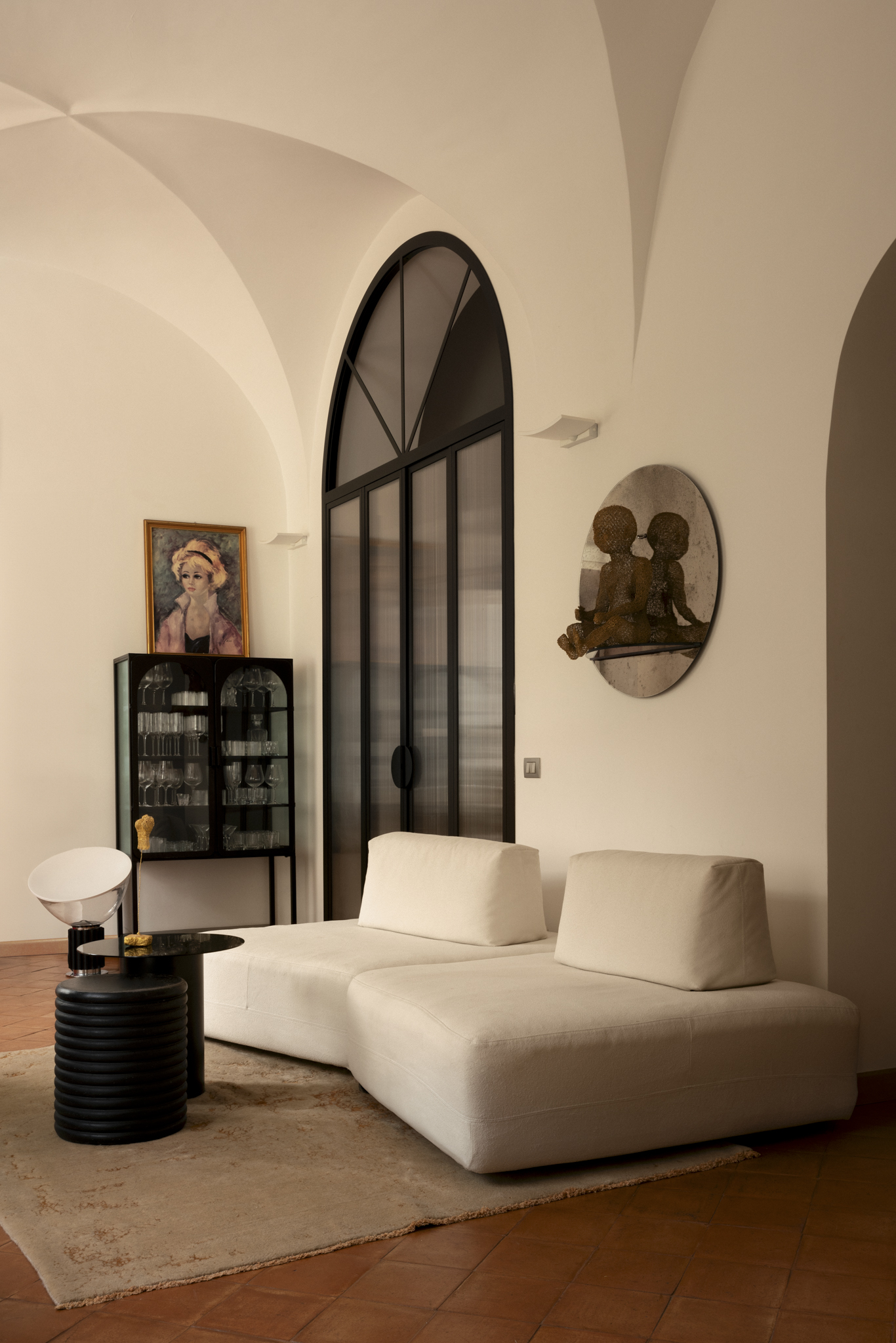Fulcro della casa è la zona living, pensata come ambiente di relazione e convivialità. Protagonista è il divano Sanders di Ditre Italia, sistema modulare disegnato da Stefano Spessotto & Lorella Agnoletto, che unisce libertà compositiva, eleganza sartoriale e massimo comfort. Le sue proporzioni generose e il design misurato si integrano con naturalezza nell’architettura storica, contribuendo a creare un’atmosfera accogliente e sofisticata.