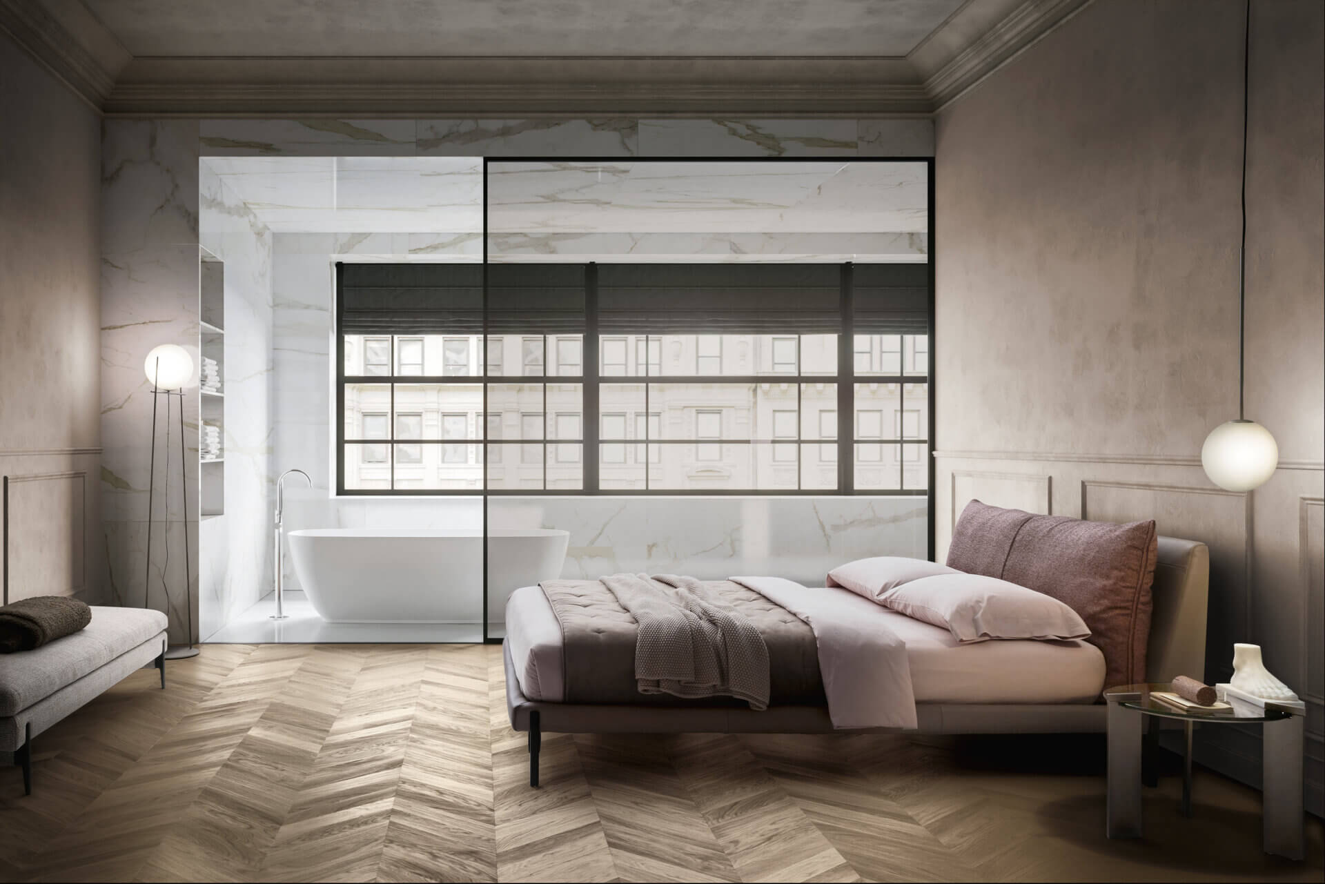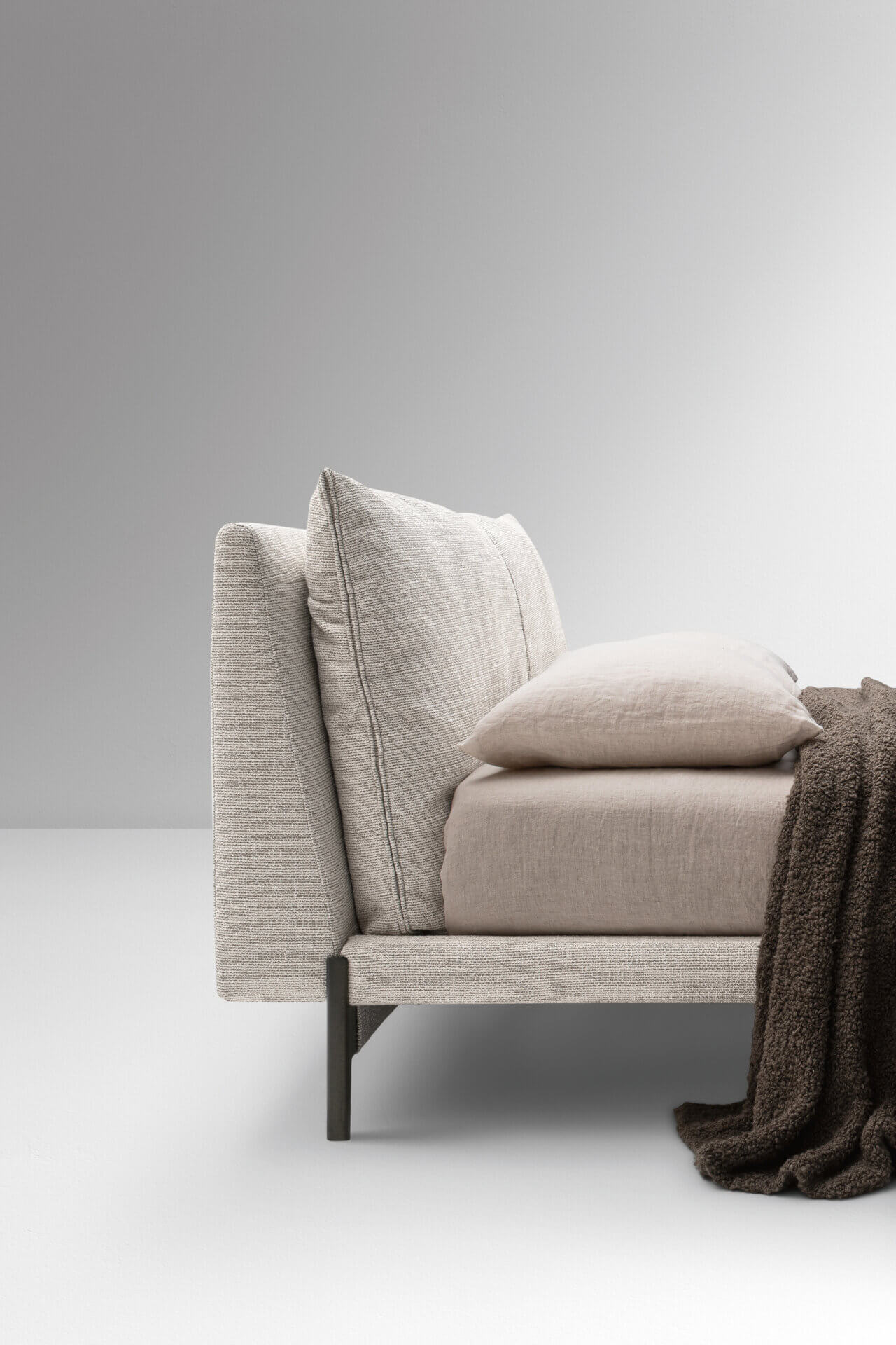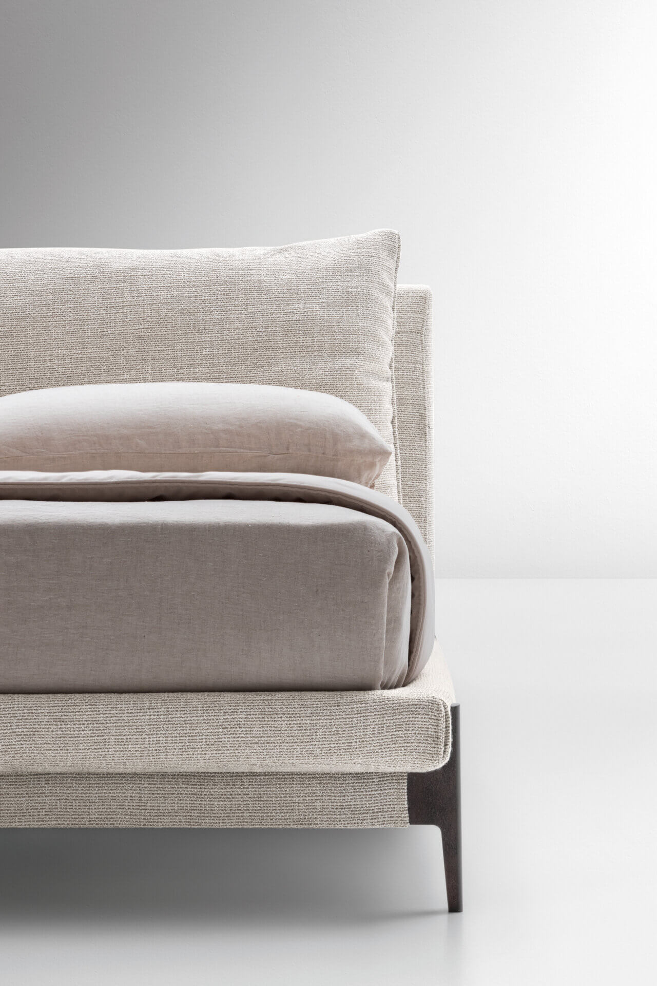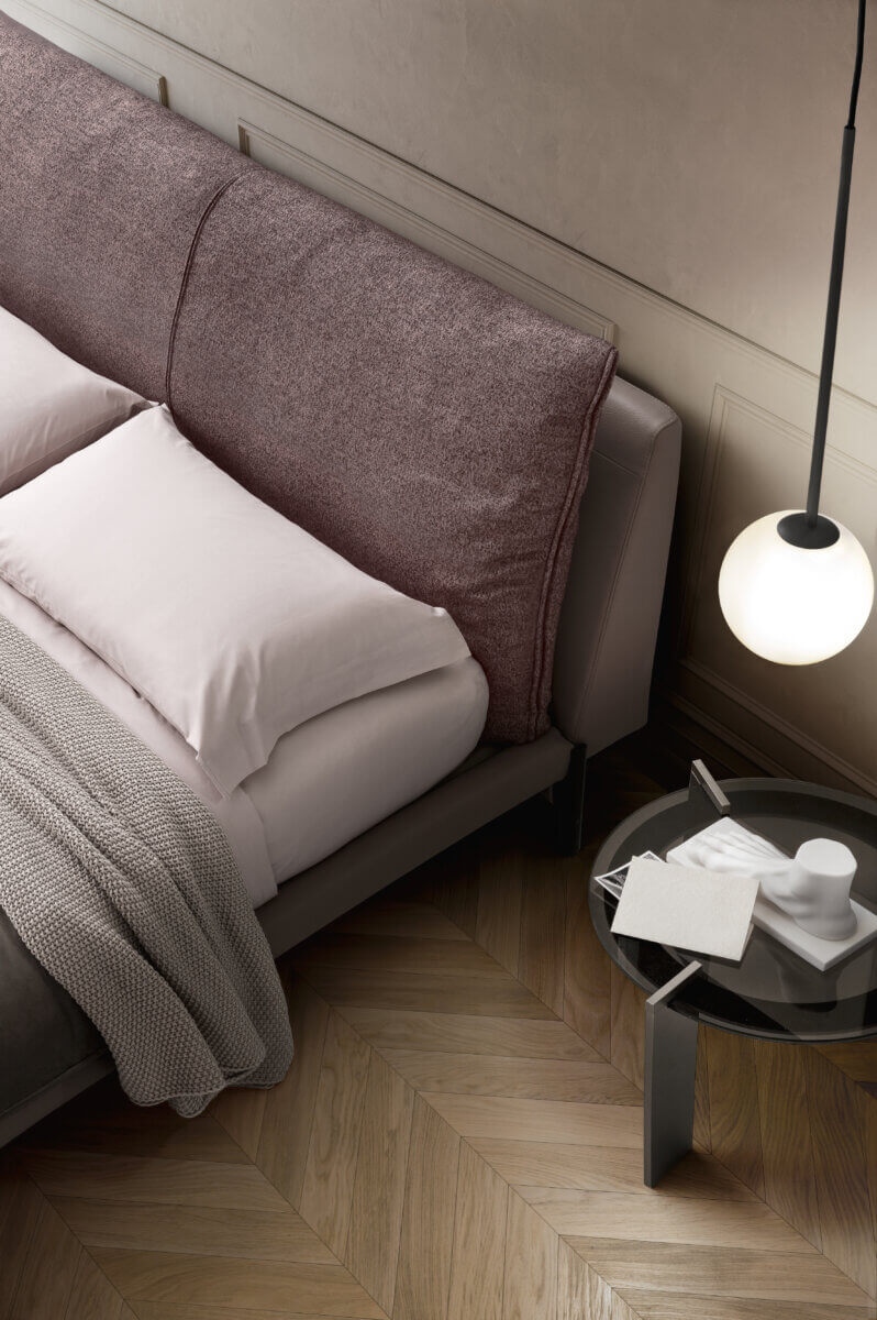 Кровать Kim, характеризующаяся деталями и материальными персонализациями, черпает вдохновение в идее алькова, то есть той зоны спальни, в которой исторически размещалась кровать, дополненная элементами интерьера и текстильными деталями , свойственными для создания уютной и изысканной обстановки. Характеризуется сбалансированной структурой за счет геометрического каркаса и задней спинки, сочетающихся с мягкой подушкой в изголовье. Ножка предлагается в двух вариантах, дизайн которых вдохновлен гетрами на обувь конца девятнадцатого века.