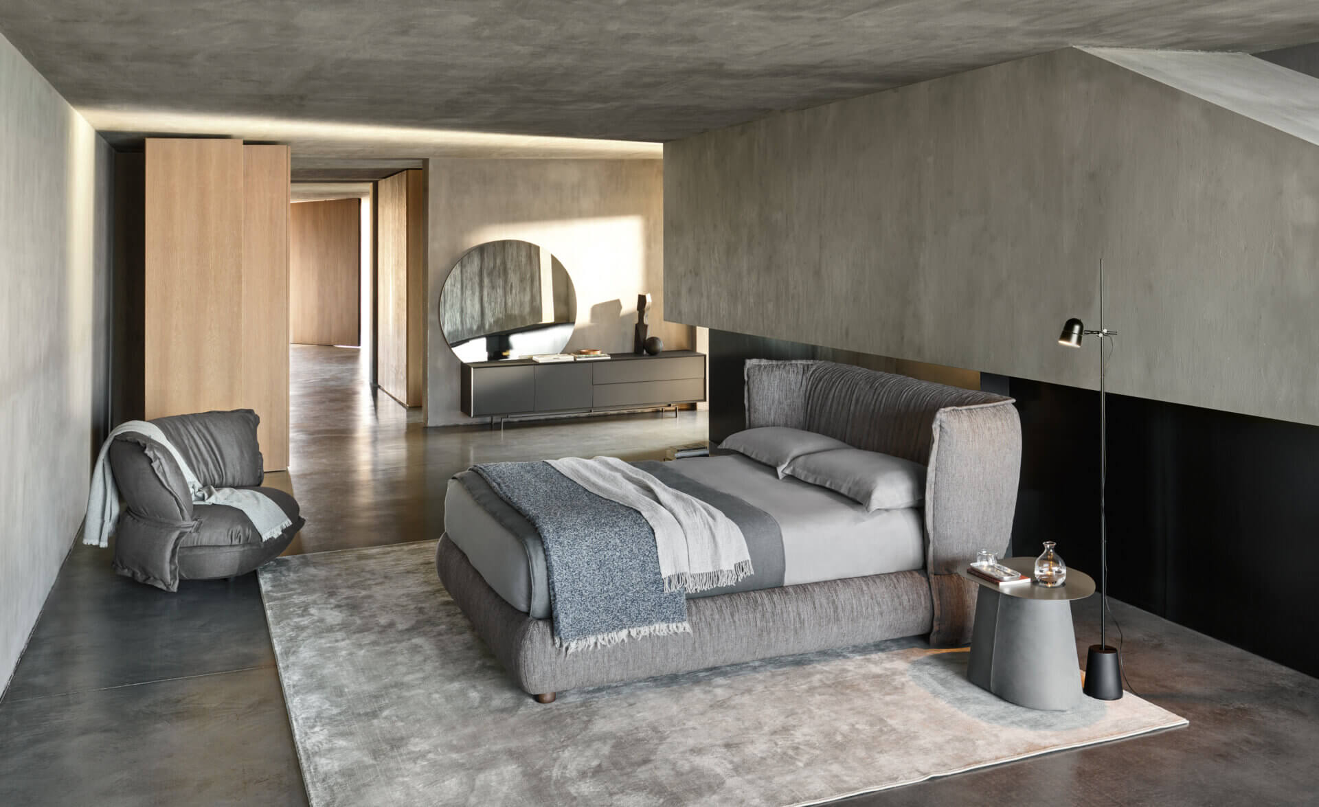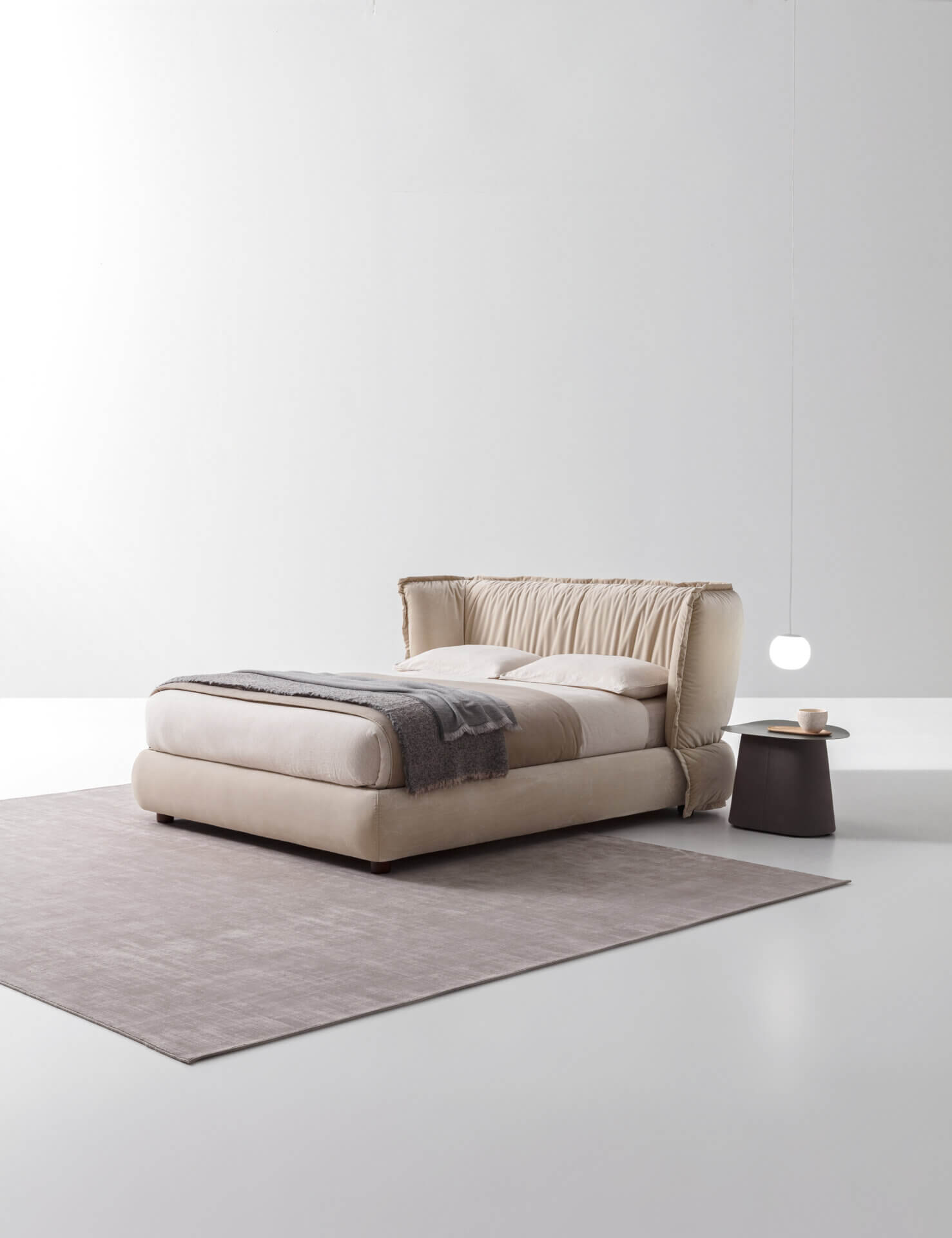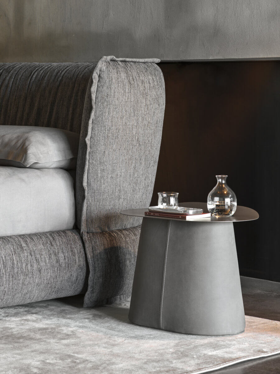 这款床带有宽大的床头板,再现柔软枕头的创意、形状和布艺质地。 Puppet项目还包括一个床头柜,作为一对家具诞生,当它们并列放置时,凸显出其体积的对比。