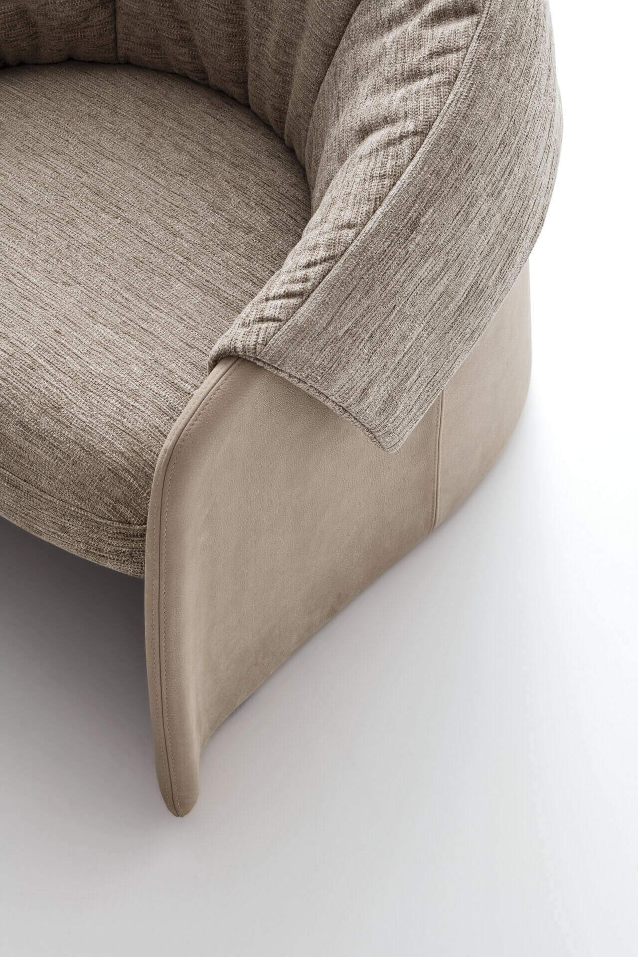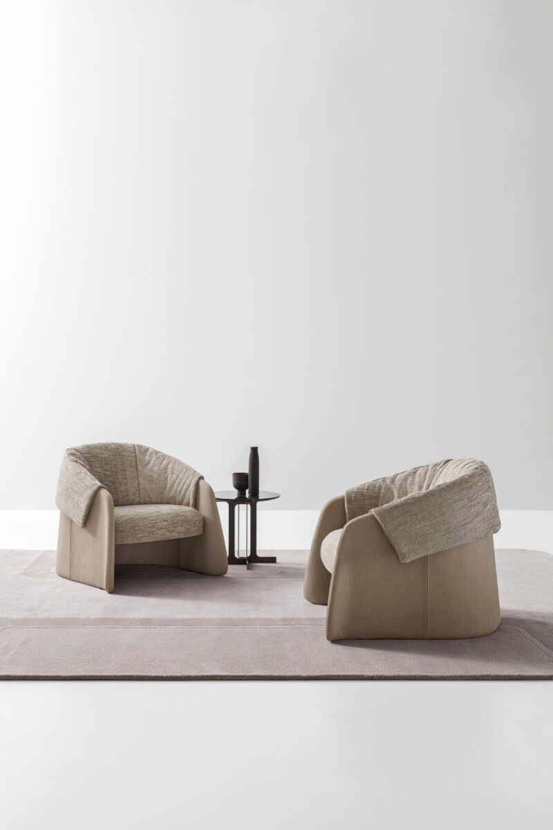 不同材料之间令人愉悦且和谐的重叠令人联想到衣服翻领的独特形状。Blazer是一款优雅的小扶手椅,尺寸紧凑、比例均衡,有多种软皮和布艺可选,进行覆面定制。