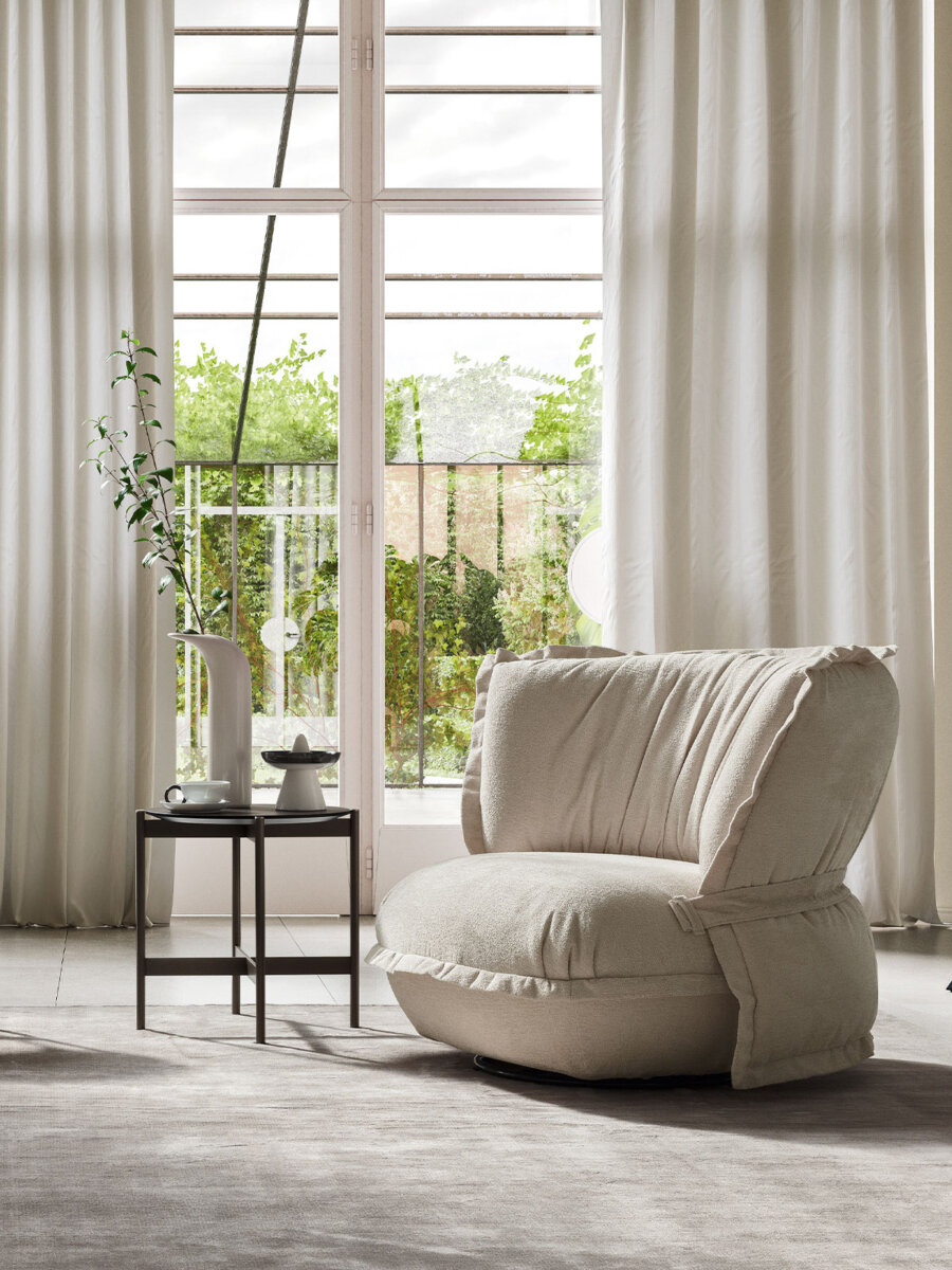Puppet的诞生源于一种普遍的行为,即在把用过的靠垫恢复形状的动作。这款扶手椅的主角正是靠垫,它被重新诠释,如同体量夸张的靠背,环绕着圆形座椅。包括覆面,在椅背上配以宽大的饰带,也带来最大程度的舒适感。