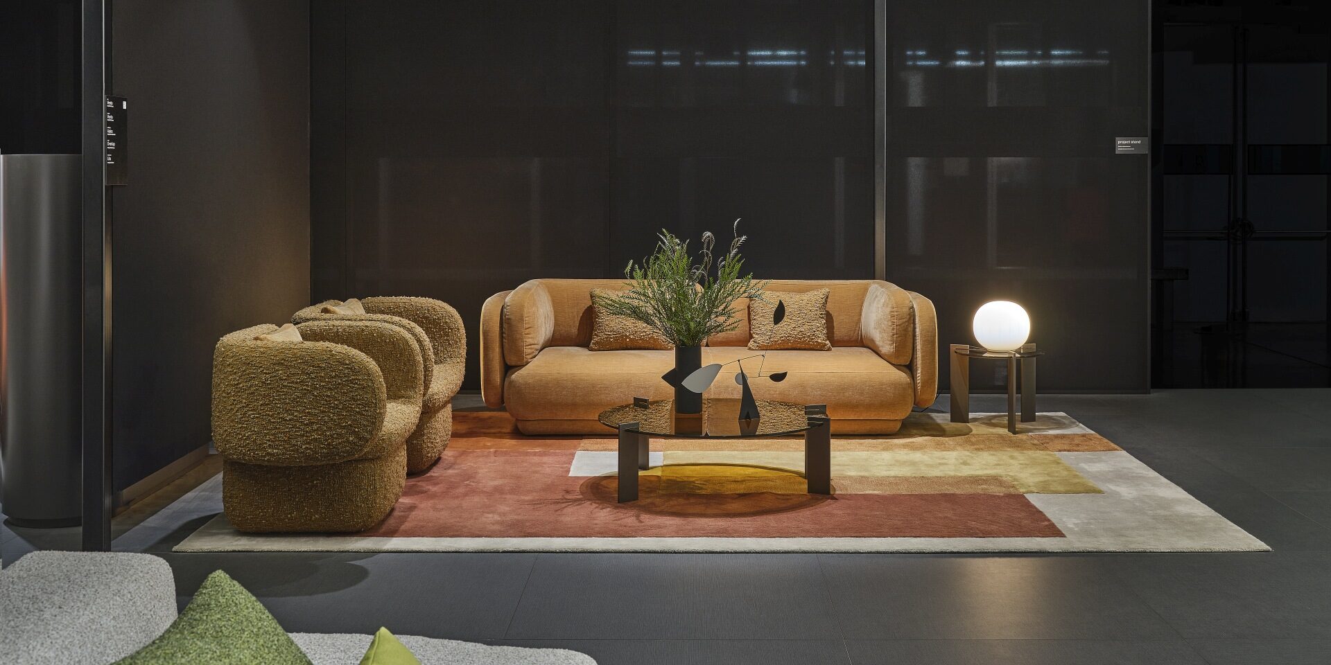 To complete the several compositions, the Arcade coffee tables; the Angle cupboard; the Helios mirror and the Hertz carpet.